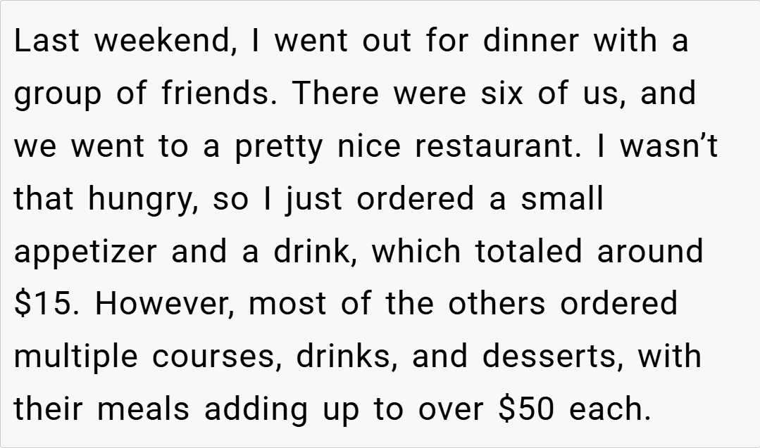 When it comes to splitting a dinner bill, fairness is key. In this case, you only ordered a small appetizer and a drink for about $15, while your friends enjoyed full meals that cost over $50 each. When the bill came, someone suggested an even split, which would have forced you to pay much more than your share. You stood your ground and paid only for what you consumed, a decision that some of your friends criticized as being “cheap.”