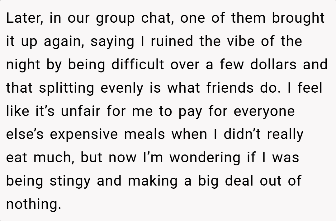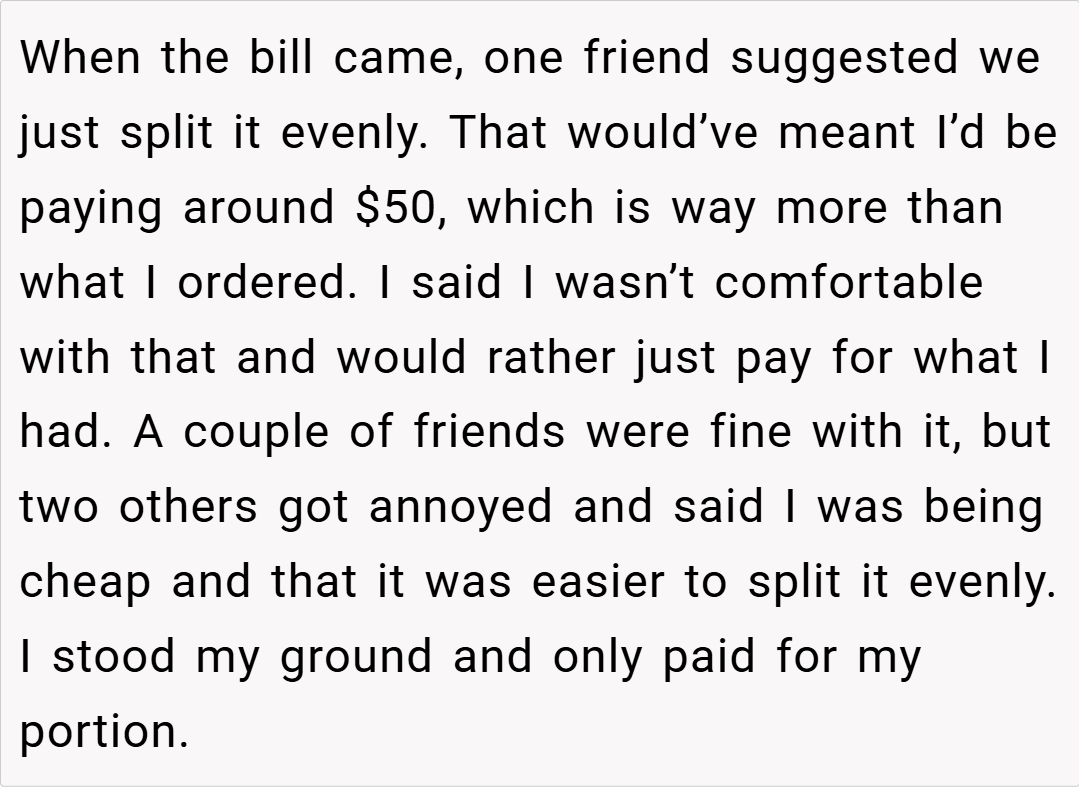 Your decision to pay only for what you ordered is both fair and reasonable. It’s important to speak up when splitting a bill evenly would result in an undue burden on some members of the group. How do you handle similar situations with friends who might have different spending habits? Have you ever faced backlash for insisting on a fair split? Share your experiences and thoughts in the comments below.