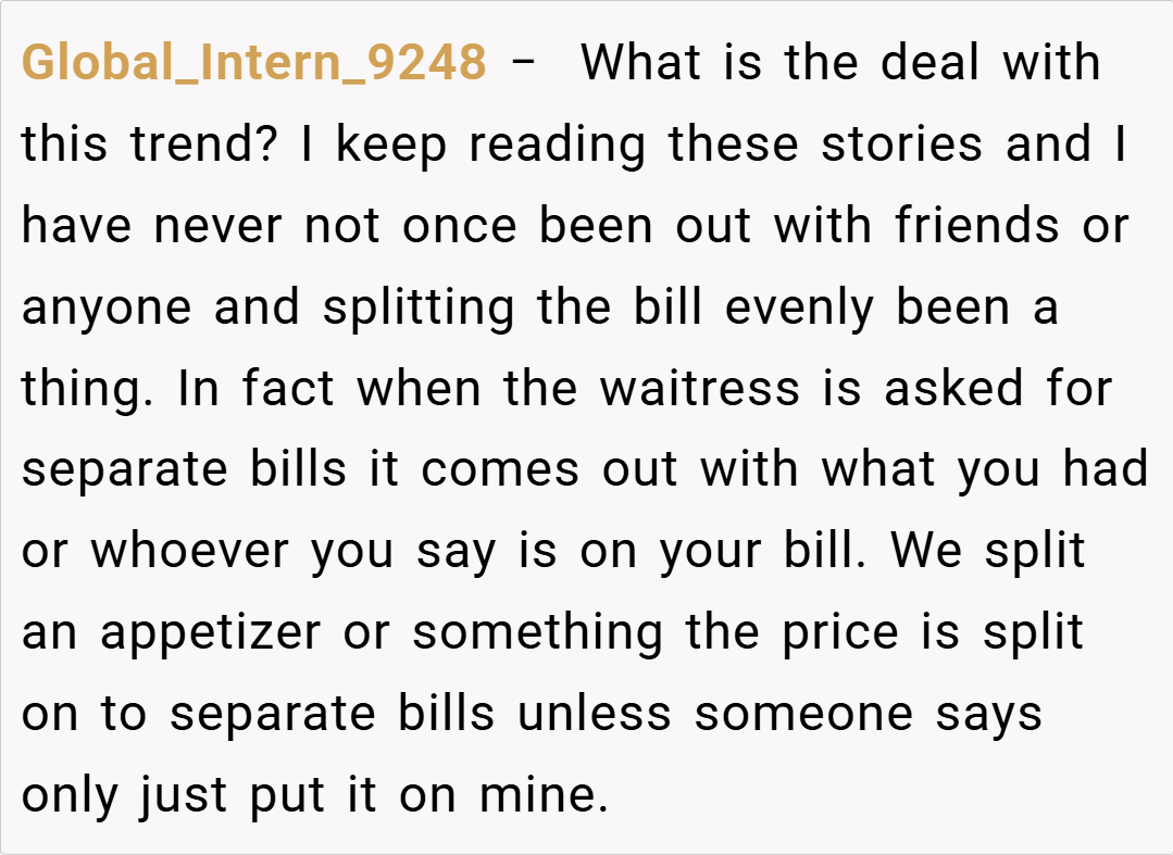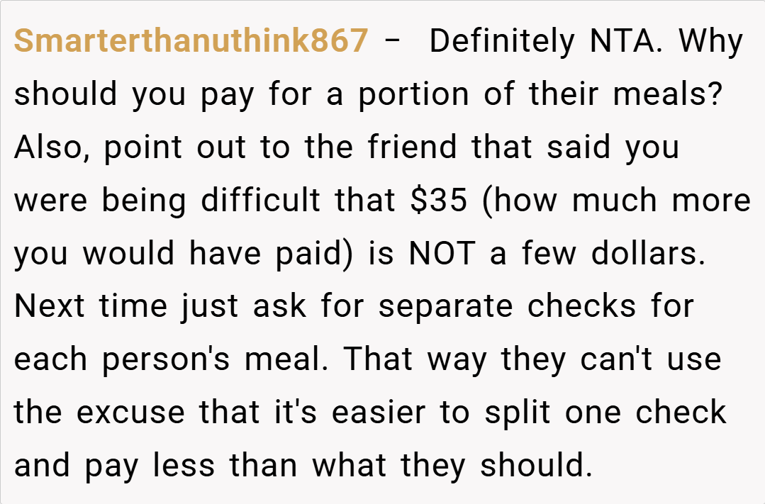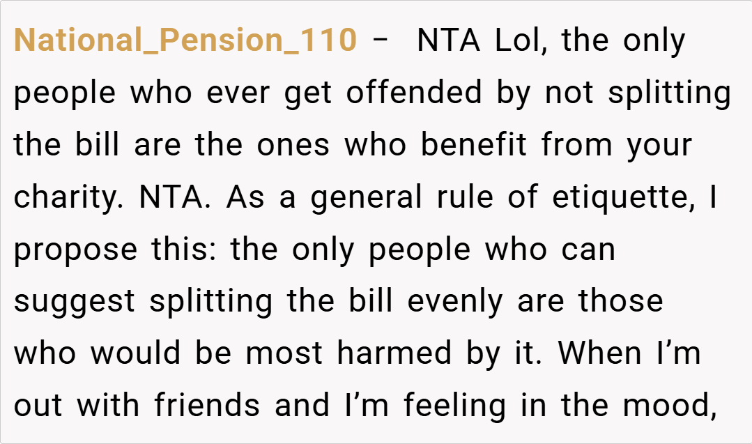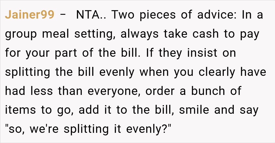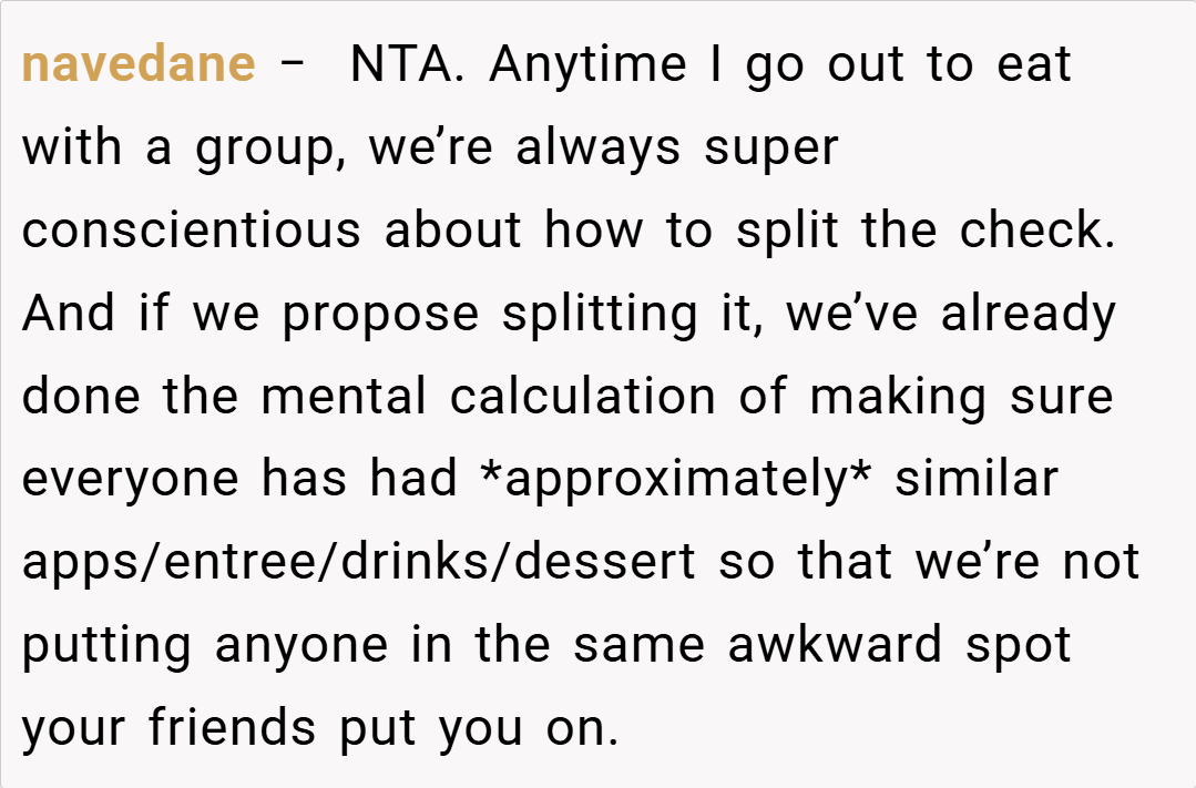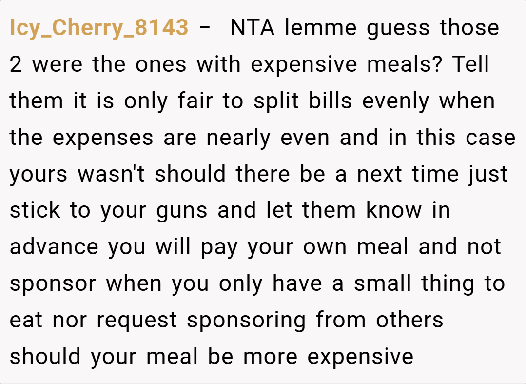The Reddit community has largely sided with you, with many commenters stating that you’re NTA (Not the Asshole) for insisting on paying only for what you ordered. They point out that if your friends want to split the bill evenly, it should only be among those whose meals are similar in price. The consensus is that fairness should prevail in such scenarios, and your friends’ insistence on an even split appears to be more about convenience than equity.