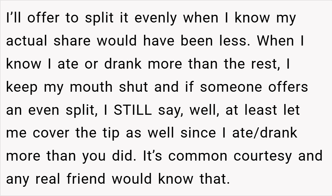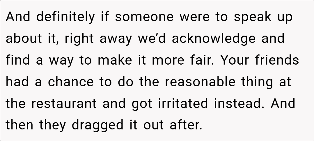 In this case, the OP’s decision to pay for only what they consumed is a rational approach to ensure financial fairness,” she adds. The emotional response from friends who were unhappy with the uneven split might stem from a reluctance to engage in what seems like a “nitpicky” calculation over a social outing. However, as Dr. Ross emphasizes, “Addressing these issues openly and respectfully can actually strengthen group dynamics in the long run.