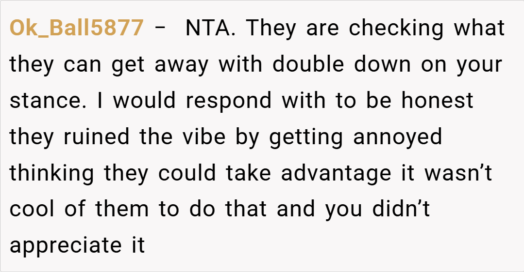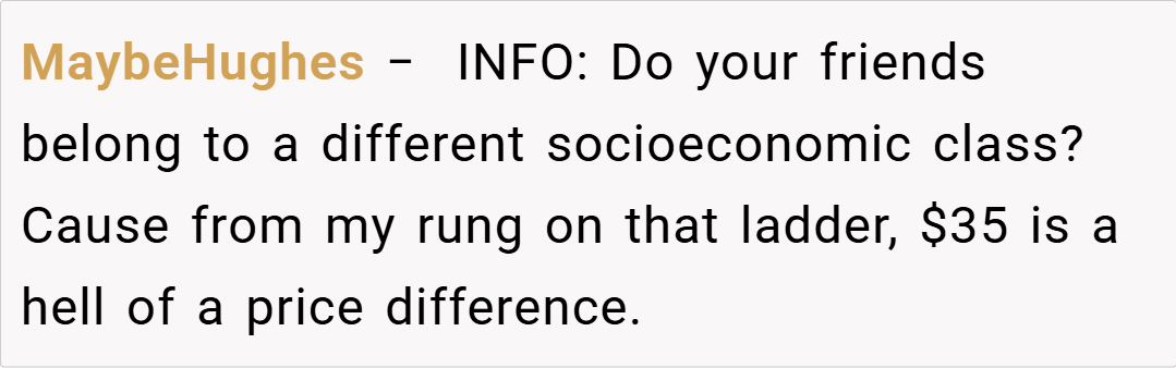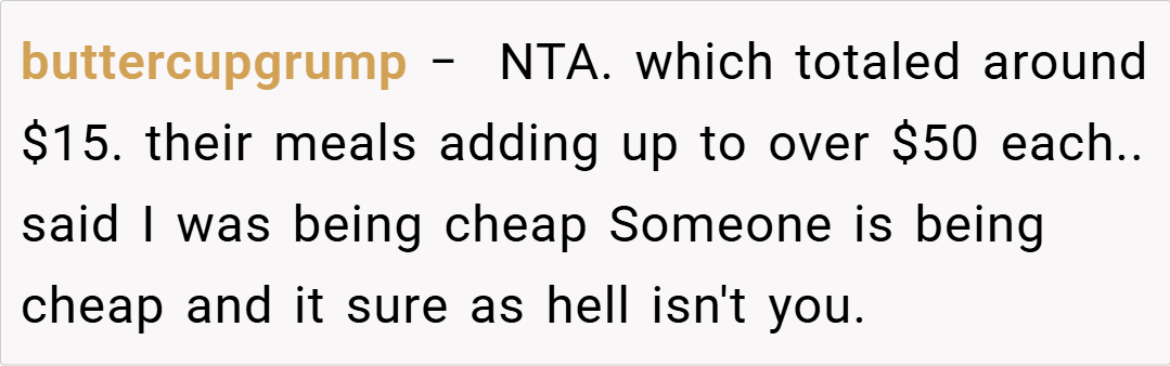 When everyone is honest about their spending, it sets clear expectations for future outings.” The OP’s stance is not about being stingy; it’s about ensuring that the financial responsibility matches what each person actually consumed.