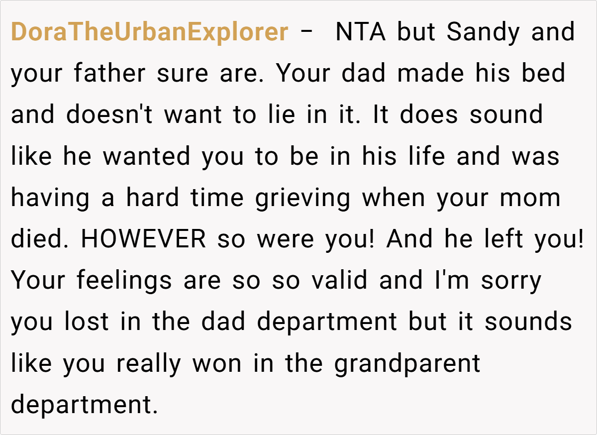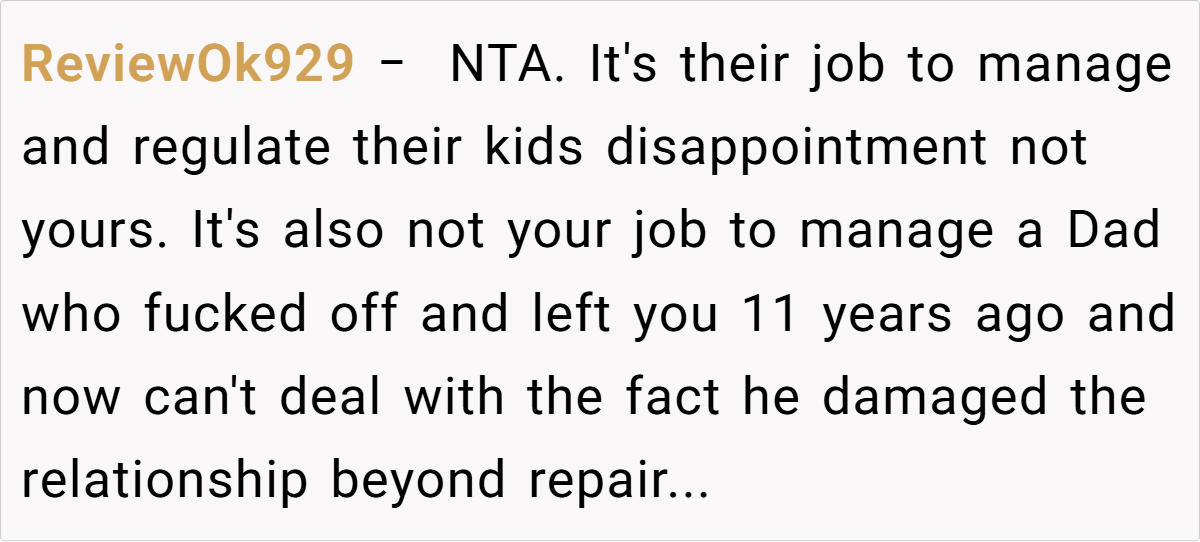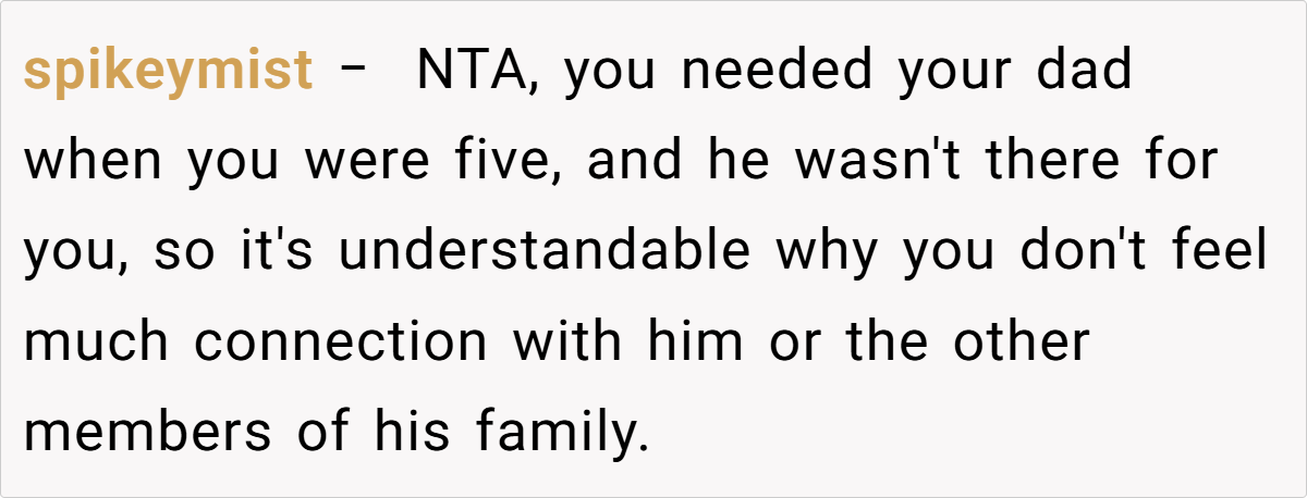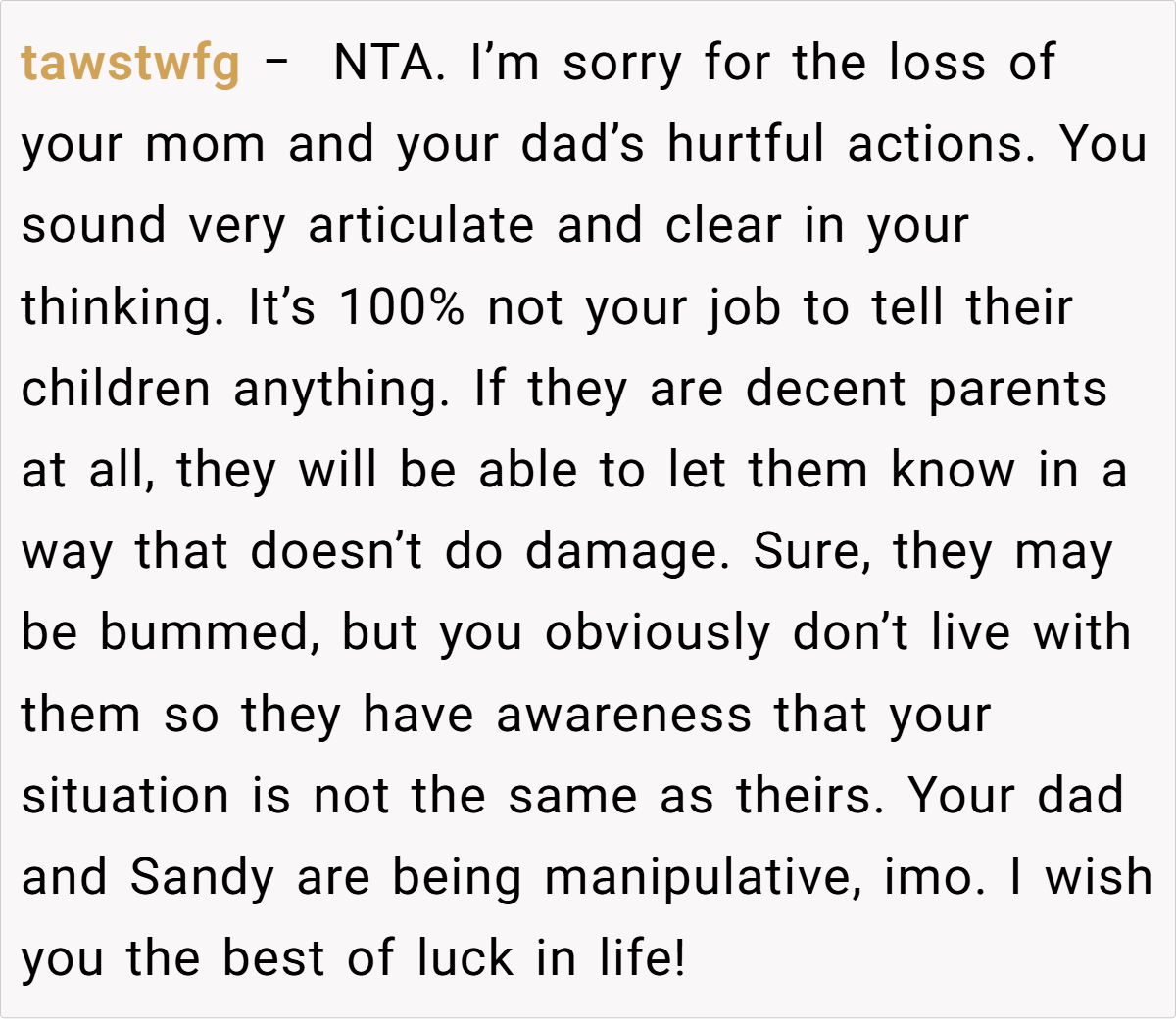 The overwhelming consensus among commenters is that the teen is not at fault. Many point out that it is not his responsibility to manage the expectations or emotions of his half-siblings. Commenters also highlight that his father’s past actions, including abandoning him when he was young, justify his current decision to distance himself. The community largely agrees that the role of communicating family changes should fall on the parents, not on someone who has already suffered so much.
