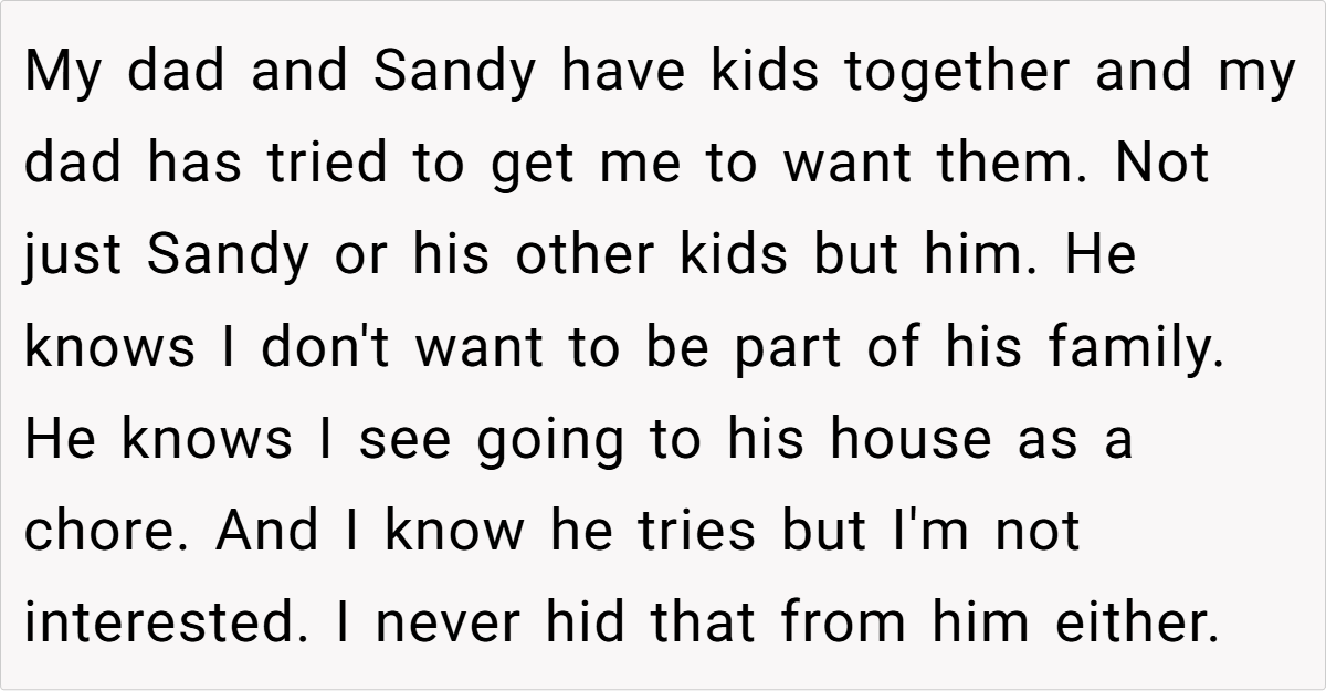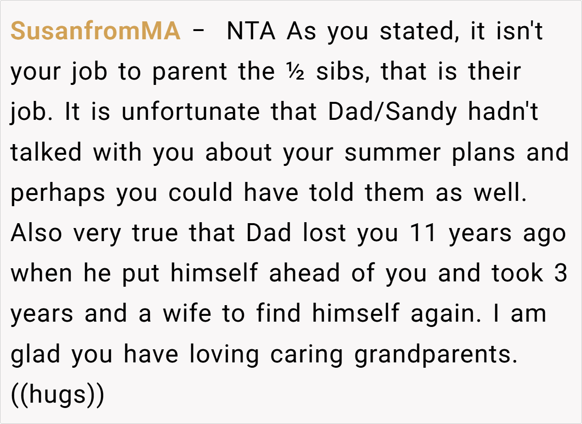 This insight reinforces the teen’s right to refuse the trip without the burden of having to cushion the impact on his half-siblings. His feelings are valid, and his stance is a healthy step toward establishing autonomy in an environment that has long been fraught with emotional complications.