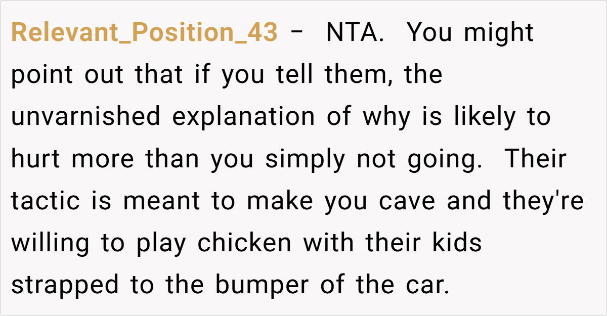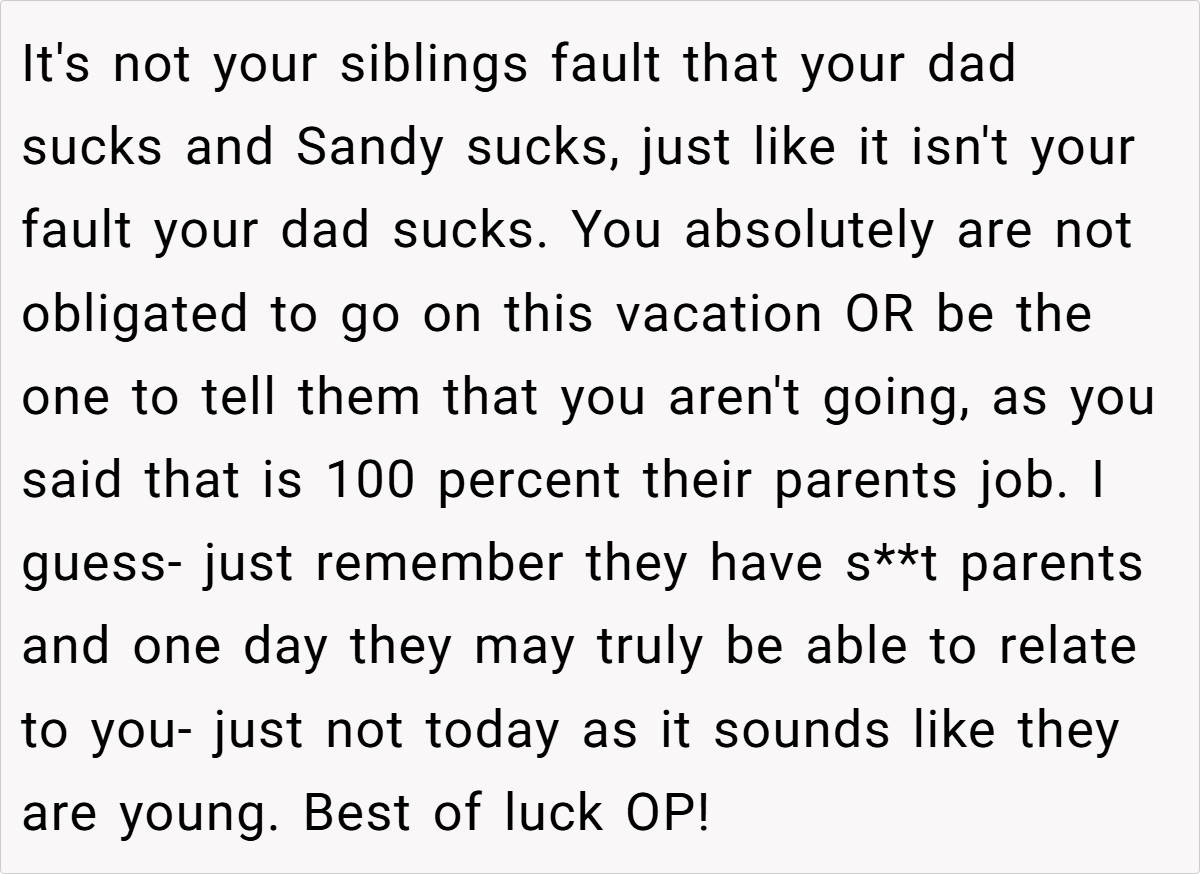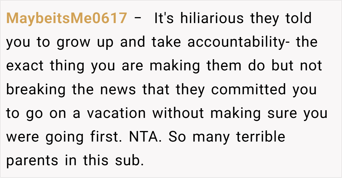 Ultimately, this situation isn’t about a teenager refusing to join a vacation—it’s about the long-lasting impact of parental neglect and the right of an individual to set personal boundaries. The teen’s decision is a strong stand for self-preservation in the face of ongoing family manipulation.