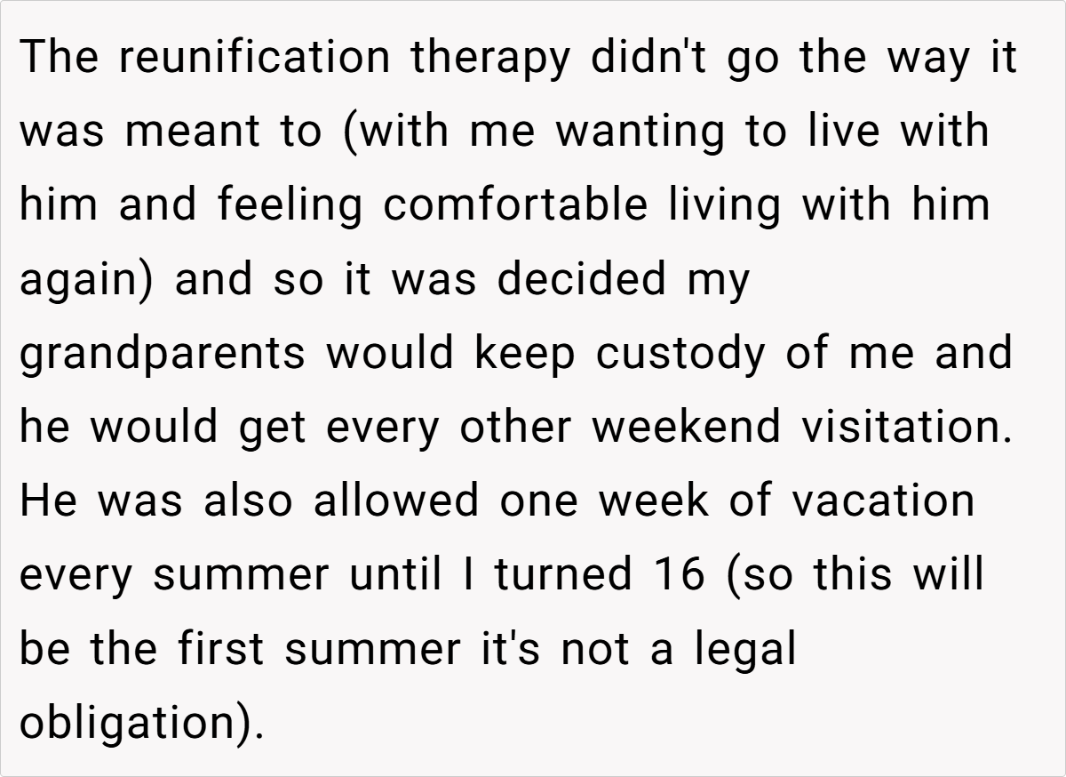 Family dynamics can be incredibly complicated, especially when past wounds and current expectations collide. In this case, a 16-year-old boy—who’s been navigating life under the care of his loving grandparents after a troubled relationship with his biological father—finds himself at a crossroads. With summer vacation now a choice rather than an obligation, he has firmly decided not to join his dad, Sandy, and his half-siblings on a trip that he never wanted to take part in. This decision isn’t made lightly, given the emotional history and family pressures involved.