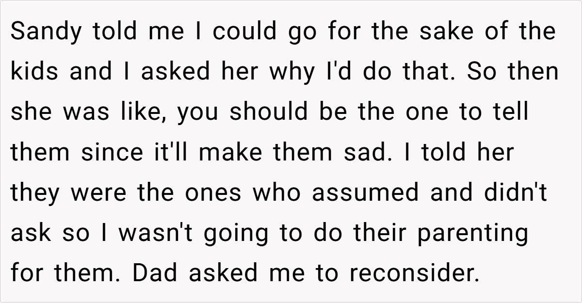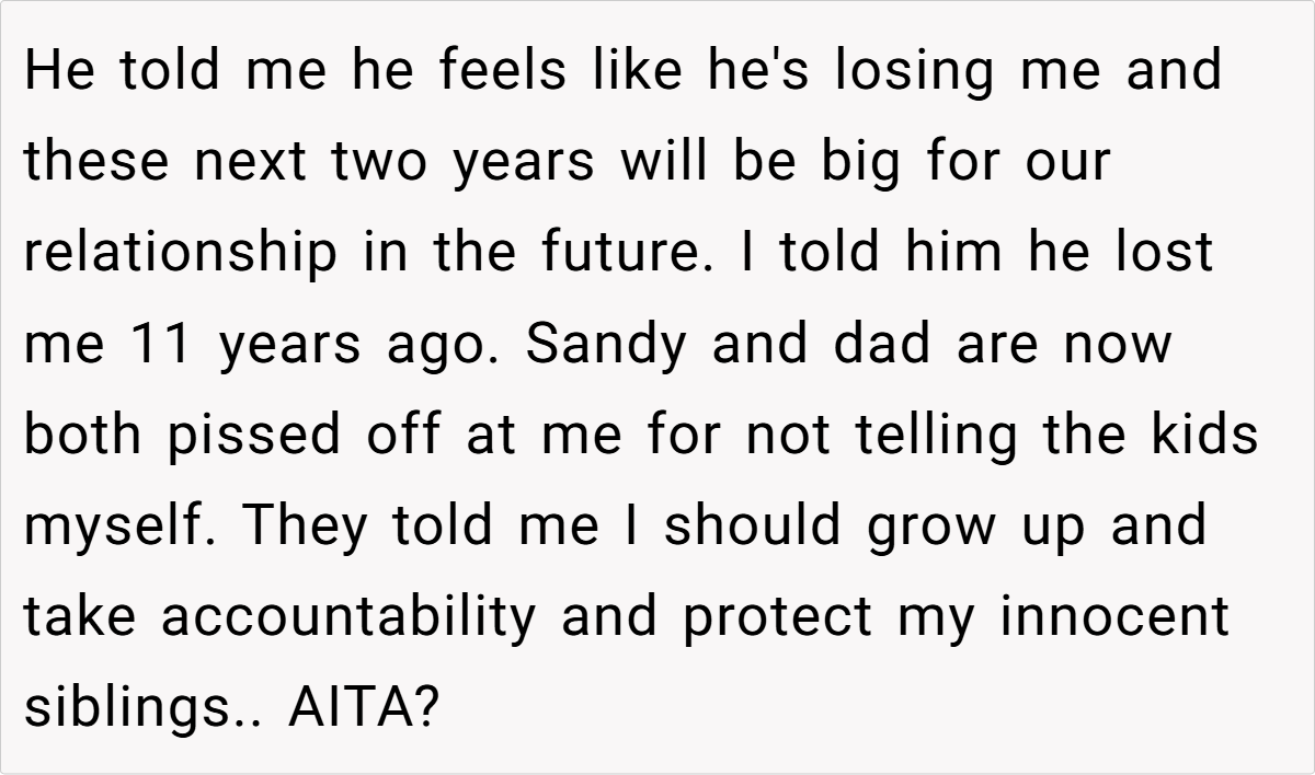 The boy’s choice reflects a deep-seated need to protect his emotional well-being, a reaction to a lifetime of feeling abandoned and manipulated. Instead of being forced into an unwanted family gathering, he’s standing up for himself by refusing to be the bearer of disappointing news for his half-siblings—a role that, as he rightly points out, should fall on their parents. His words, “You lost me 11 years ago,” resonate as a powerful declaration of his independence and hurt.