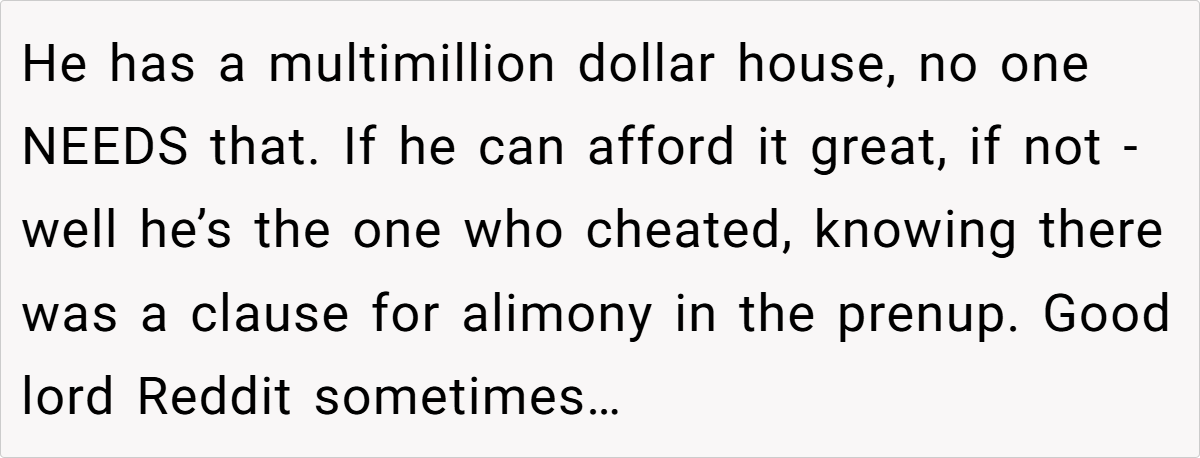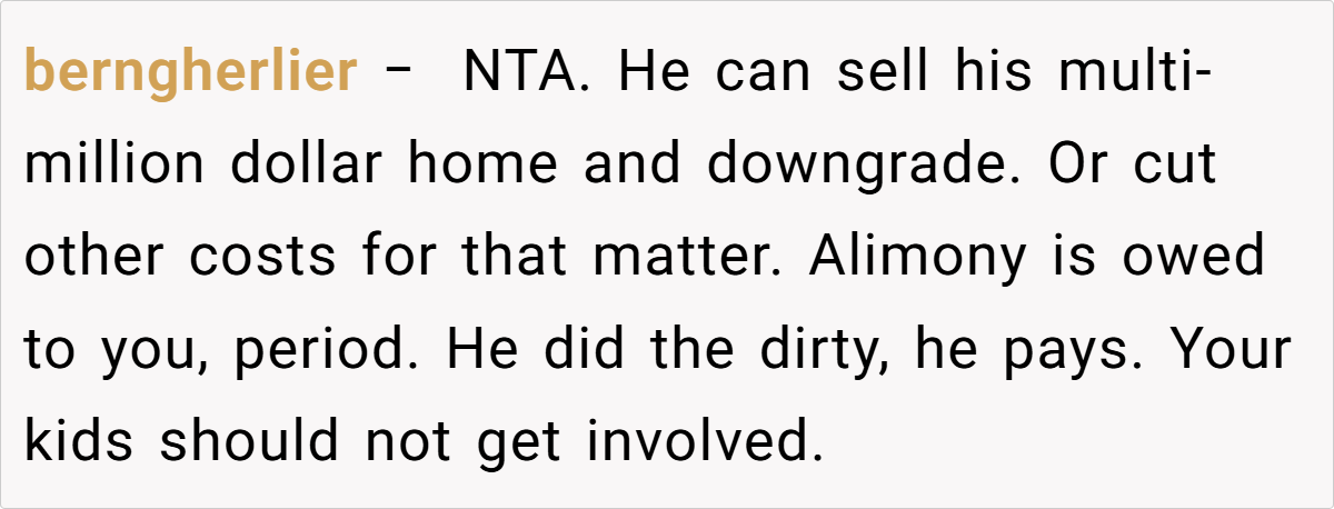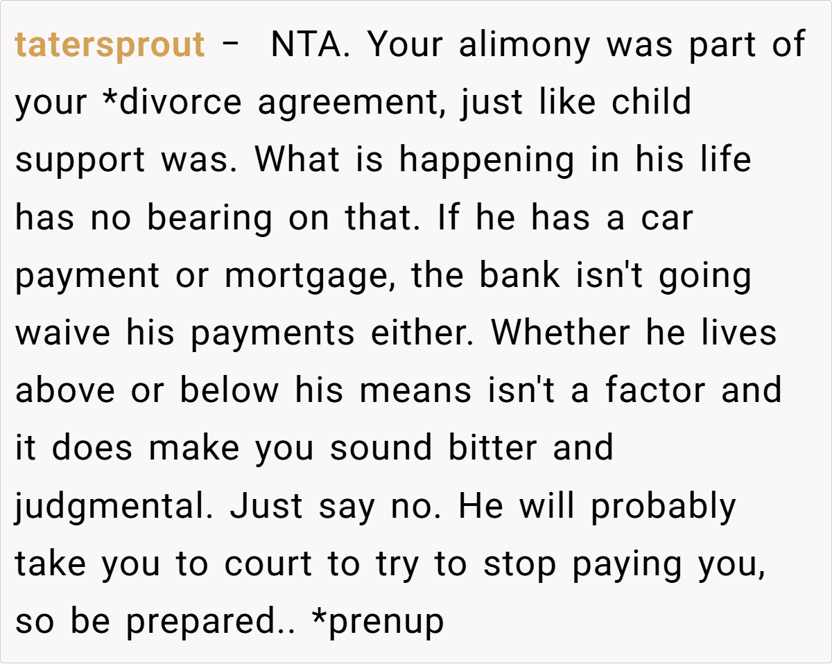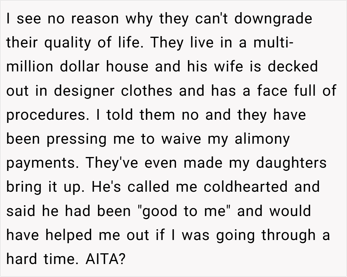 The Reddit community overwhelmingly sides with her. In a general consensus, many commenters assert that she is in the right for insisting on her legally mandated support. They view the request to waive alimony as an unjust attempt by her ex-husband and his new wife to deflect responsibility for their lavish lifestyle.