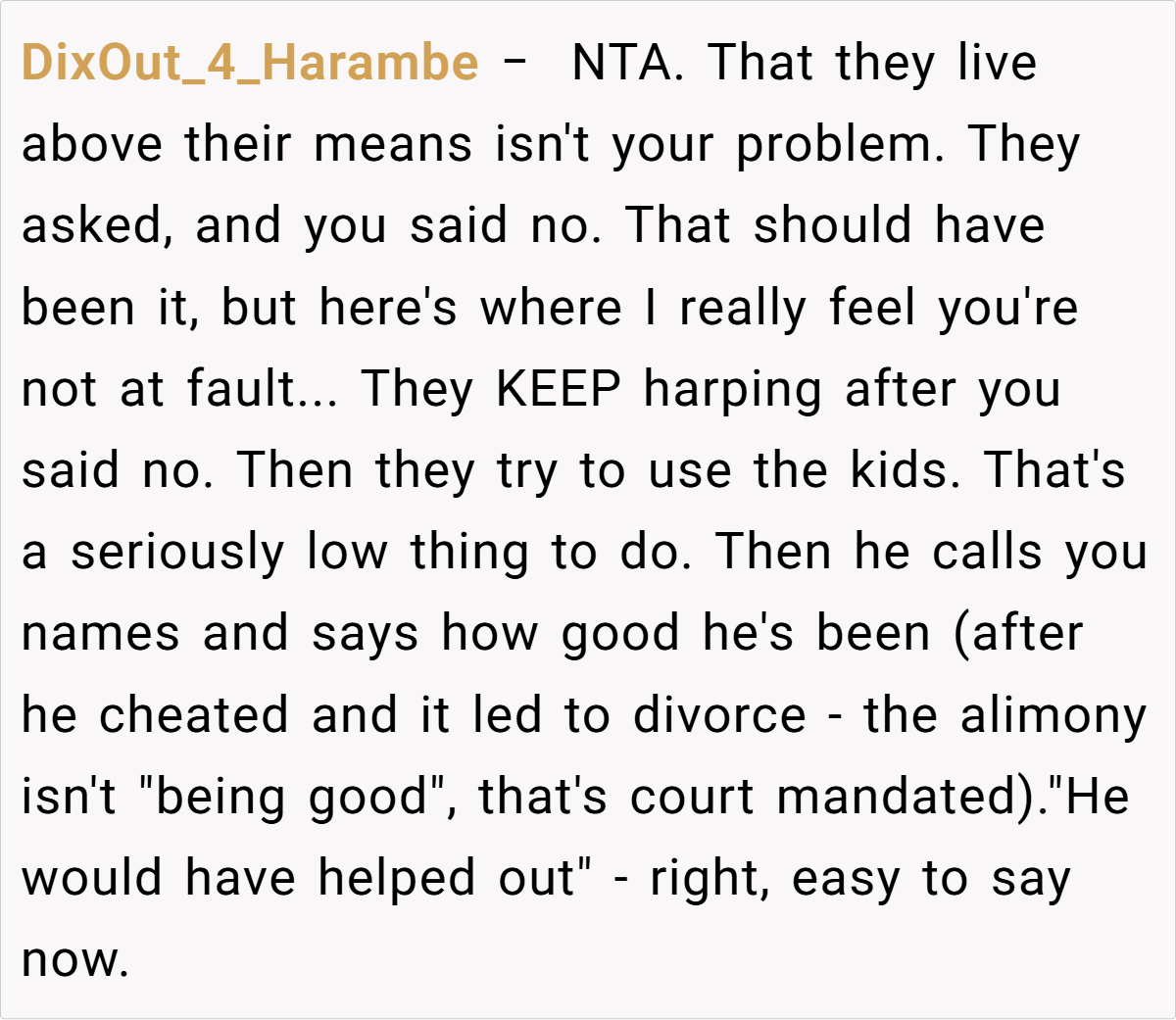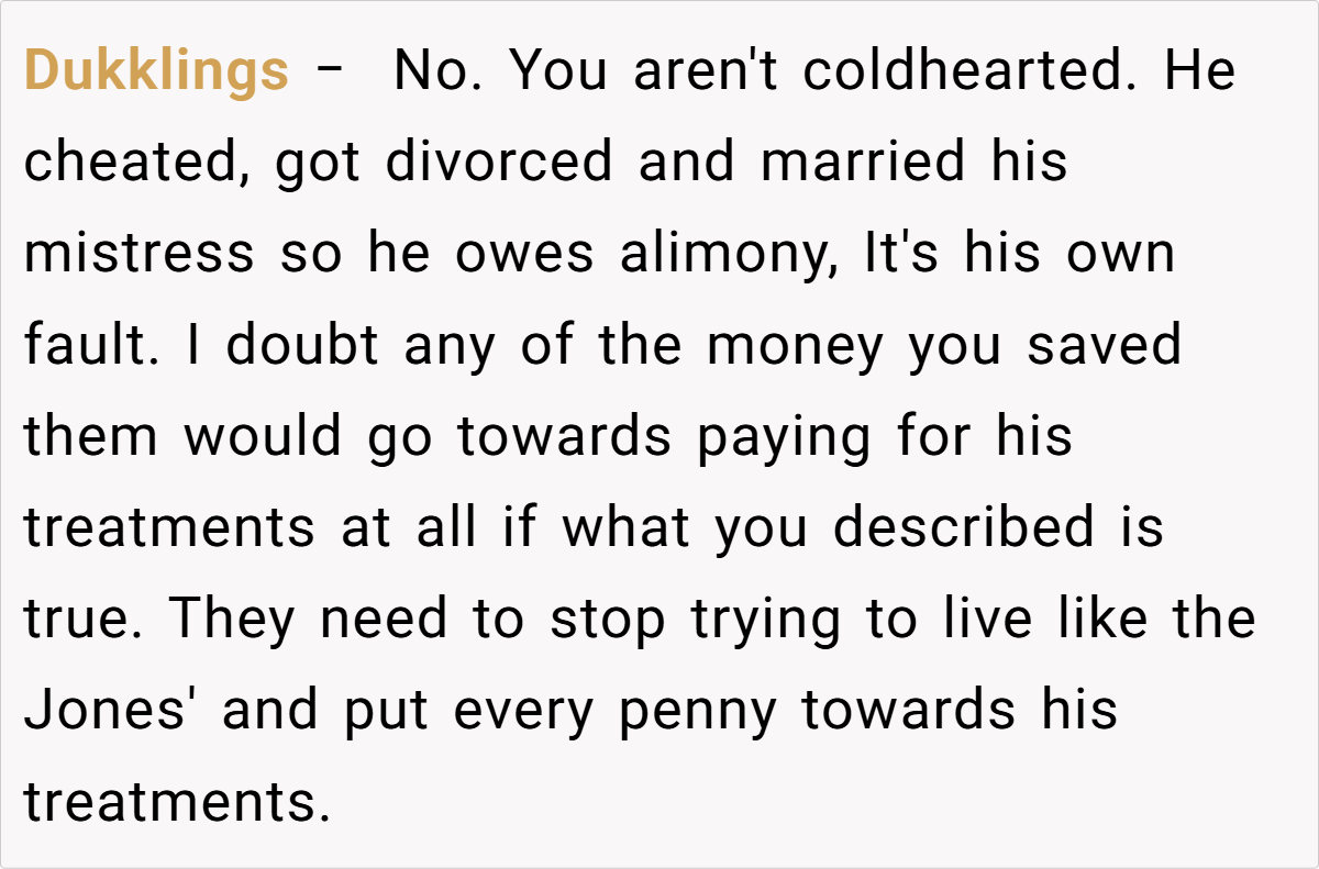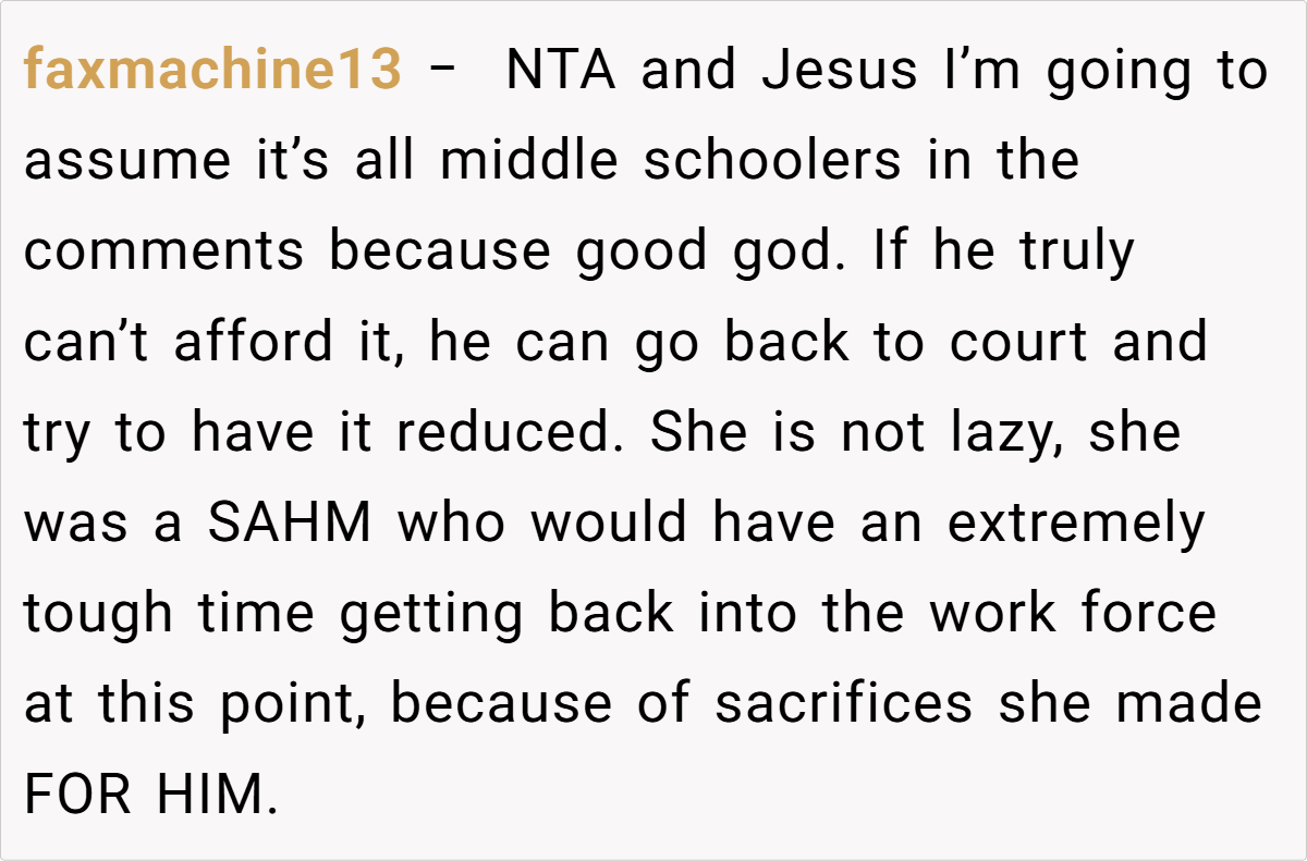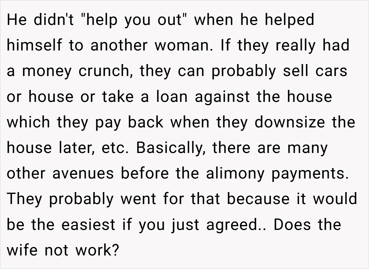 The Reddit community overwhelmingly sides with her. In a general consensus, many commenters assert that she is in the right for insisting on her legally mandated support. They view the request to waive alimony as an unjust attempt by her ex-husband and his new wife to deflect responsibility for their lavish lifestyle.