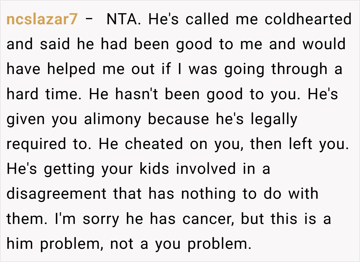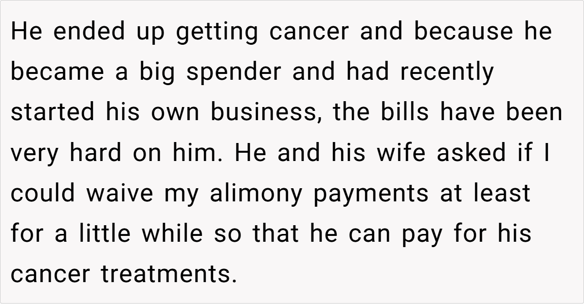 ‘AITA for refusing to waive my alimony because my ex husband has cancer and can’t afford it?’