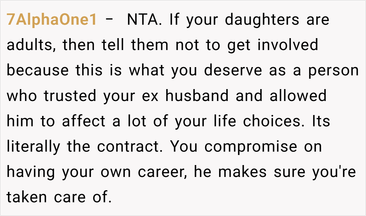 In the midst of this emotionally charged scenario, what should one do when a legally mandated support system is called into question? With three daughters involved and a legacy of both sacrifice and betrayal, the stakes are high. The personal and financial dimensions of divorce have merged into a poignant dilemma, inviting both legal and moral scrutiny. The story not only highlights a fractured past but also sets the stage for a debate on fairness, responsibility, and the enduring impact of broken trust.