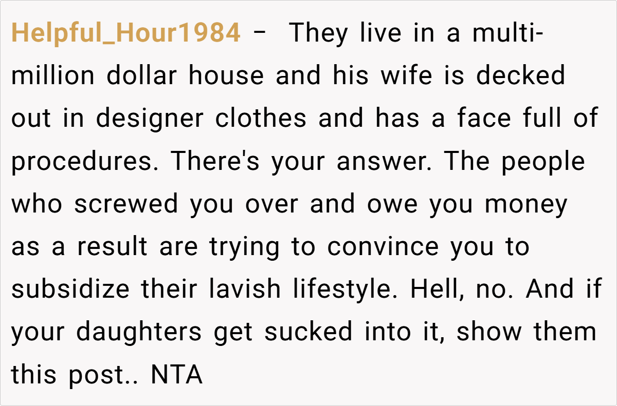 The consensus is that financial hardships—especially when stemming from personal choices—should not force someone to compromise on a binding agreement. While a few voices note the complexity of health issues, the prevailing sentiment is clear: she should not be pressured into subsidizing an extravagant lifestyle.