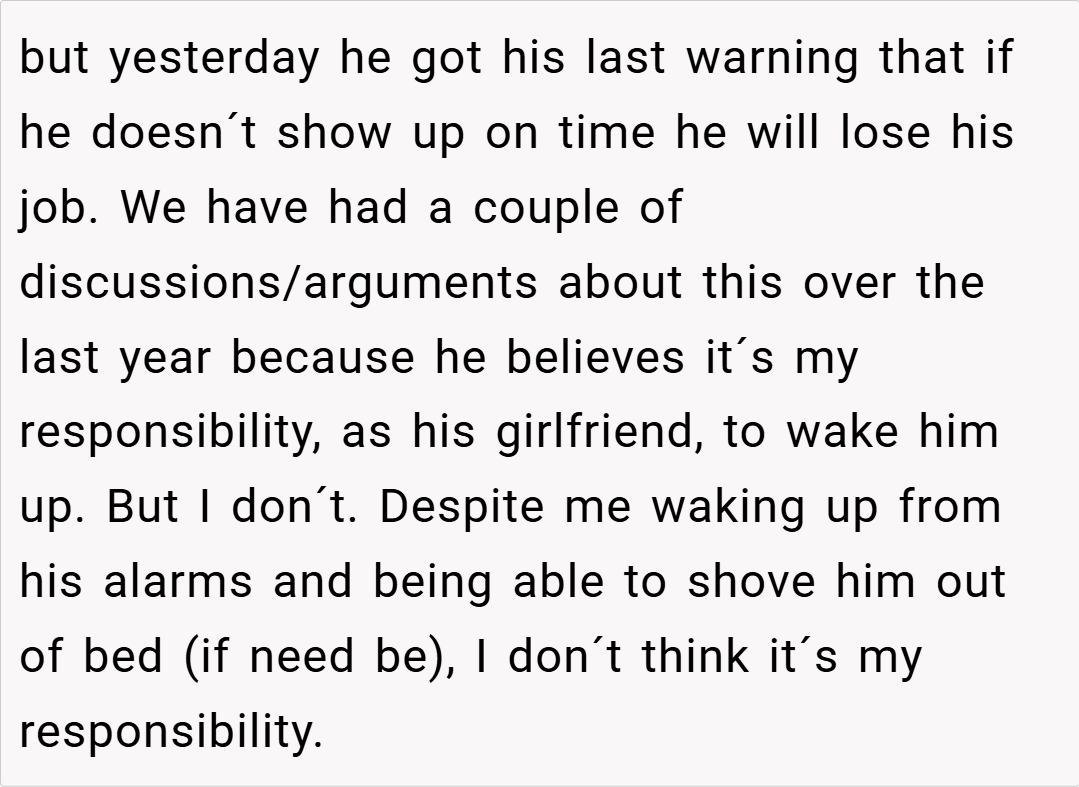 Despite his repeated tardiness, which even cost him a final warning at work, he expects his girlfriend to play the role of a personal alarm clock. This expectation has led to mounting frustration, as she finds herself caught between guilt for not helping and anger at being burdened with a problem he should solve on his own.