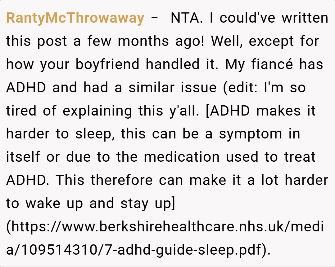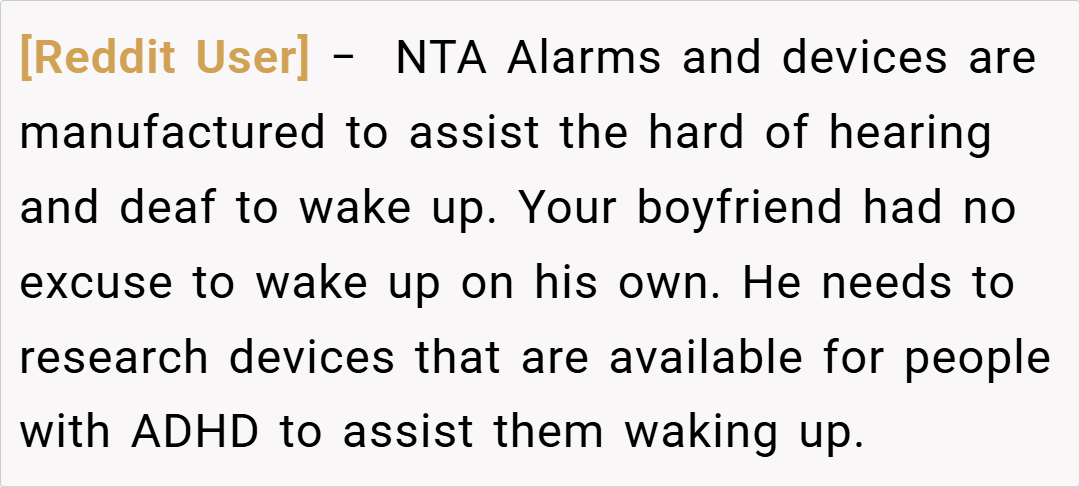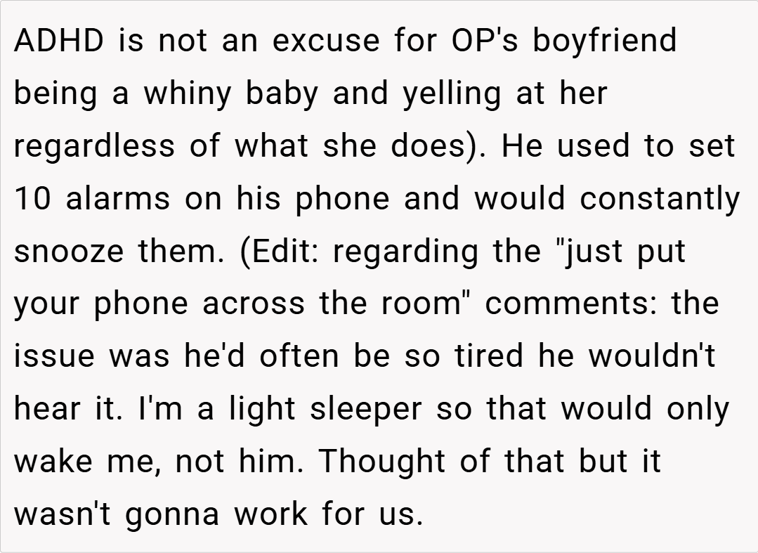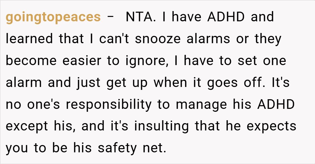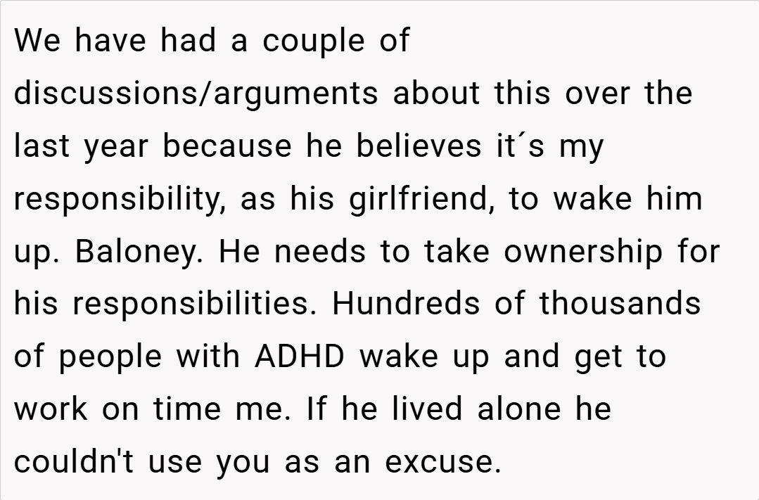The Reddit community overwhelmingly supports the view that it’s not the girlfriend’s duty to wake him up. Many commenters argue that as an adult, he should take responsibility for his own challenges, especially when he’s known about his ADHD all his life.