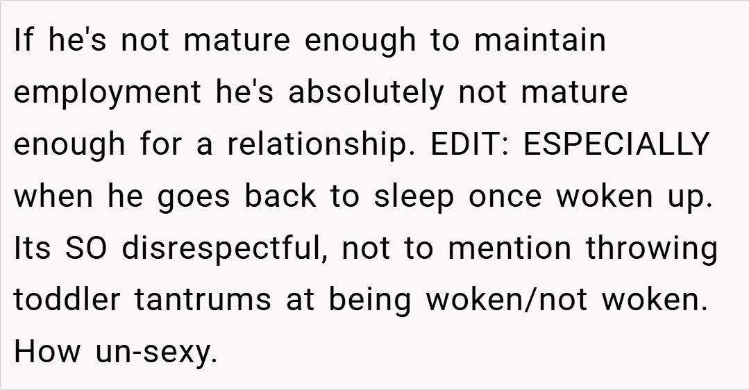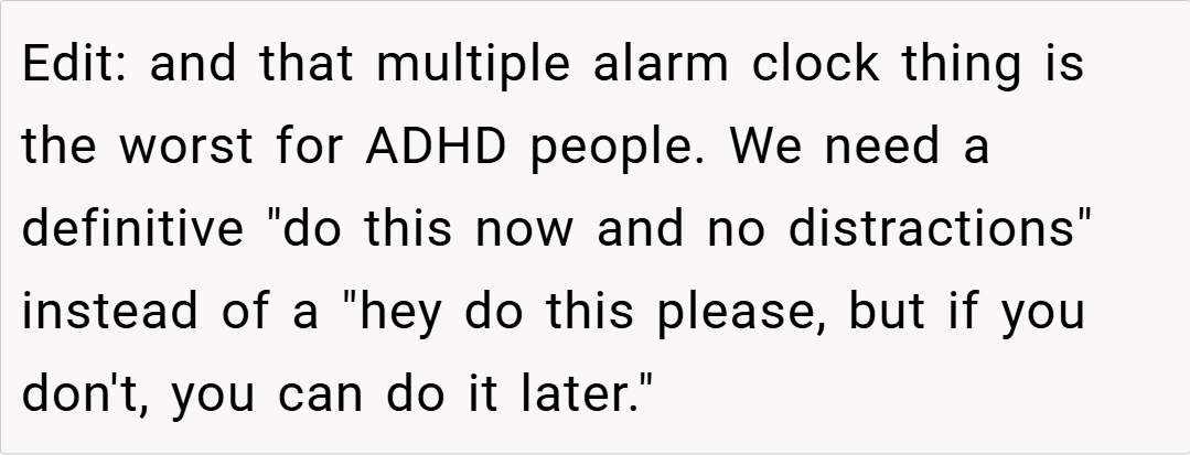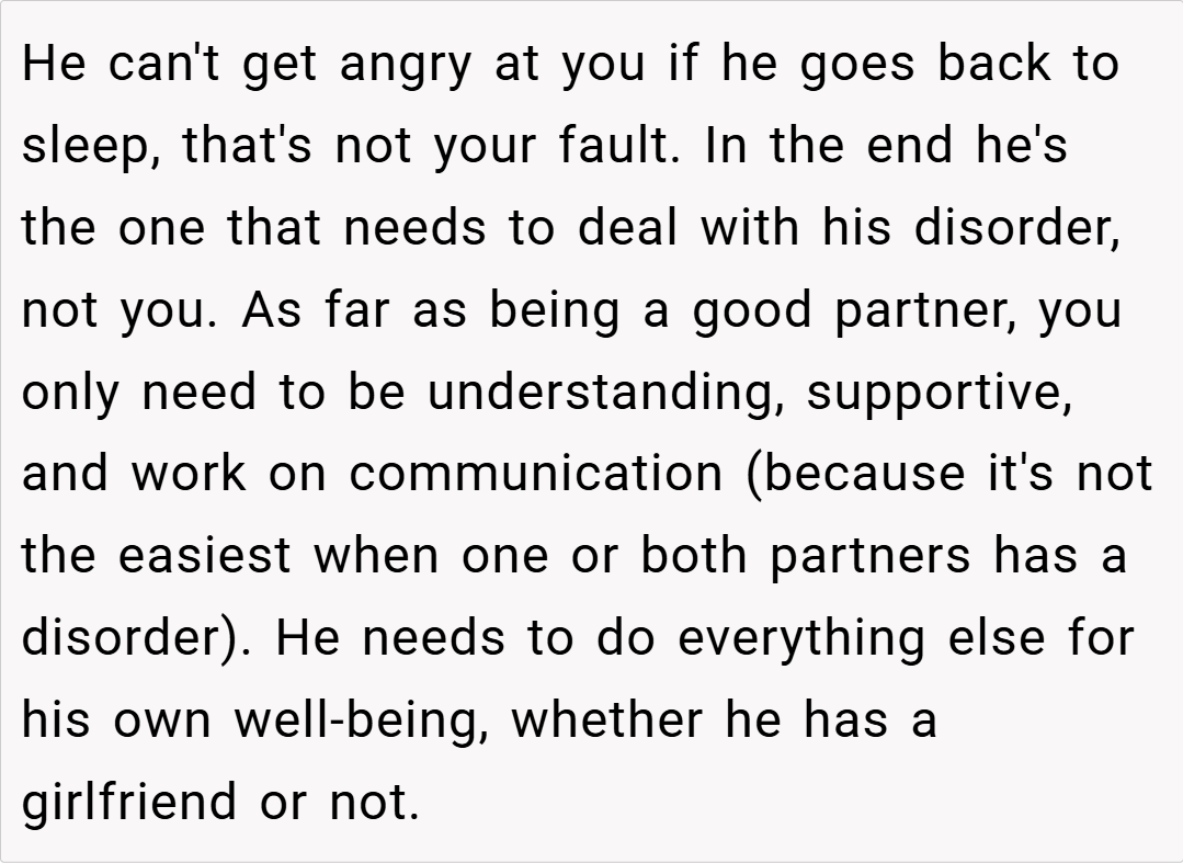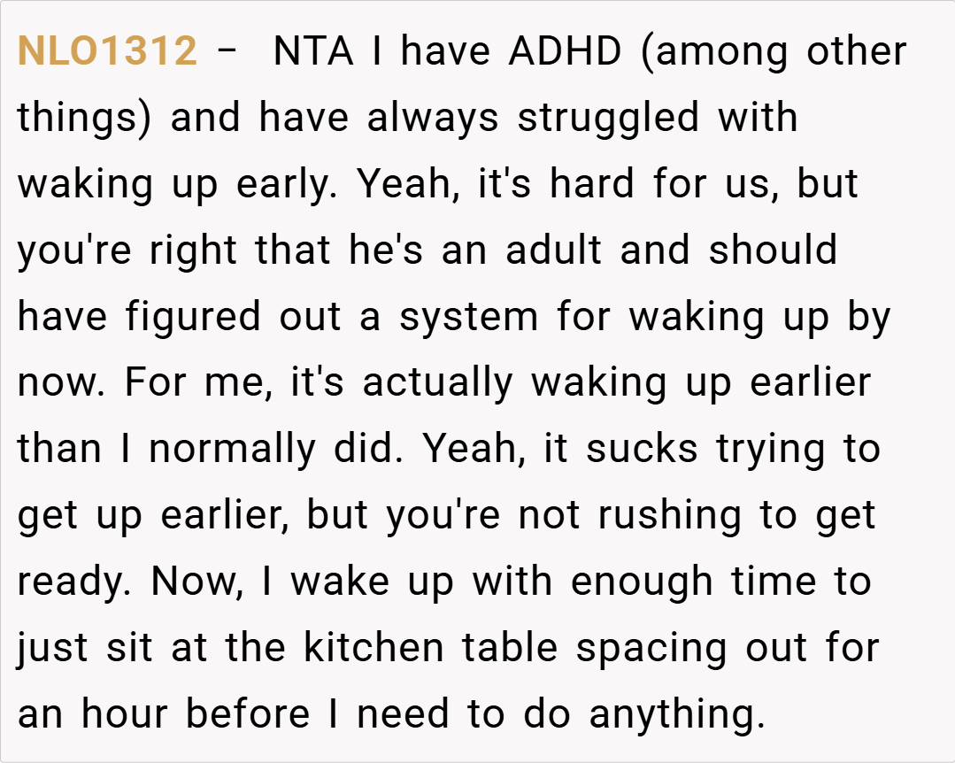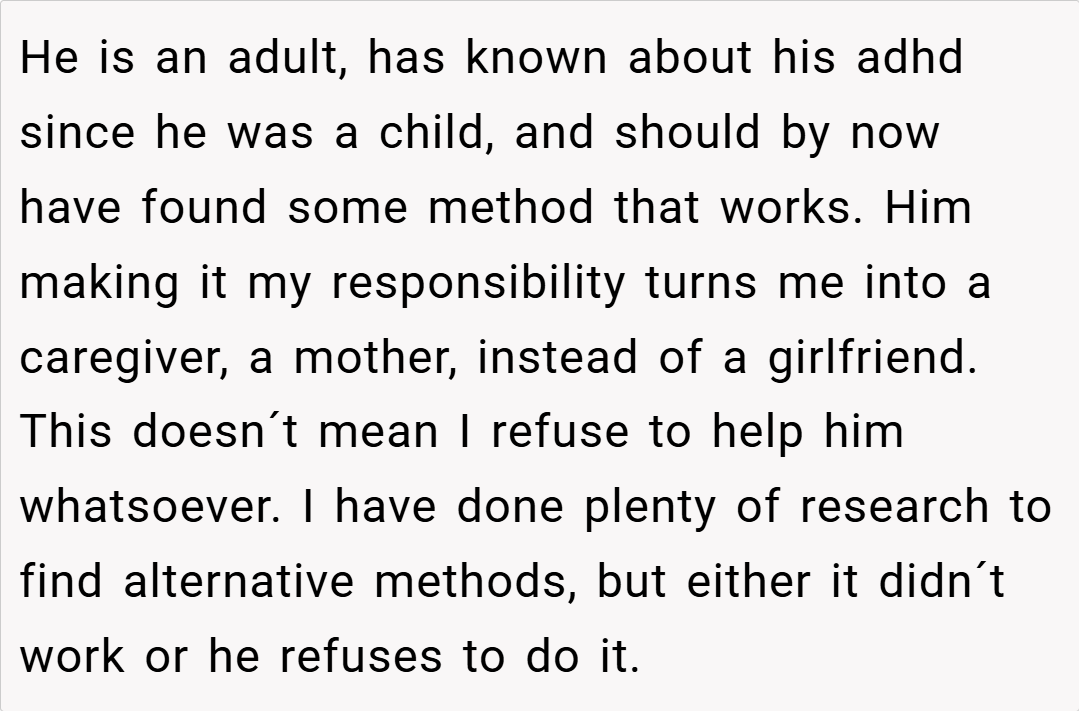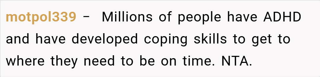 The Reddit community overwhelmingly supports the view that it’s not the girlfriend’s duty to wake him up. Many commenters argue that as an adult, he should take responsibility for his own challenges, especially when he’s known about his ADHD all his life.