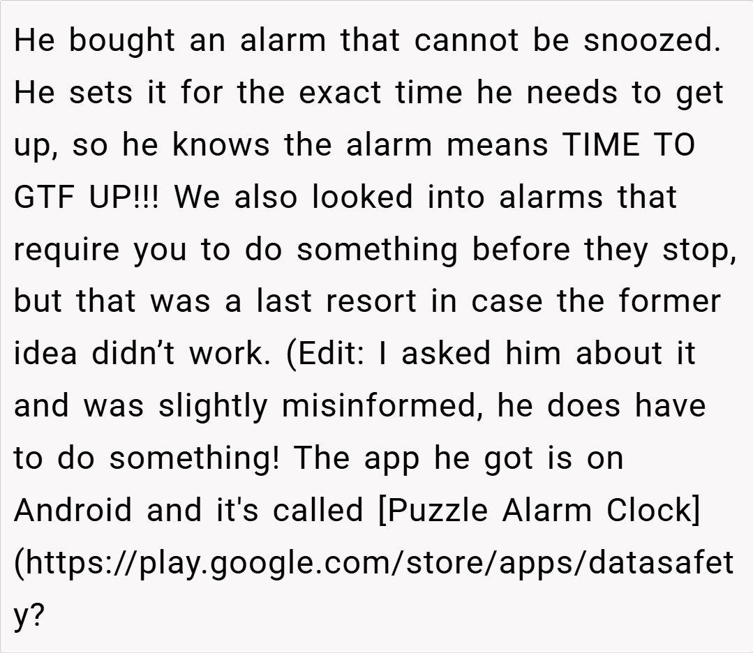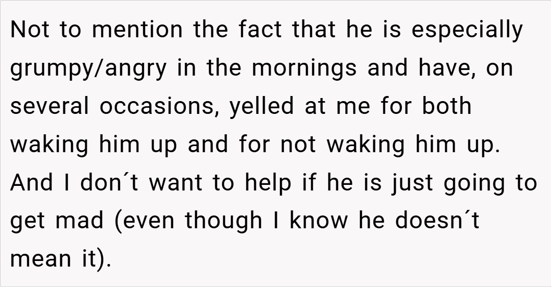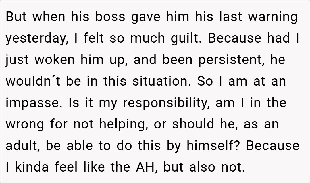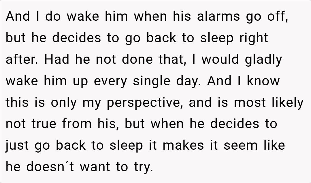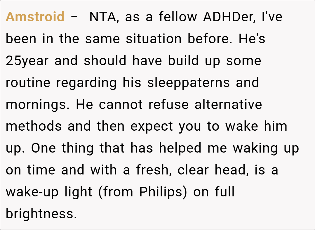 The situation reaches a tipping point when, despite her best efforts to wake him up every time his alarms go off, he simply goes back to sleep. This leaves her wondering if her refusal to consistently act as his wake-up call is justified. Is it really her responsibility to ensure he’s up on time, or should he, as an adult aware of his ADHD, develop his own solutions?