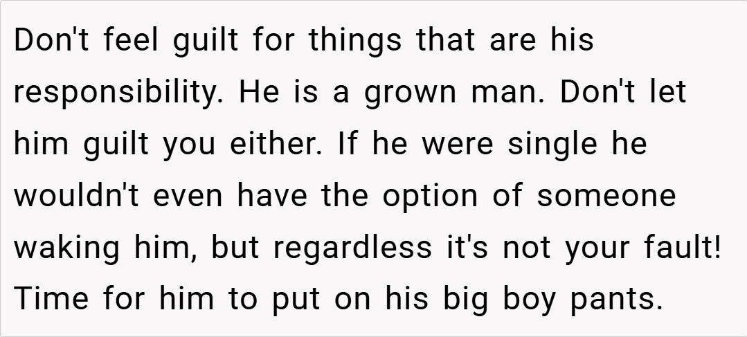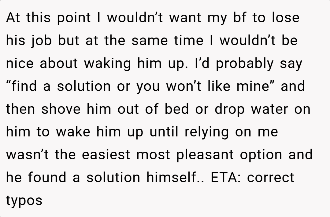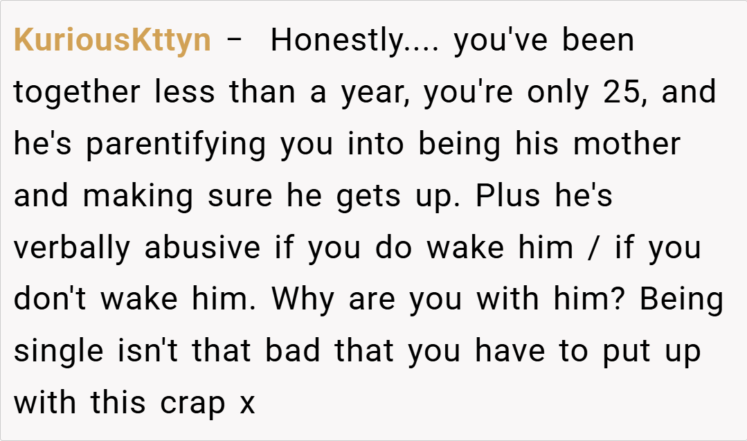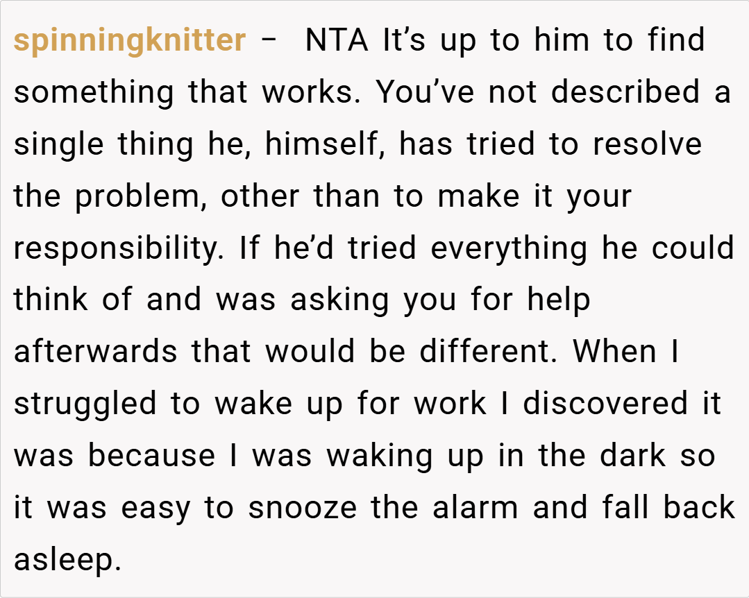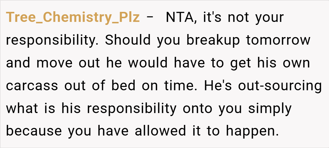 Users emphasize that expecting his partner to serve as his personal alarm clock shifts undue burden and reinforces an unhealthy dynamic. They recommend exploring practical tools and establishing routines instead of relying on her intervention. Overall, the consensus is that while occasional help is acceptable, the responsibility for managing one’s sleep habits should ultimately rest on him.