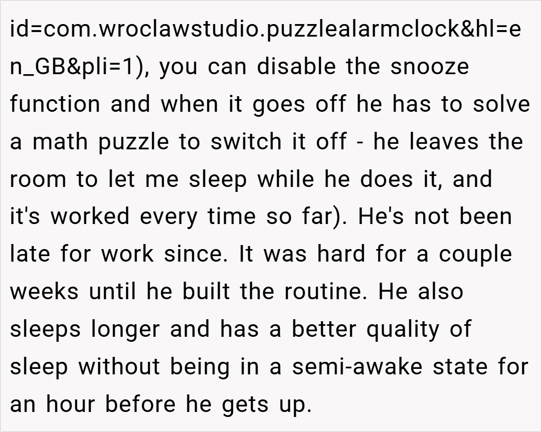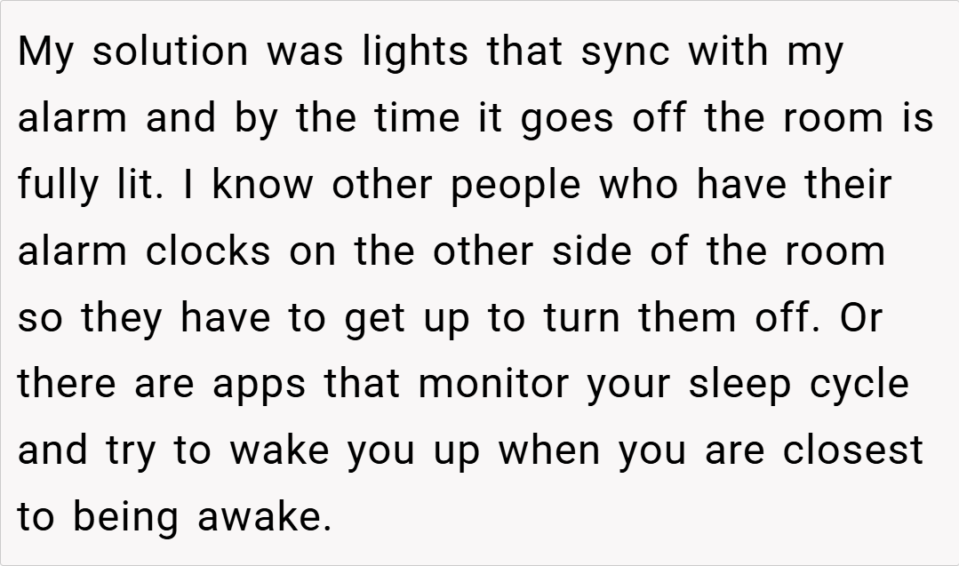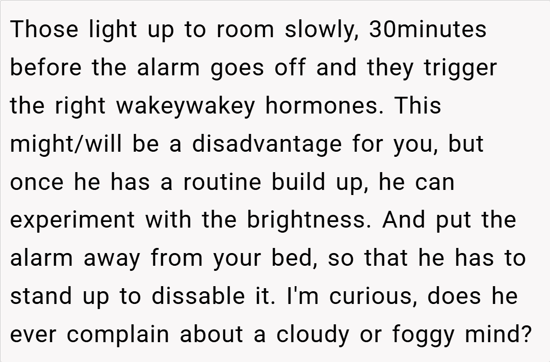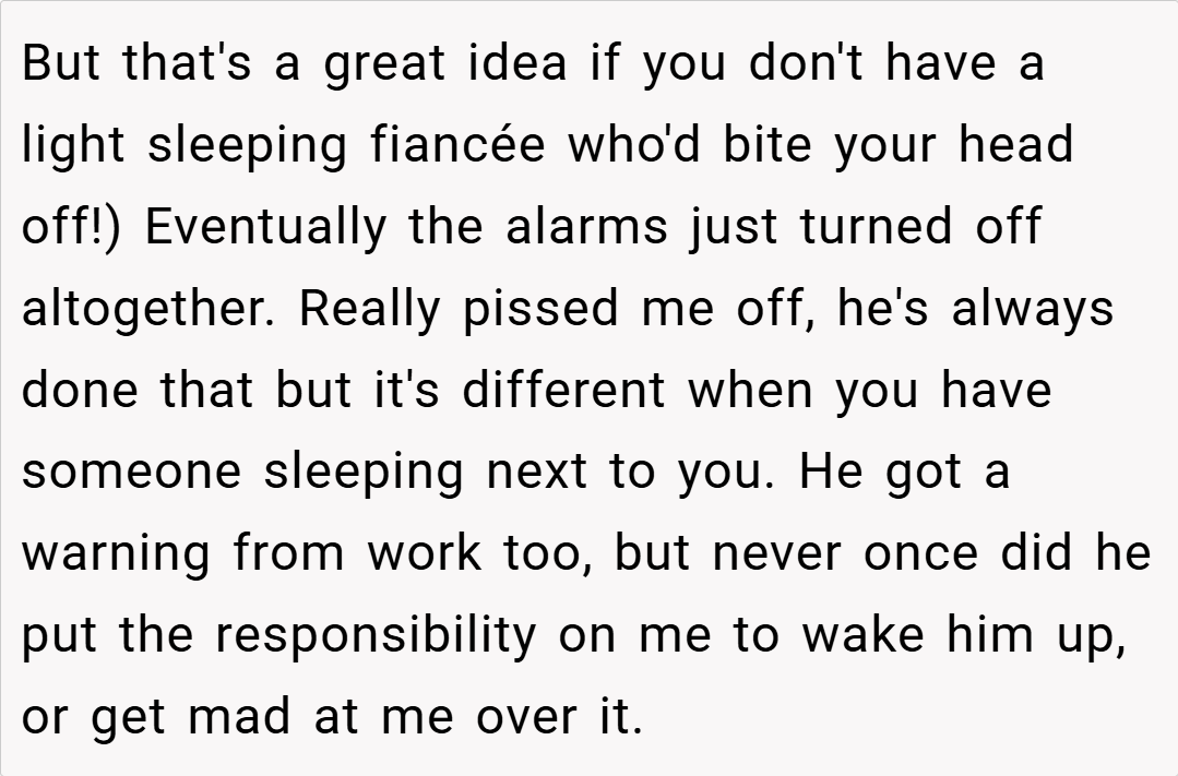 Users emphasize that expecting his partner to serve as his personal alarm clock shifts undue burden and reinforces an unhealthy dynamic. They recommend exploring practical tools and establishing routines instead of relying on her intervention. Overall, the consensus is that while occasional help is acceptable, the responsibility for managing one’s sleep habits should ultimately rest on him.