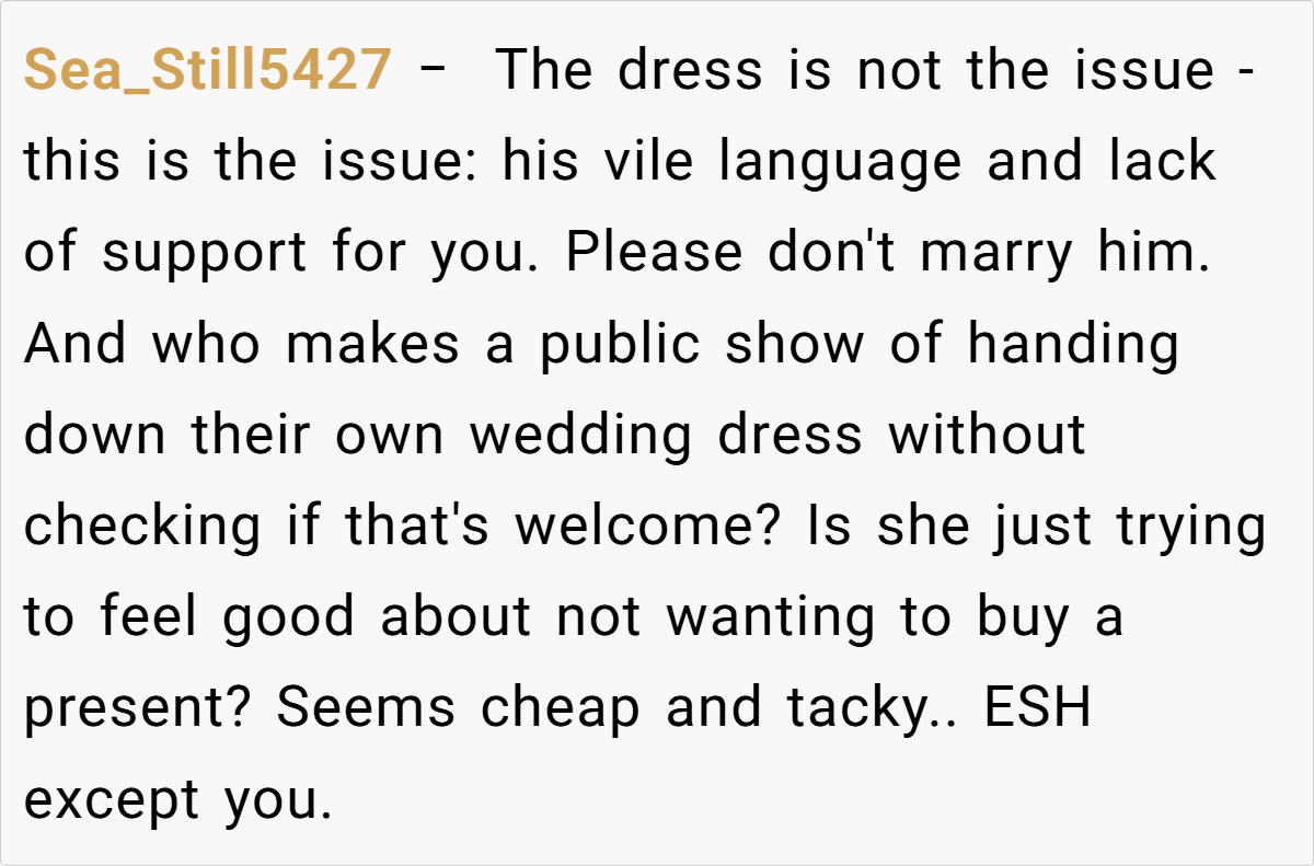 The Reddit community had plenty to say about this wedding dress dilemma, with many praising the bride’s resolve and offering humorous takes on the family drama. Comments ranged from supportive cheers for keeping personal traditions intact to playful jabs about family meddling, all reflecting the shared sentiment that your wedding day should reflect you, not the expectations of others.