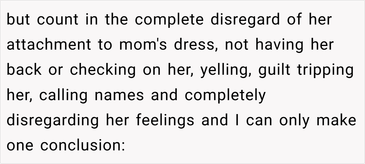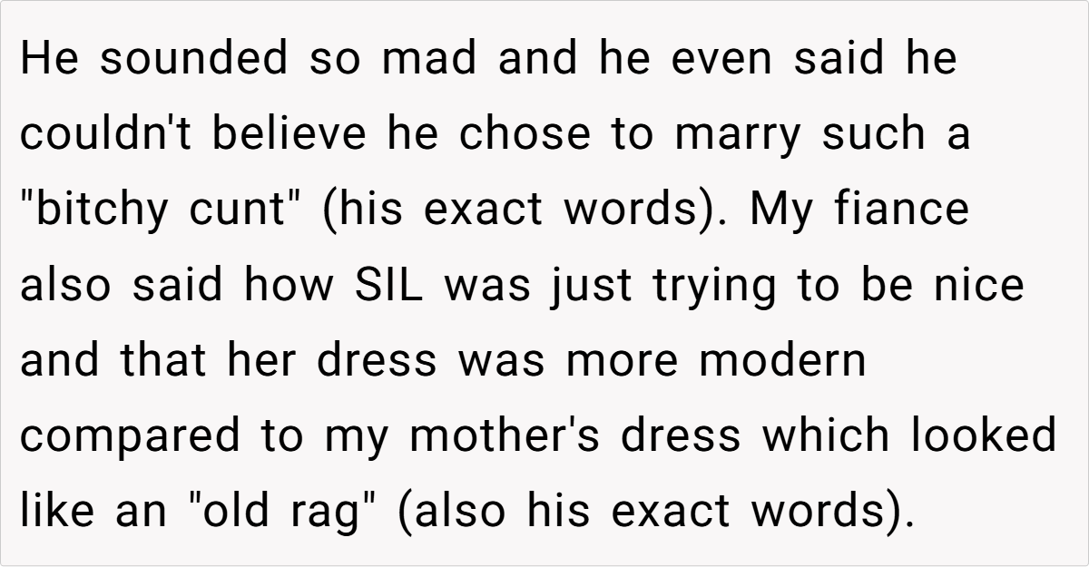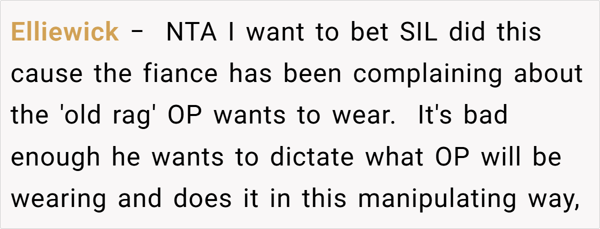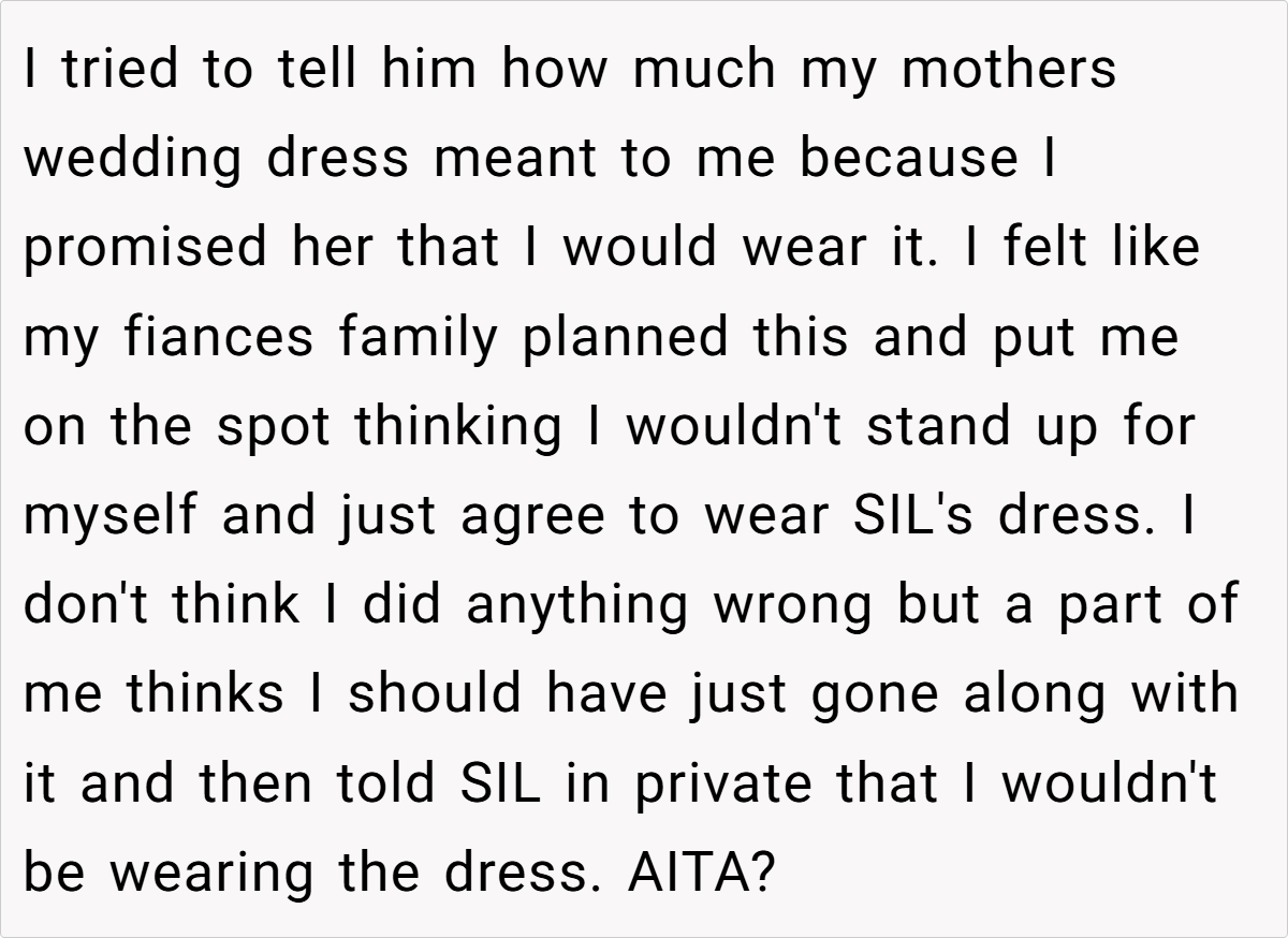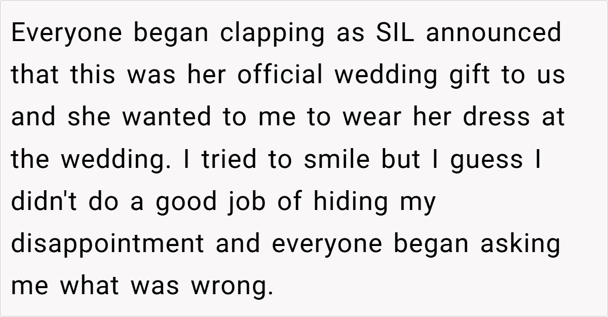 The conflict here largely stems from differing perspectives. While the sister-in-law’s gift was meant to be generous and modern, it inadvertently clashed with the bride’s emotional ties to her mother’s dress. This situation reveals how even well-meaning gestures can miss the mark when they conflict with cherished memories. The gift, intended as a token of love, became a symbol of imposed expectations that the bride simply could not accept.
