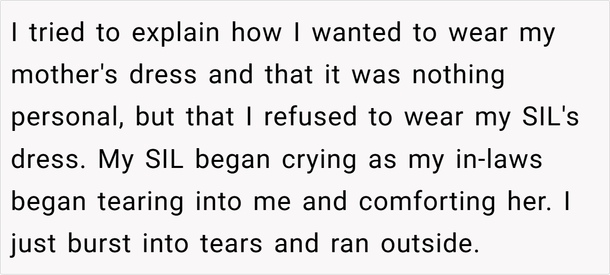 This dilemma isn’t just about fabric and style; it’s about identity, legacy, and the power to choose what feels right on your special day. The tension between family expectations and personal conviction sets the stage for a story that resonates with anyone who’s ever faced the pressure of tradition versus self-expression.