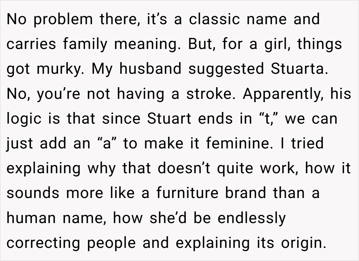 While we quickly agreed on the classic “Stuart Jr.” for our son as a way to honor his family legacy, the conversation for our daughter took a strange turn. My husband insisted on the name “Stuarta,” arguing that simply adding an “a” to his name would create a unique feminine version.
