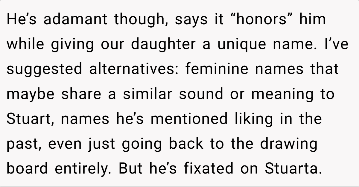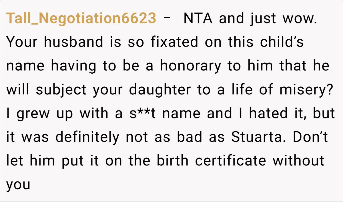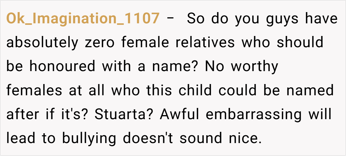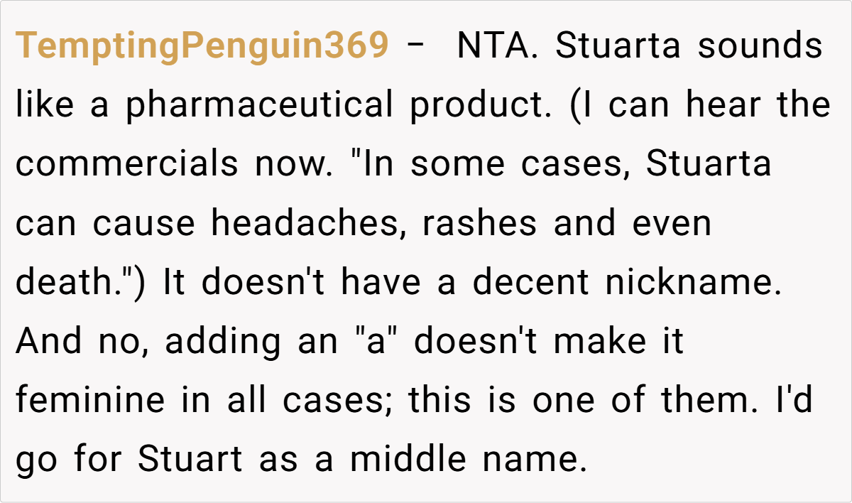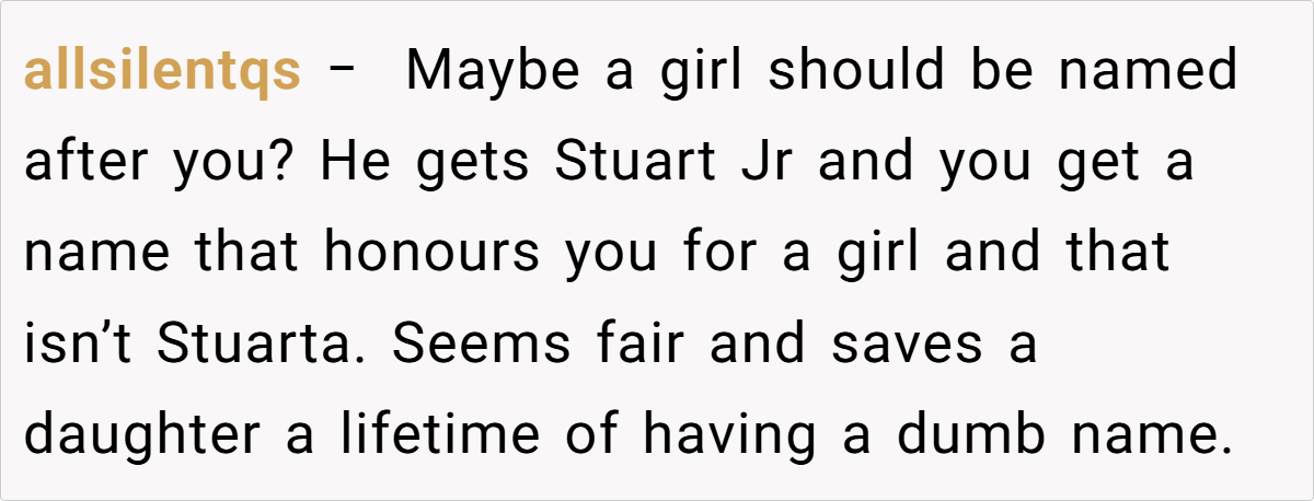 Some users even joked that “if your daughter’s name sounds like a piece of flat-pack furniture, maybe it’s time to rethink.” A few commenters, however, felt that creativity in naming is subjective and that my husband’s passion for “Stuarta” might just be his quirky way of showing love. Overall, the consensus leaned toward the importance of choosing a name that will empower and protect the child’s self-esteem.