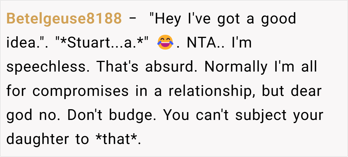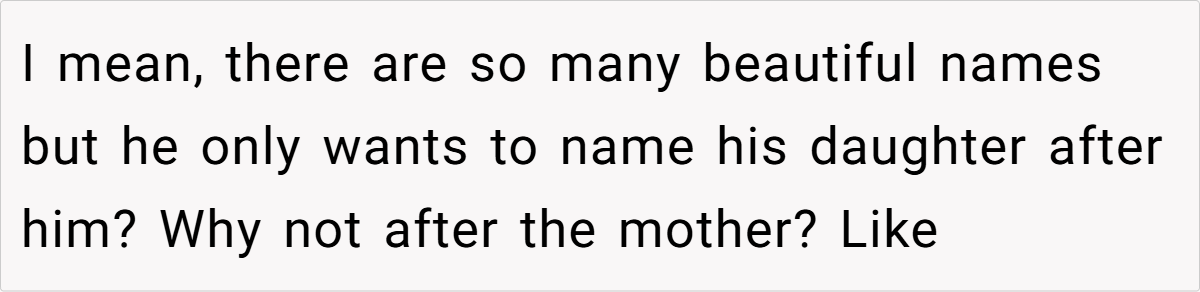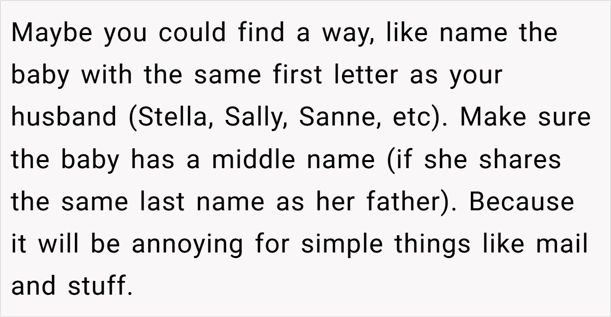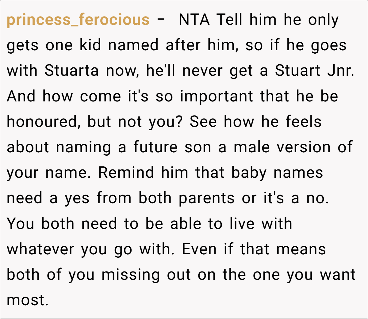 Some users even joked that “if your daughter’s name sounds like a piece of flat-pack furniture, maybe it’s time to rethink.” A few commenters, however, felt that creativity in naming is subjective and that my husband’s passion for “Stuarta” might just be his quirky way of showing love. Overall, the consensus leaned toward the importance of choosing a name that will empower and protect the child’s self-esteem.