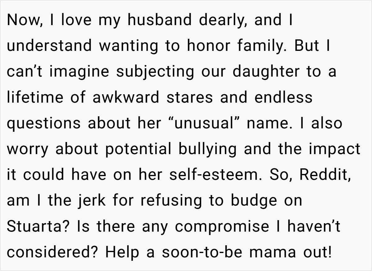 In the end, my decision to reject “Stuarta” isn’t about disrespecting my husband’s wishes; it’s about ensuring our daughter has the best possible start in life without unnecessary baggage. While family traditions are precious, our child’s well-being and future happiness must come first.