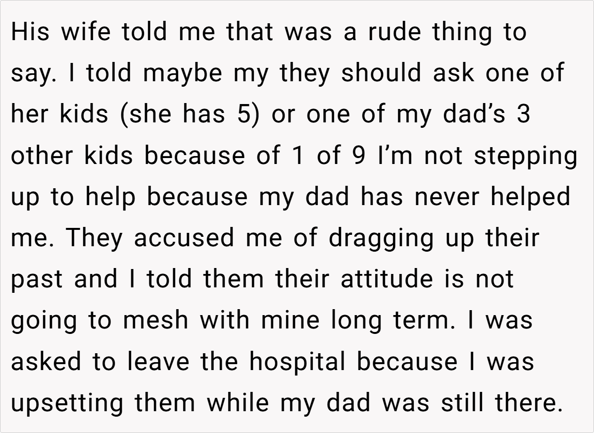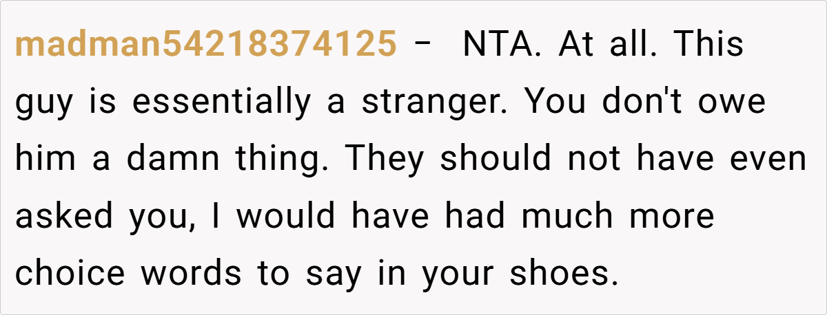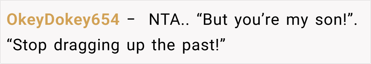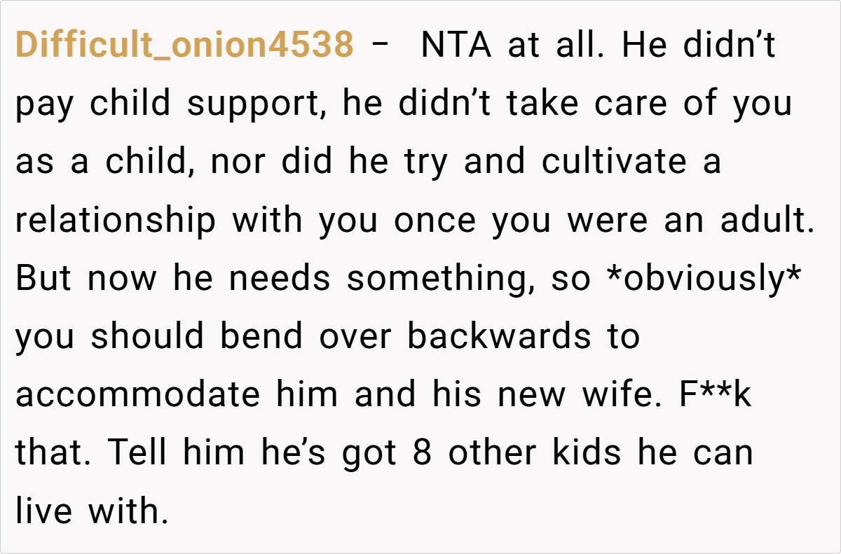Family psychologist Dr. Emily Carter notes, “Boundaries are essential when past neglect continues to impact present relationships.” In OP’s situation, her refusal to allow her dad and his wife to move in is rooted in years of feeling unsupported. When a parent repeatedly fails in their responsibilities—such as not paying child support—it undermines the foundation of trust needed for any future relationship. Dr. Carter explains that this behavior isn’t about punishing someone but about self-preservation.
