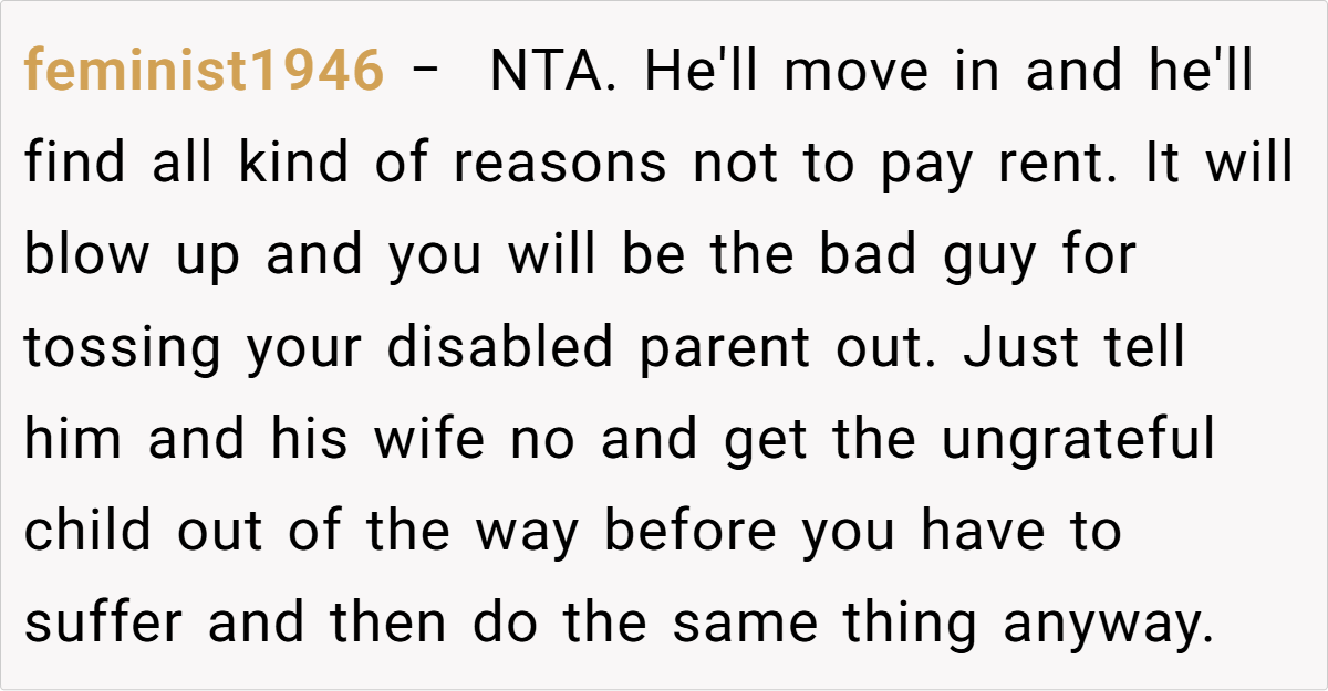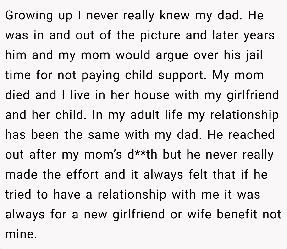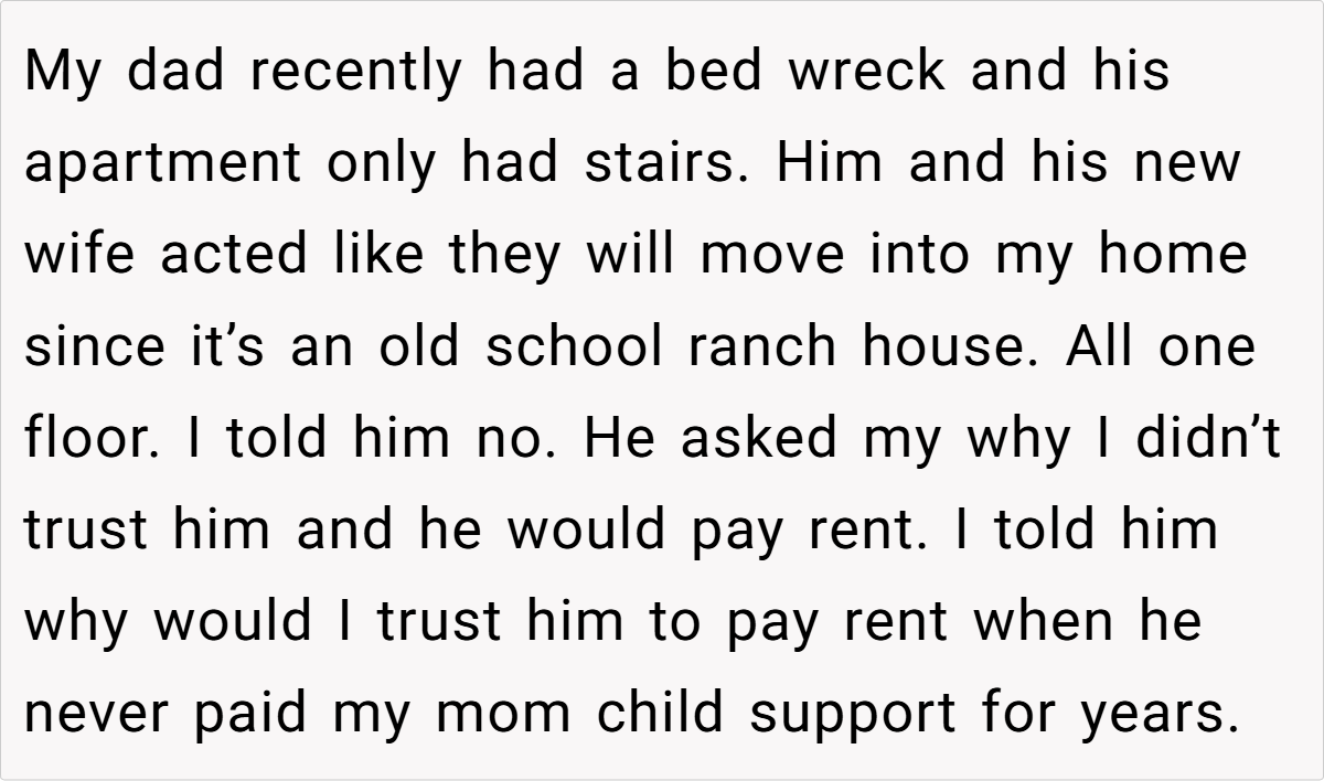 Growing up without a steady dad can leave deep emotional scars, and for OP, that absence was compounded by his repeated failures to support her family. After years of being let down—most painfully highlighted by his refusal to pay child support—she’s built her own safe space in her late mother’s house. Now, when her dad and his new wife unexpectedly try to move in due to his housing issues, old wounds are ripped open.