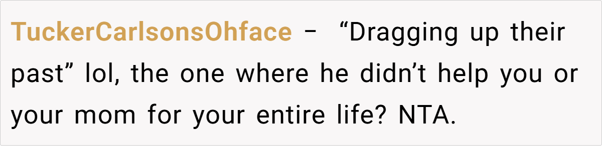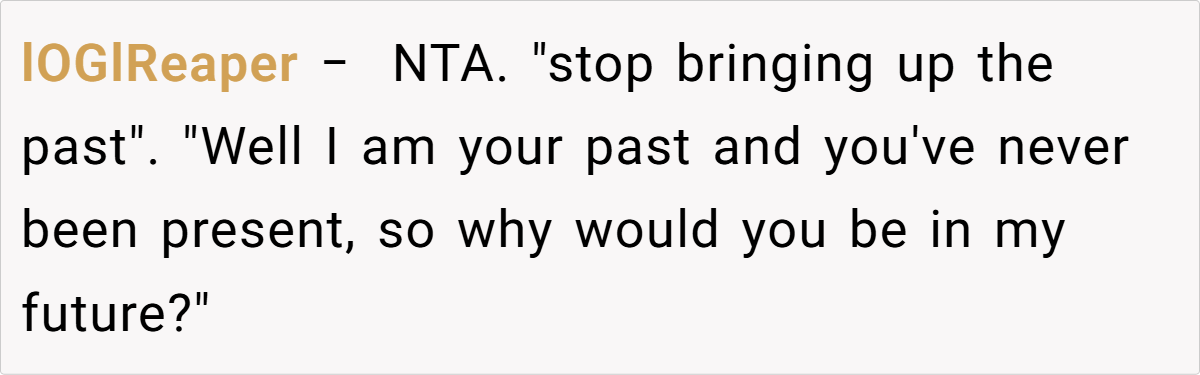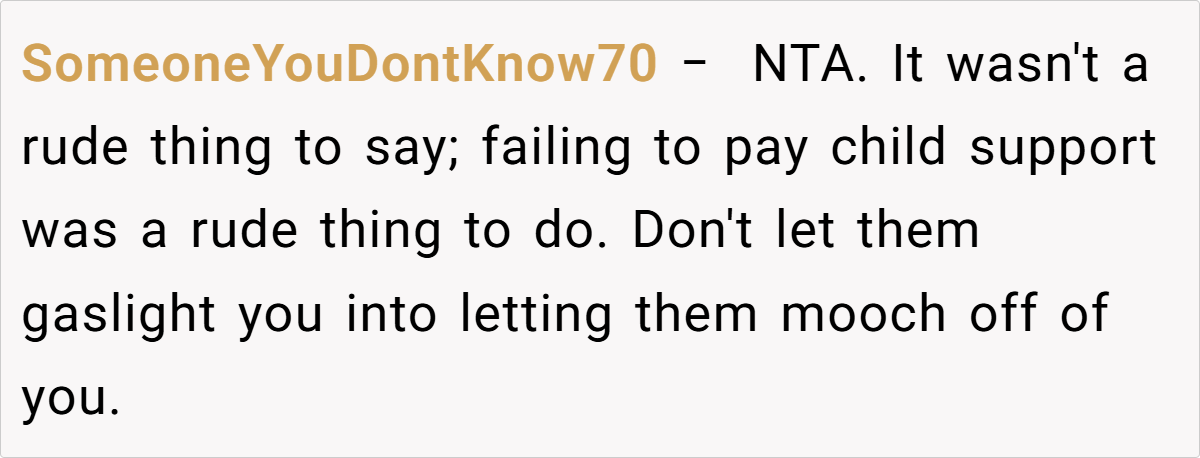 Dr. Carter also emphasizes that accountability plays a vital role in healing. “Revisiting past grievances isn’t about dragging up old issues—it’s about addressing unresolved pain.” OP’s pointed comment regarding child support is not an attack but a truthful reflection of her lived experience. It serves as a necessary reminder that actions have consequences, especially when they affect the trust in a familial relationship.