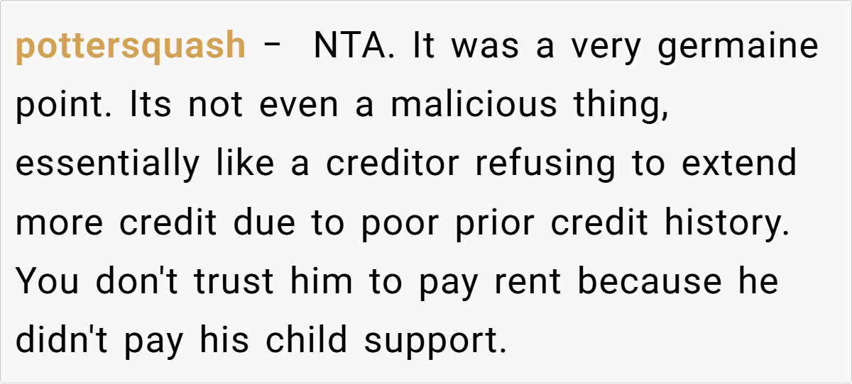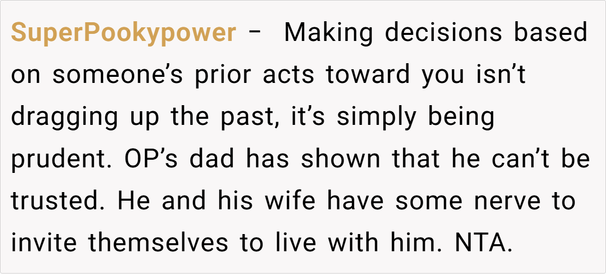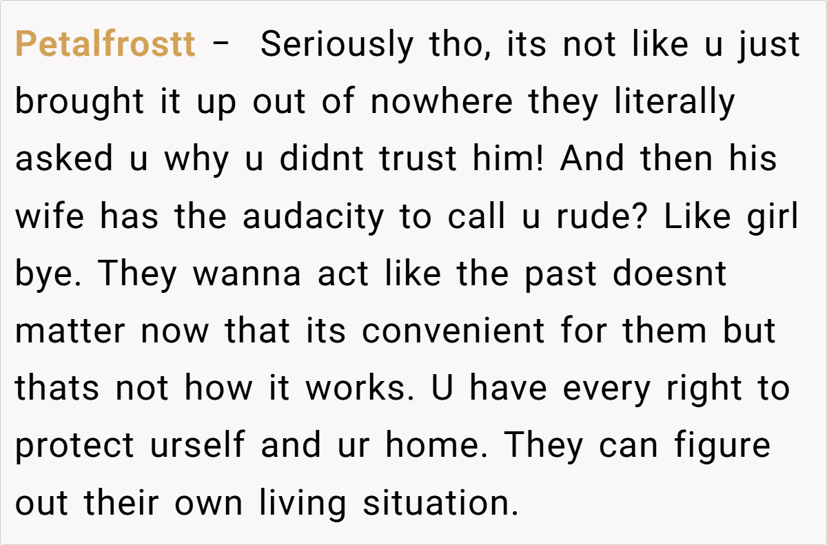 Many commenters agree that revisiting past behavior is not “dragging it up” but rather a necessary reminder of why she has every right to set clear boundaries. In essence, they feel that OP’s refusal to let him move in is a justified act of self-preservation and accountability, with most urging her to continue protecting her own well-being.