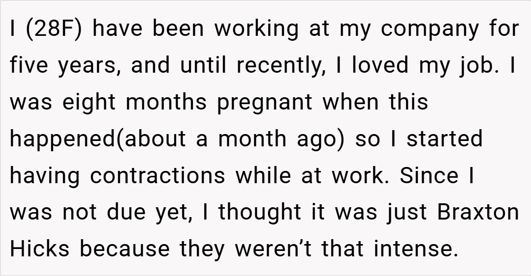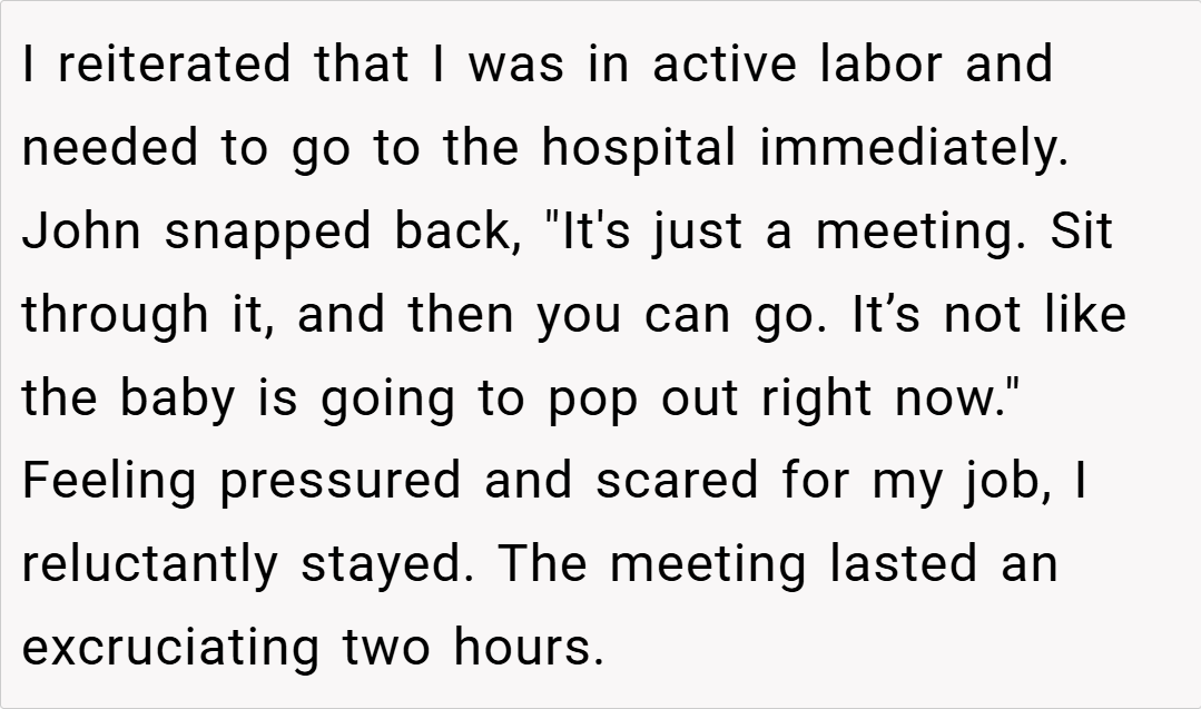 When your well-being is compromised by an employer’s insensitive demands, standing up for yourself isn’t just justified—it’s necessary. In today’s story, a 28-year-old woman recounts the harrowing experience of being forced by her boss to attend an important meeting despite being in active labor.