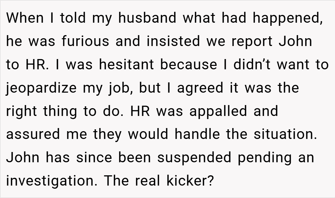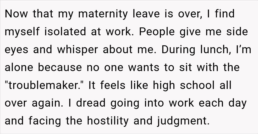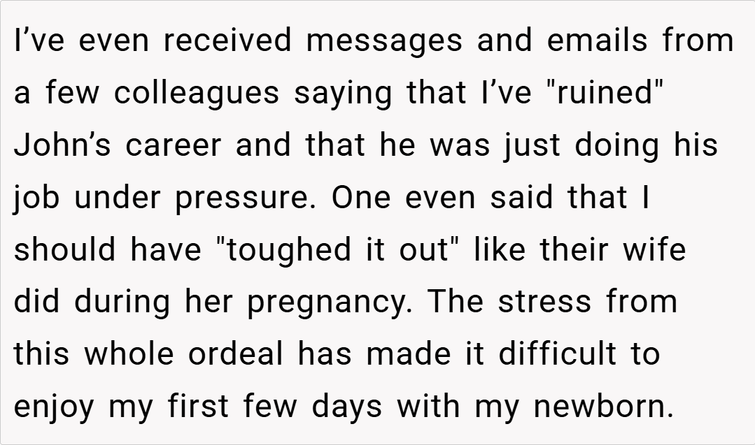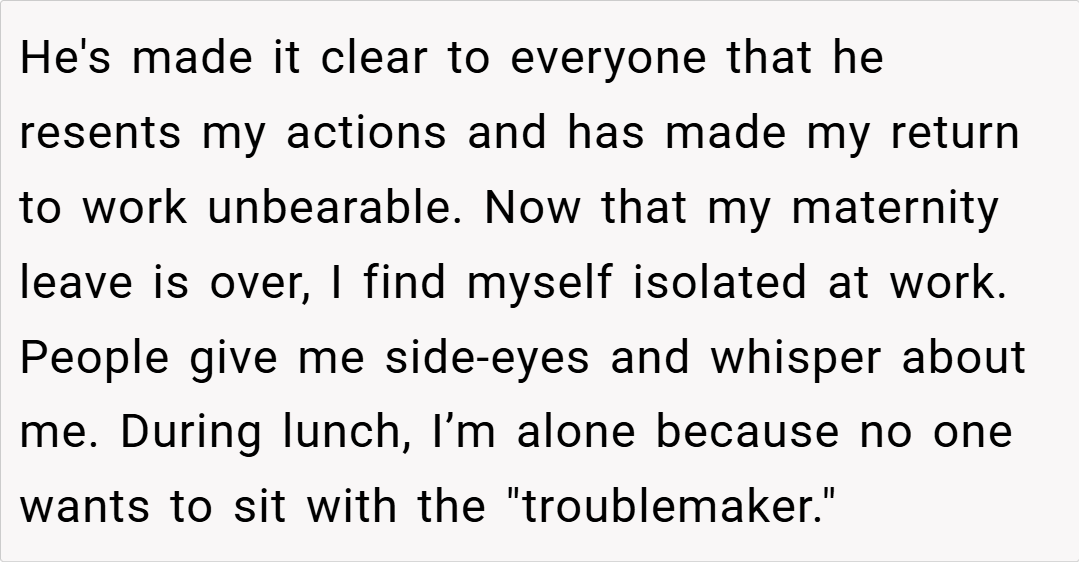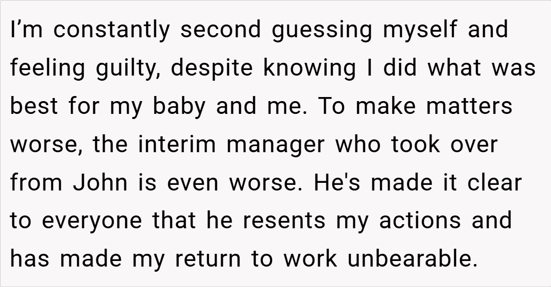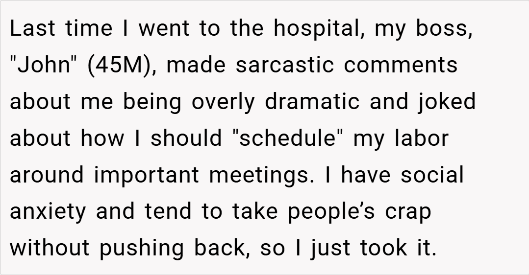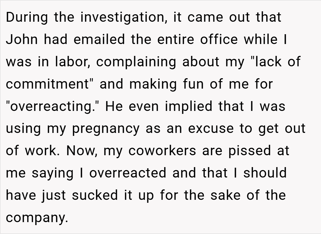 Despite clearly informing him that she needed to leave immediately for the hospital, her boss, “John,” brushed off her pleas and even mocked her condition in emails to the entire office. Feeling trapped and disrespected, she ultimately reported him to HR—a decision that has now resulted in his suspension but left her feeling isolated and judged by coworkers.