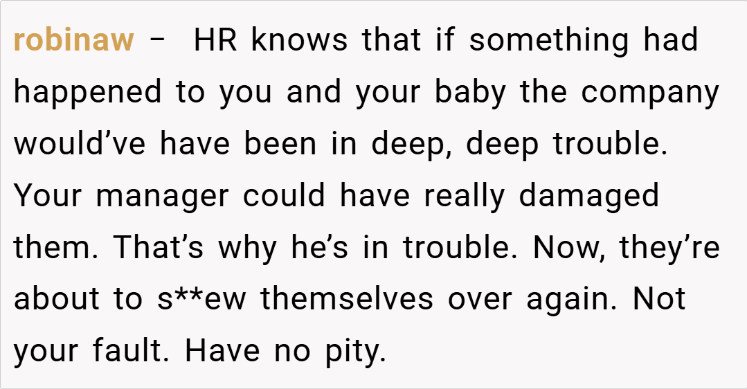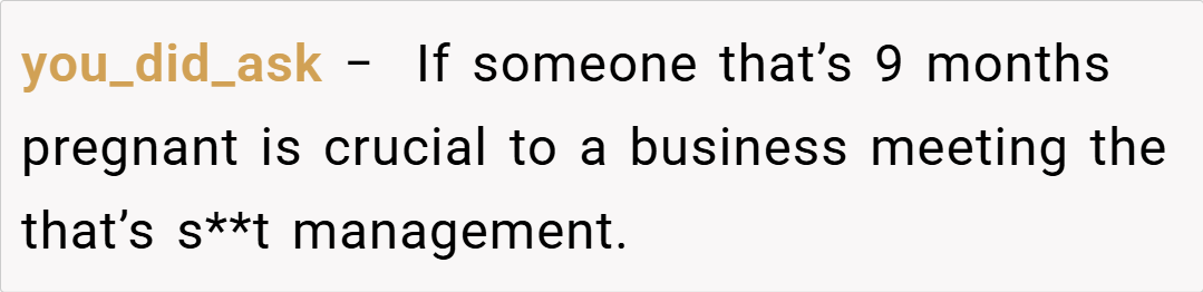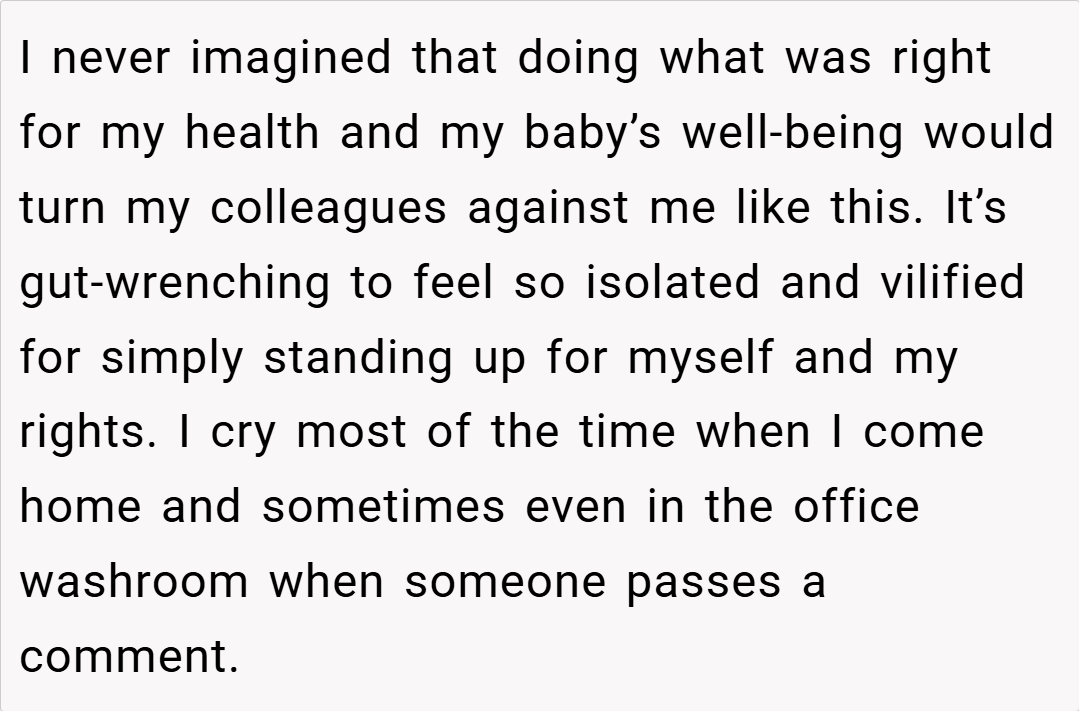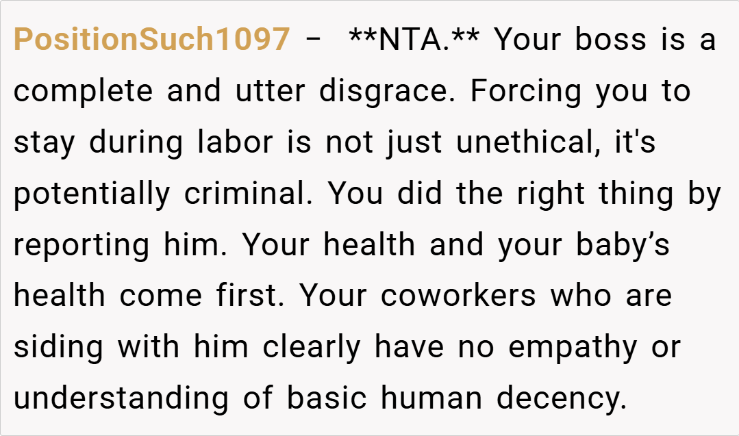 The online community has reacted strongly to this incident. In one comment block , many users expressed overwhelming support, commending her courage for standing up for herself and her unborn child. One commenter wrote, “NTA—your health and your baby’s well-being should always come first. No job is worth risking your life.”