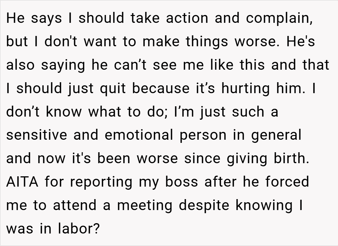 ‘ AITA for reporting my boss after he forced me to attend a meeting despite knowing I was in labor?’