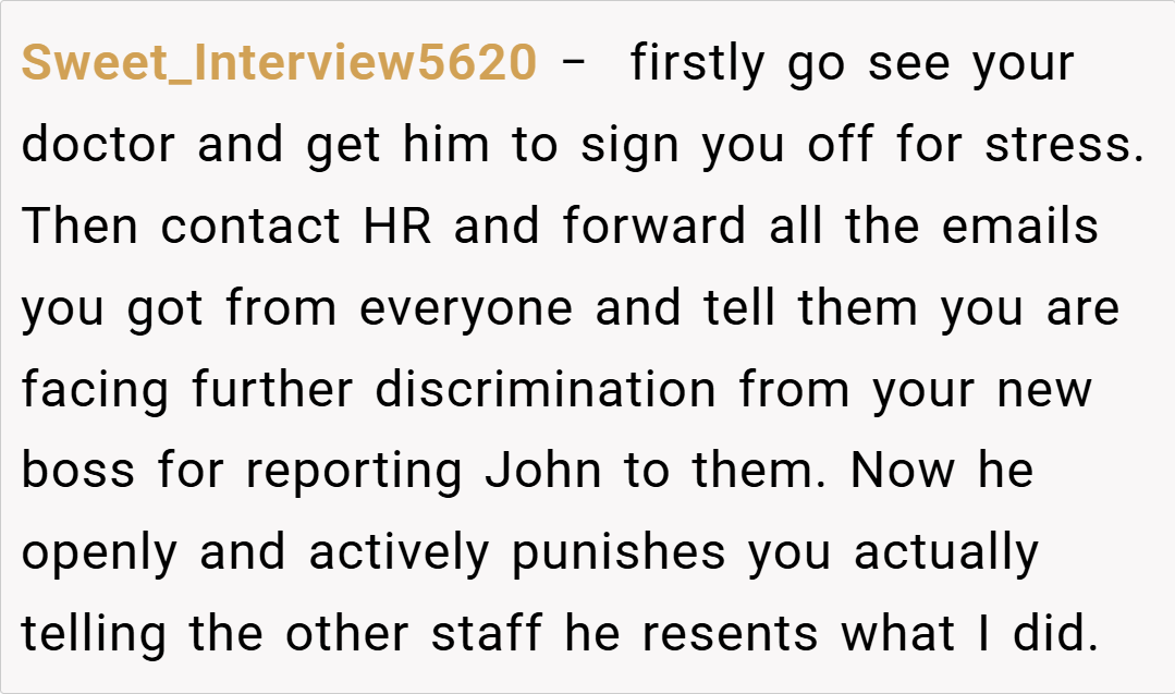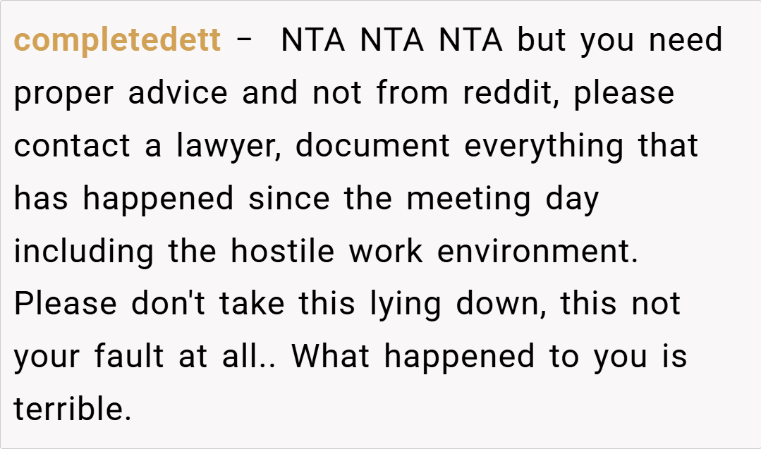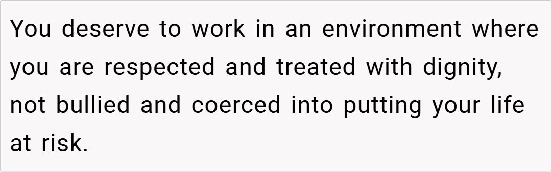 Conversely, a few voices in a third comment block questioned whether the decision to report might negatively affect her career in the long run. However, the prevailing sentiment was that protecting one’s health and legal rights is paramount, even if it creates temporary workplace tension.