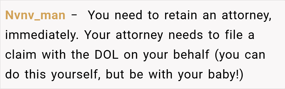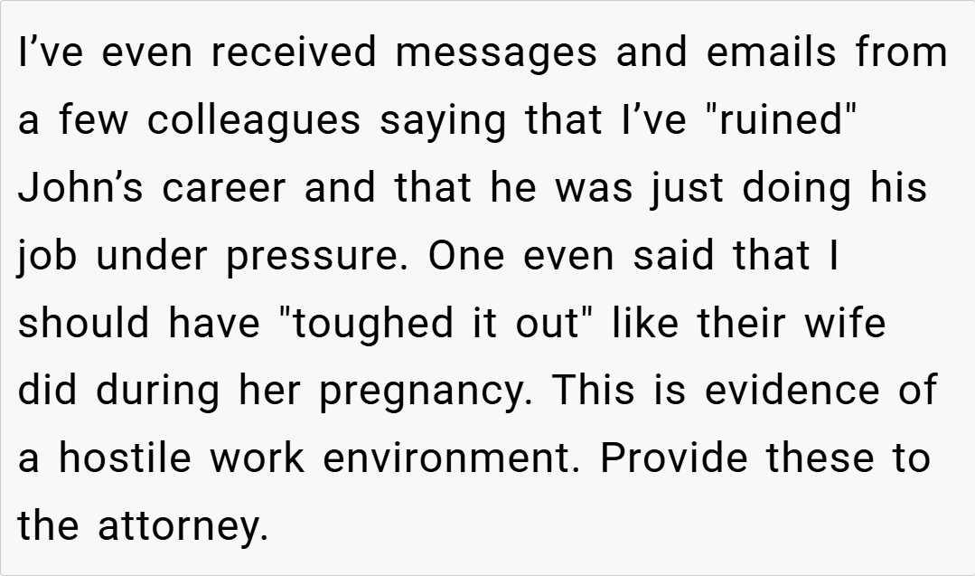 Family and workplace wellness experts also point out that such behavior creates a hostile work environment. Dr. Alan Rivera, an occupational psychologist, adds, “When your employer trivializes your physical pain and forces you to work during such a vulnerable time, it sends a message that your well-being is expendable. Reporting this behavior is not only justified—it’s essential to protect others from similar mistreatment.”