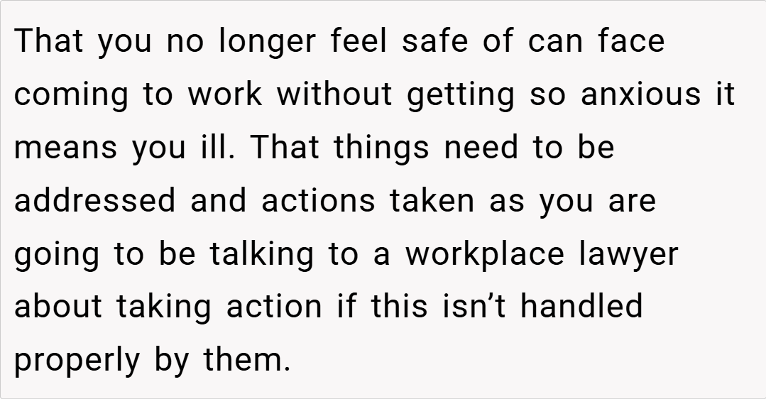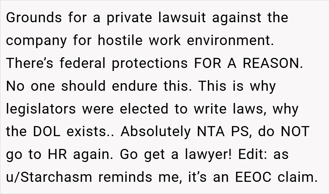 We invite you to share your thoughts and experiences: Have you or someone you know faced similar challenges at work? How did you handle it? Let’s discuss ways to support each other in advocating for a safer, more respectful work environment.