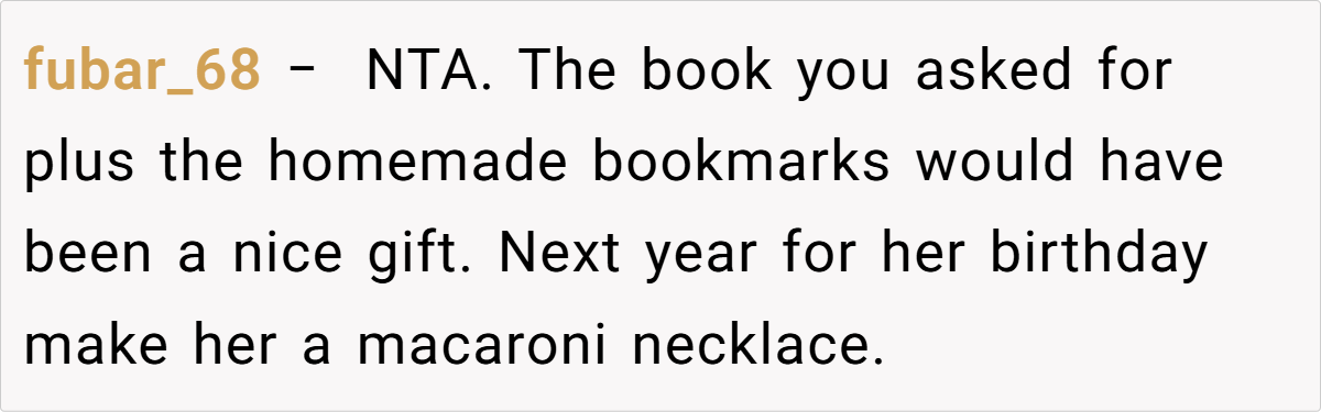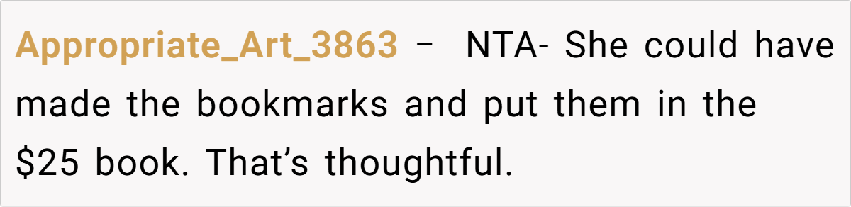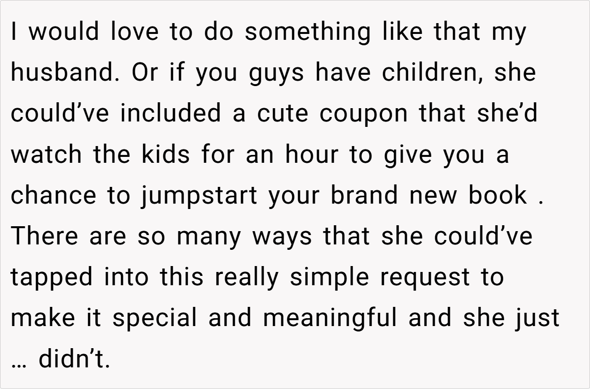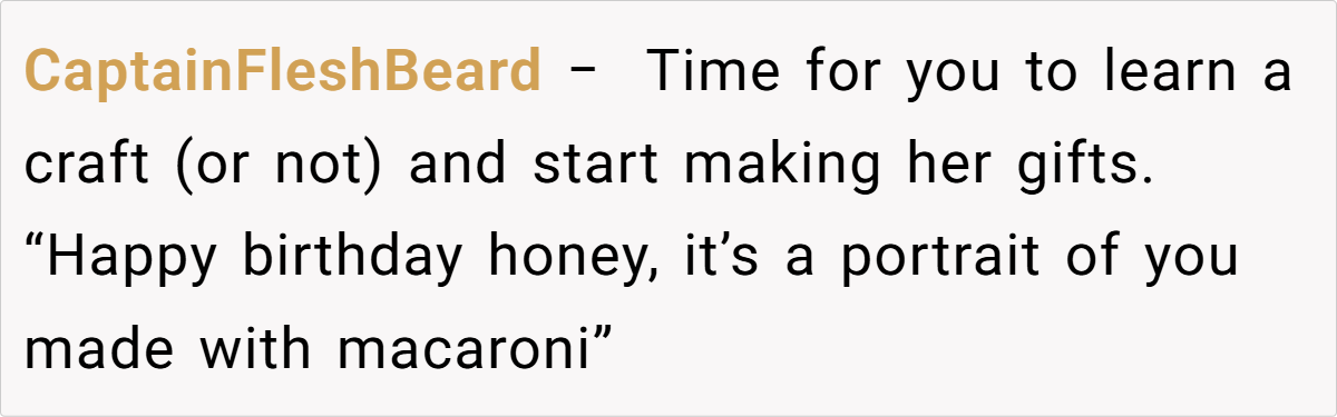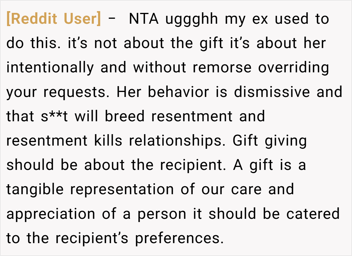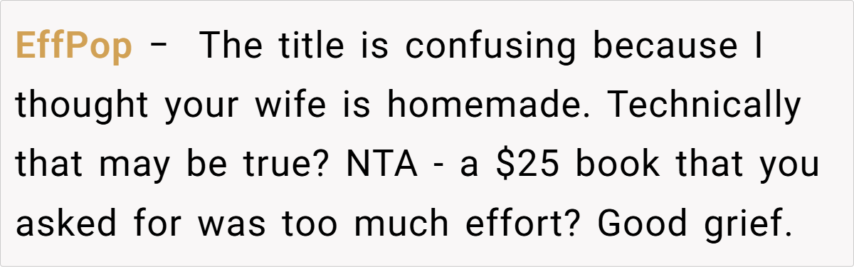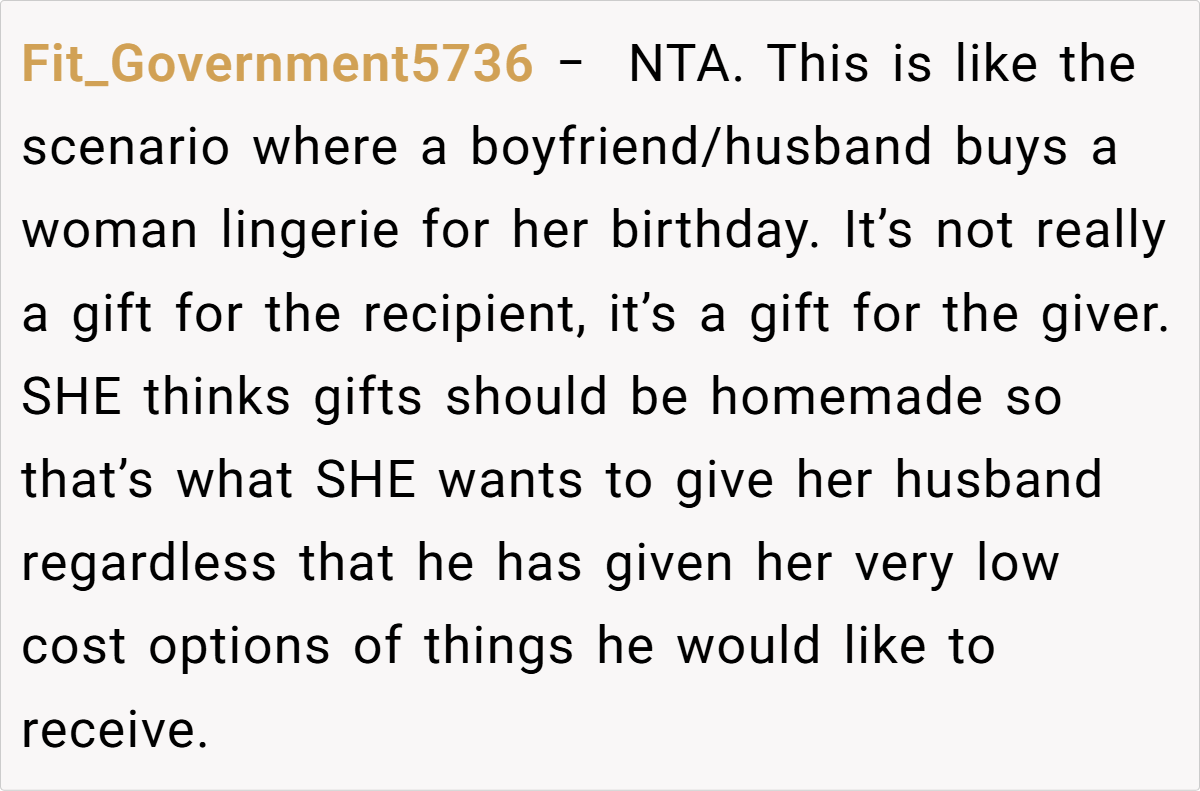 Here are some hot takes from the Reddit community—candid and humorous. The comments reveal a spectrum of opinions, from pragmatic suggestions to witty jabs about mismatched expectations. Many Redditors empathize with the husband’s frustration, noting that a heartfelt, well-aligned gift is about knowing and respecting personal preferences. These popular opinions highlight that while creativity is appreciated, the recipient’s voice should never be overlooked.