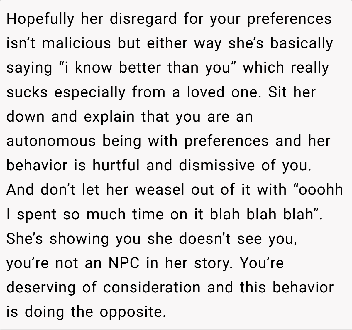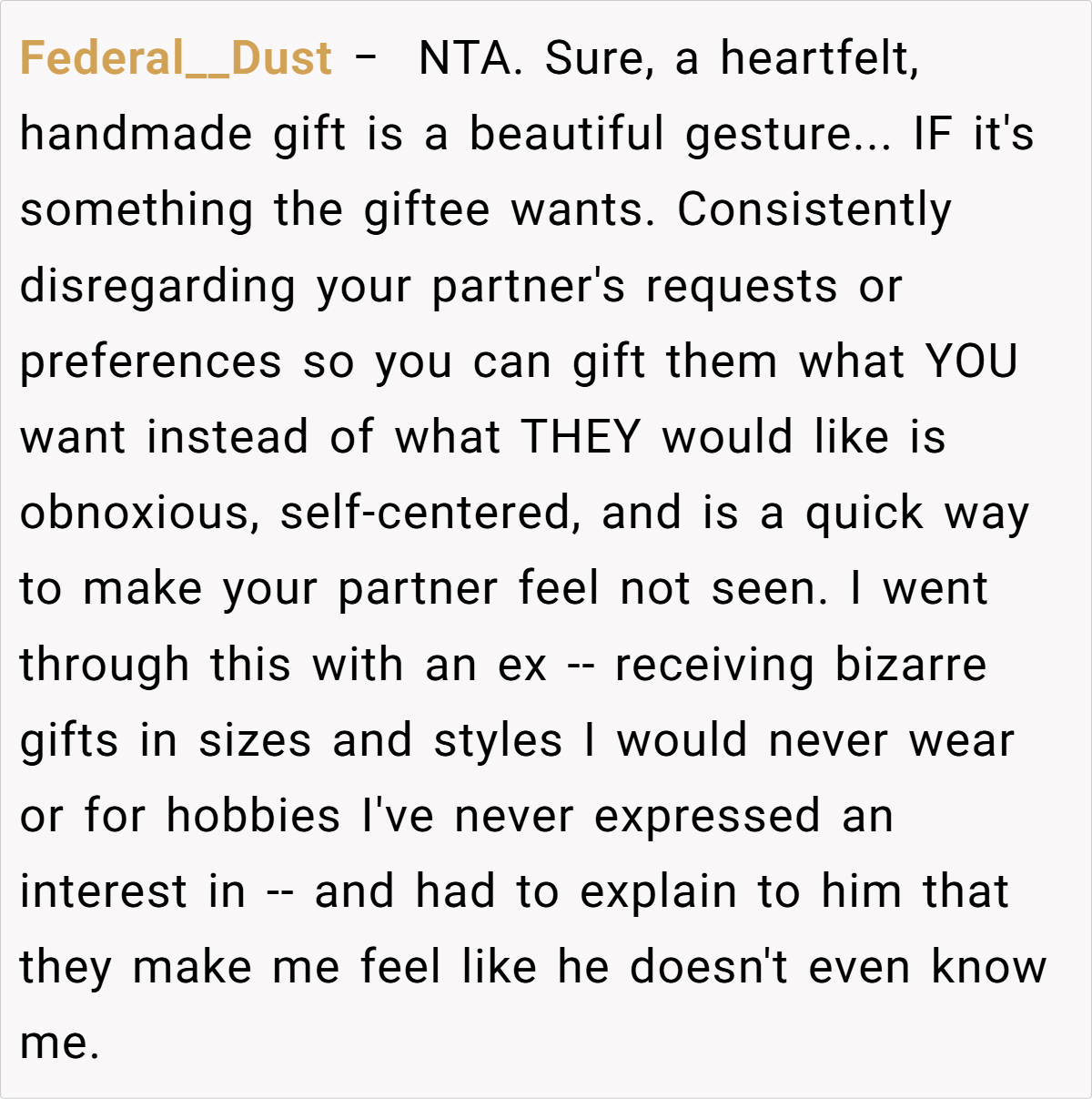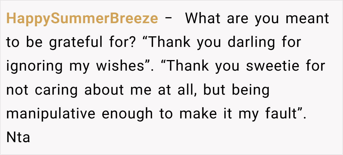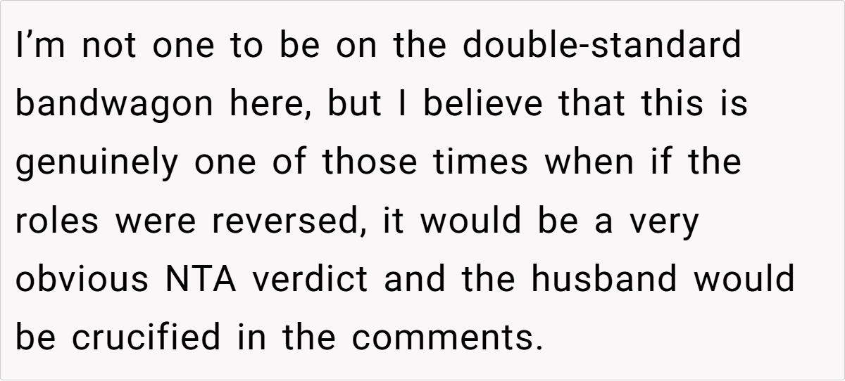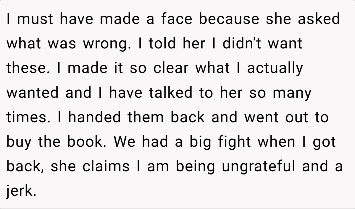 Here are some hot takes from the Reddit community—candid and humorous. The comments reveal a spectrum of opinions, from pragmatic suggestions to witty jabs about mismatched expectations. Many Redditors empathize with the husband’s frustration, noting that a heartfelt, well-aligned gift is about knowing and respecting personal preferences. These popular opinions highlight that while creativity is appreciated, the recipient’s voice should never be overlooked.