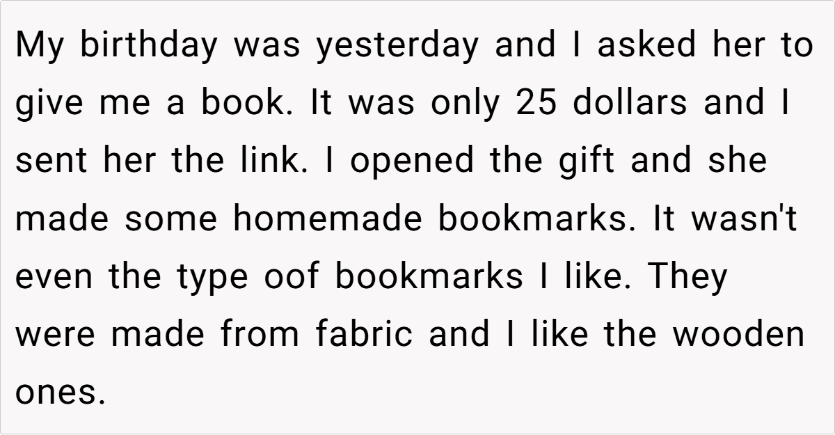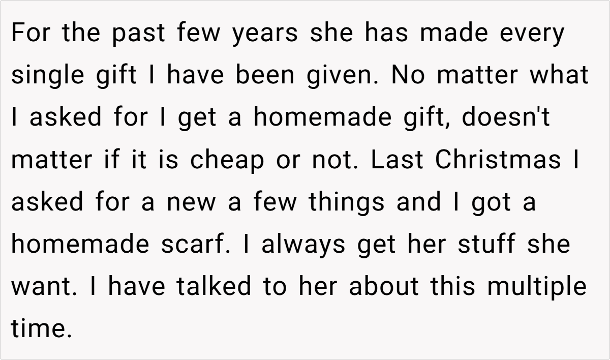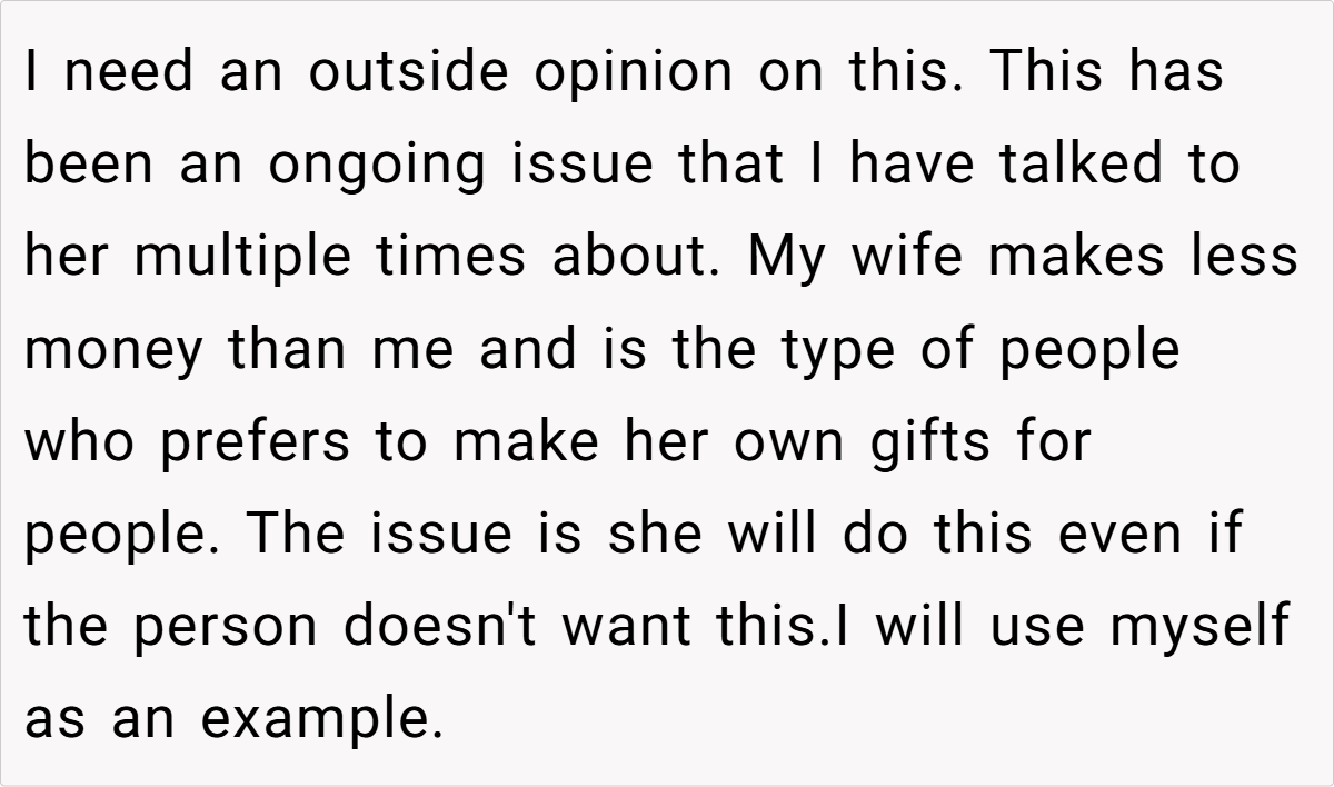 In the warm glow of everyday life, one might expect that gift-giving would be an act of love and understanding. Yet, sometimes even the best-intentioned gestures can spark unexpected tension. Our story today revolves around a husband who has repeatedly expressed his desire for store-bought gifts, only to receive lovingly crafted homemade versions that miss the mark. This recurring issue has slowly eroded his sense of being truly heard, leaving him torn between appreciating the effort and feeling misunderstood.