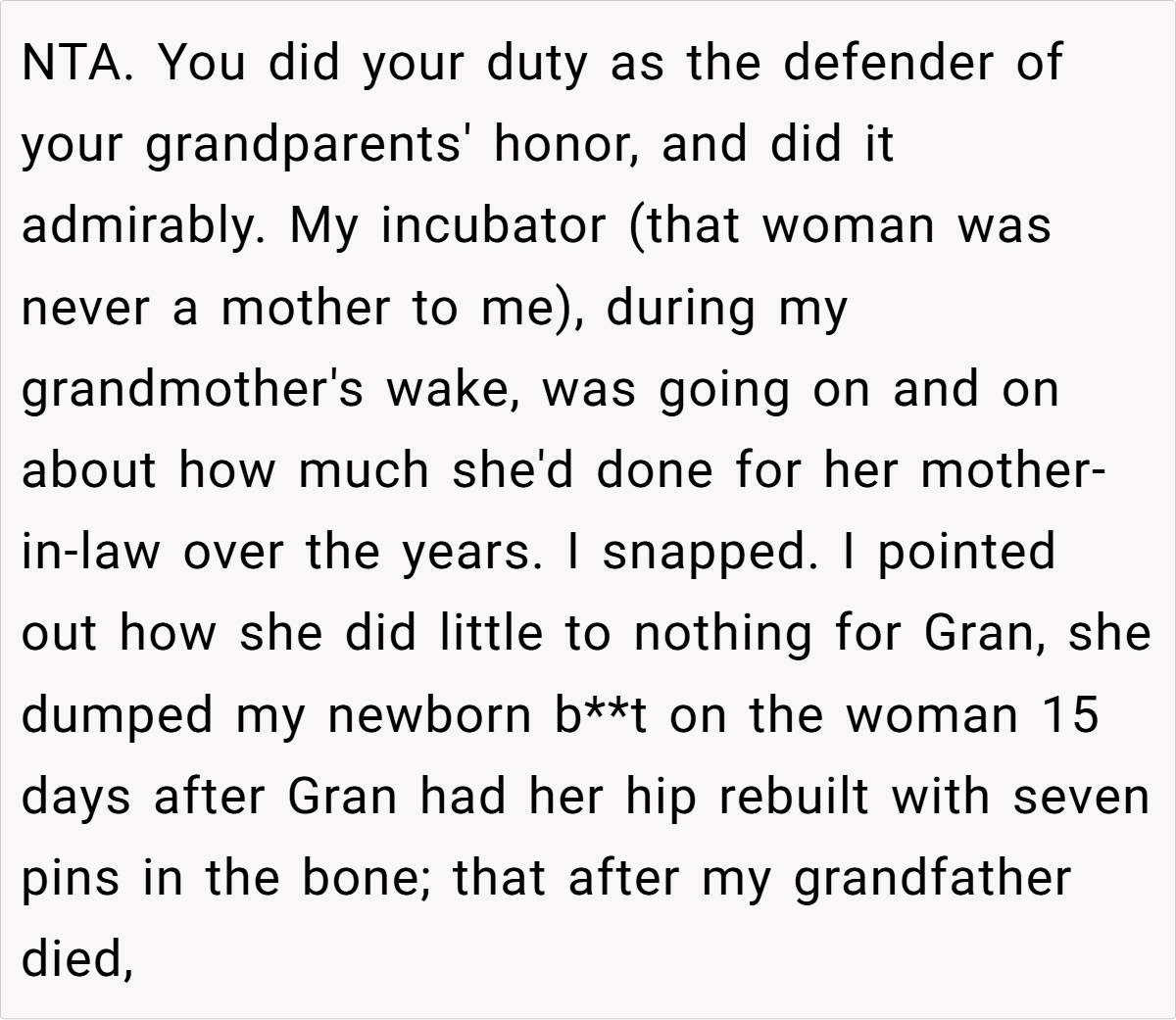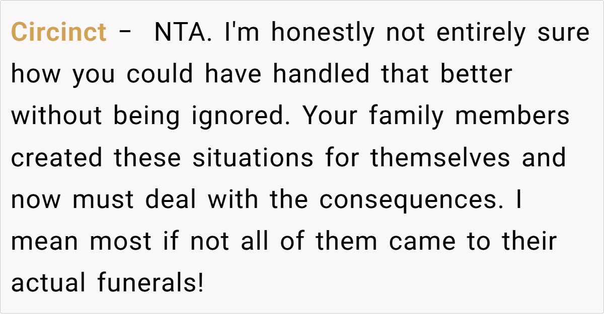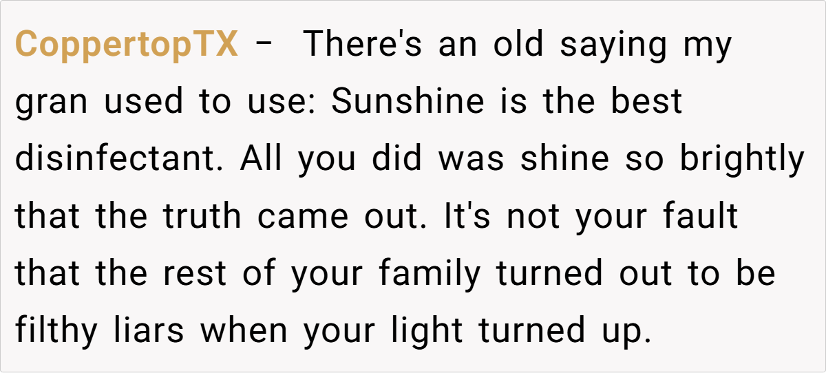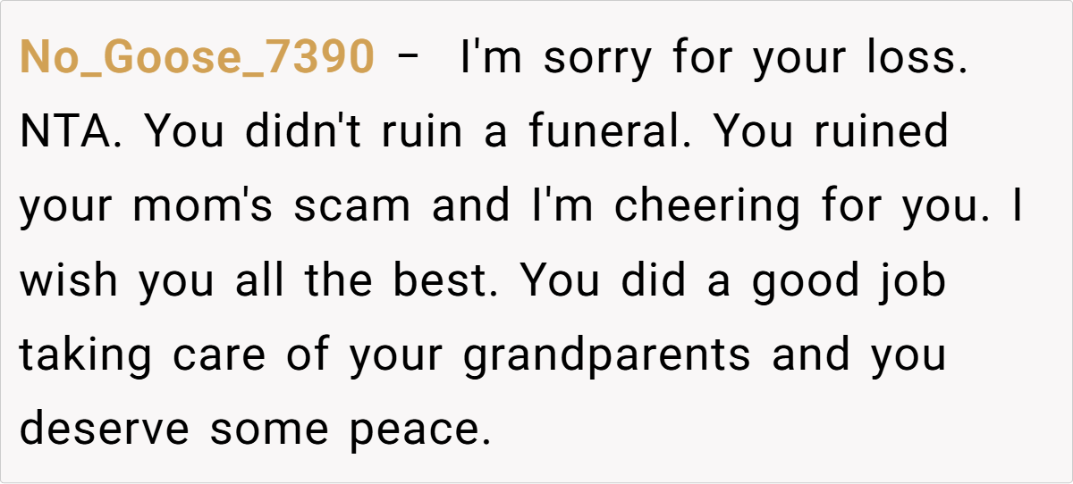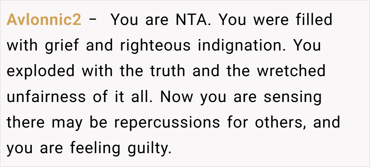 The Reddit community largely backs the OP’s raw honesty and condemns the deceit that permeated her family’s actions. Many users argue that exposing such hypocrisy—especially amid profound grief—is not only justified but necessary for healing. [comment block] One user stated, “NTA. You did what needed to be done to bring the truth to light.”