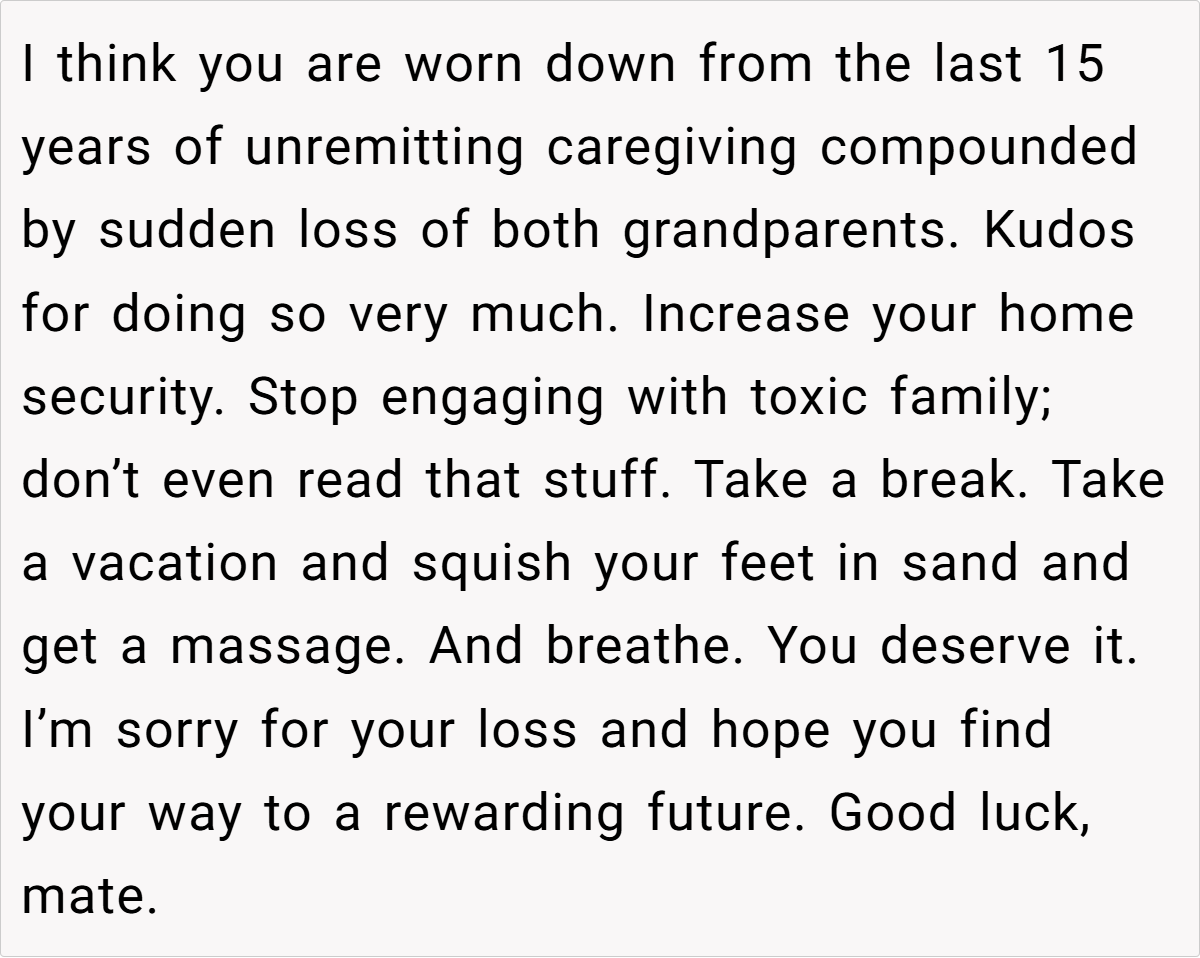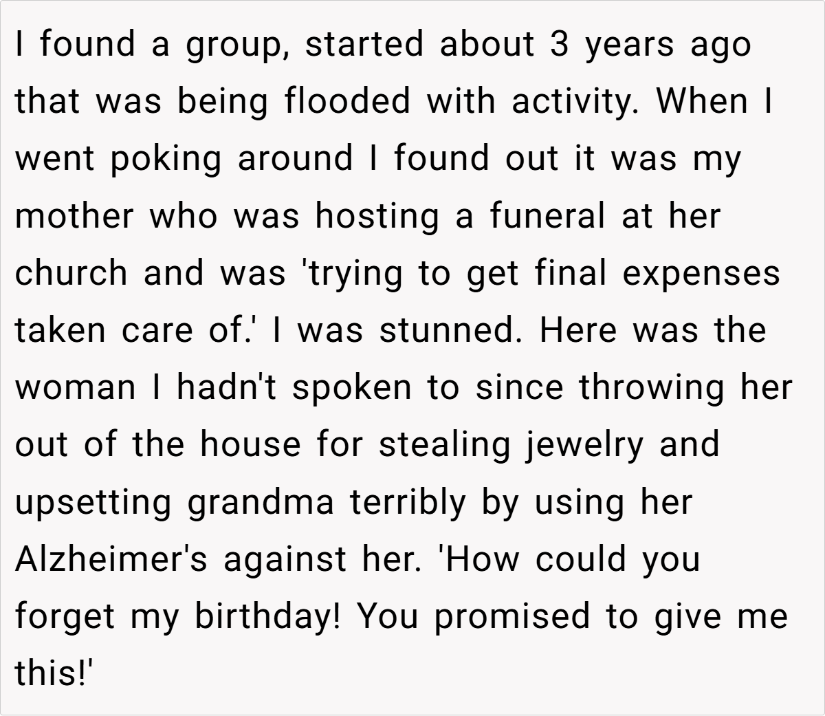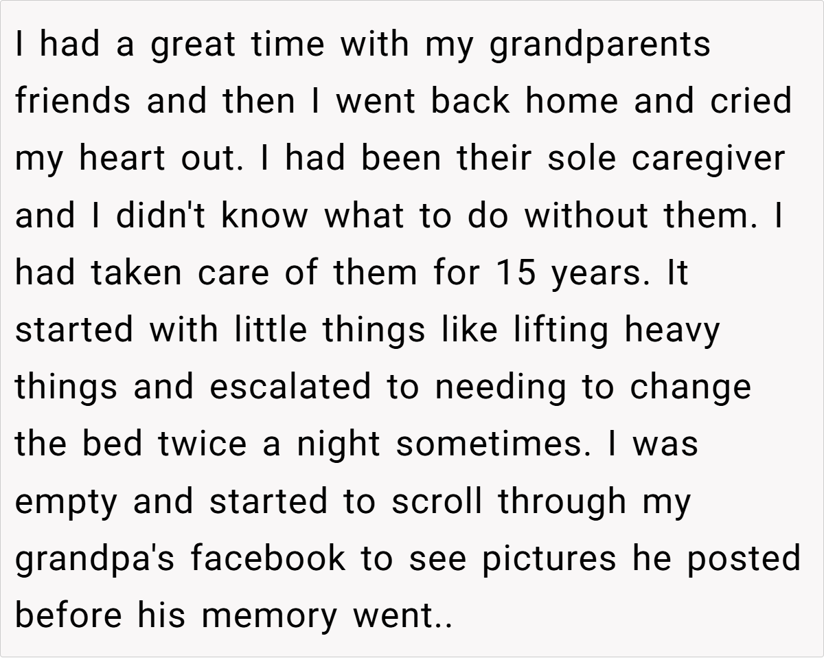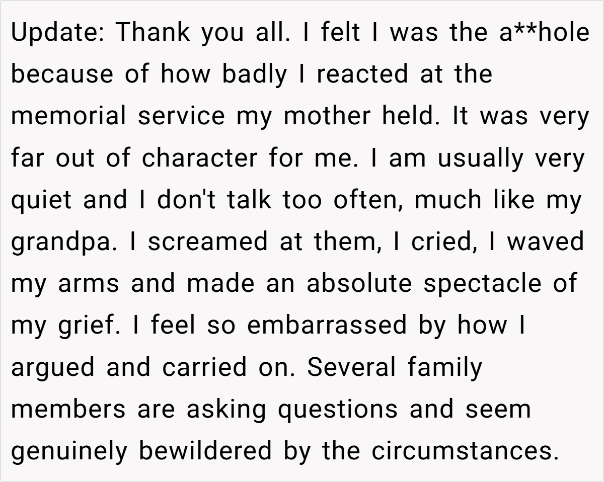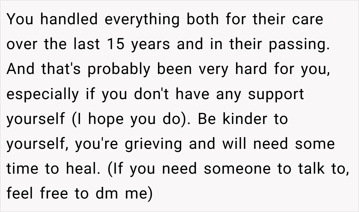 Dealing with the loss of loved ones is never simple, especially when the emotional burden of caregiving, grief, and betrayal collide. According to renowned grief counselor Dr. Alan Wolfelt, “The only cure for grief is to grieve.” This statement encapsulates the raw truth of the situation—our emotions, even when they burst forth in uncontrolled outbursts, are part of the healing process. In this case, the OP’s explosive reaction, though uncharacteristic, was fueled by years of loneliness and the immense weight of responsibility she carried as the sole caregiver.