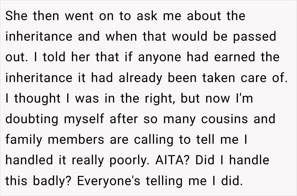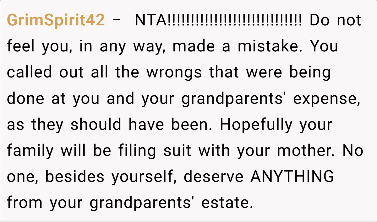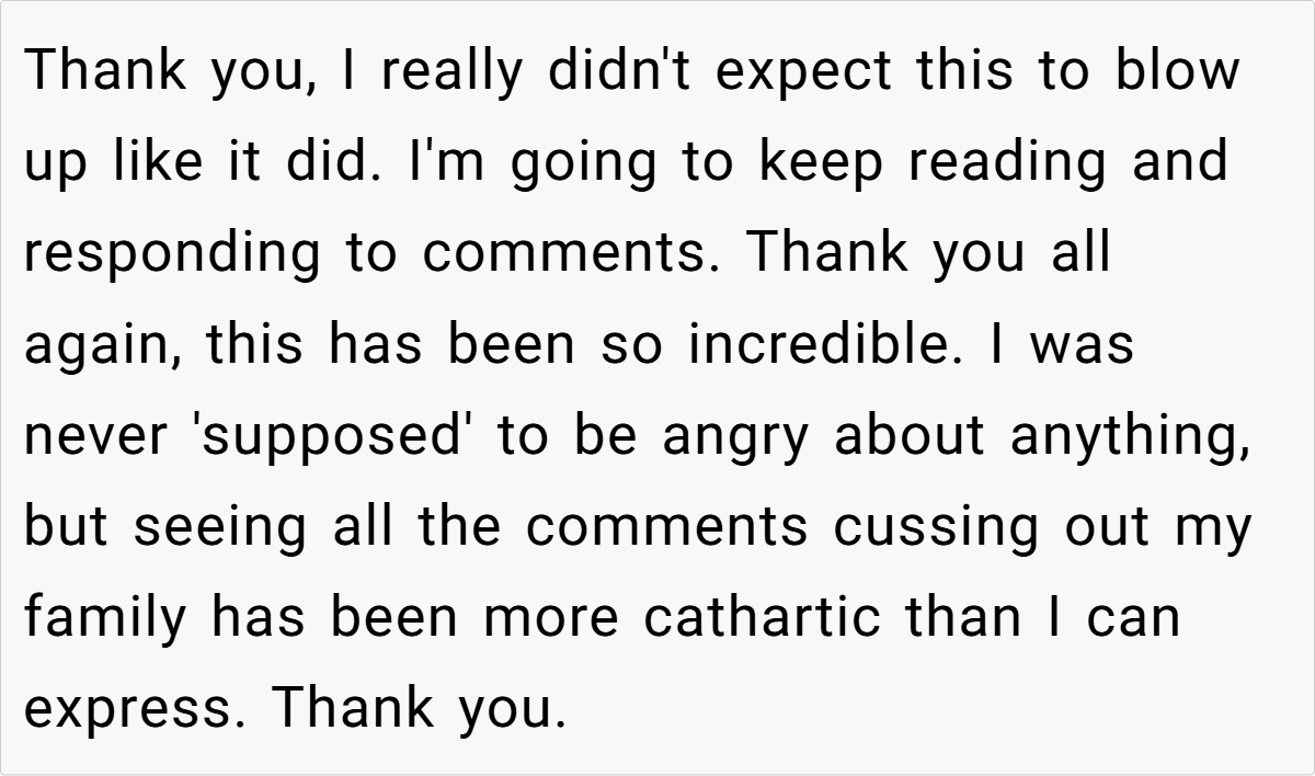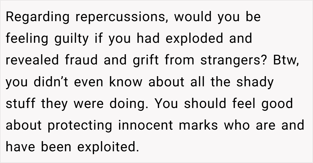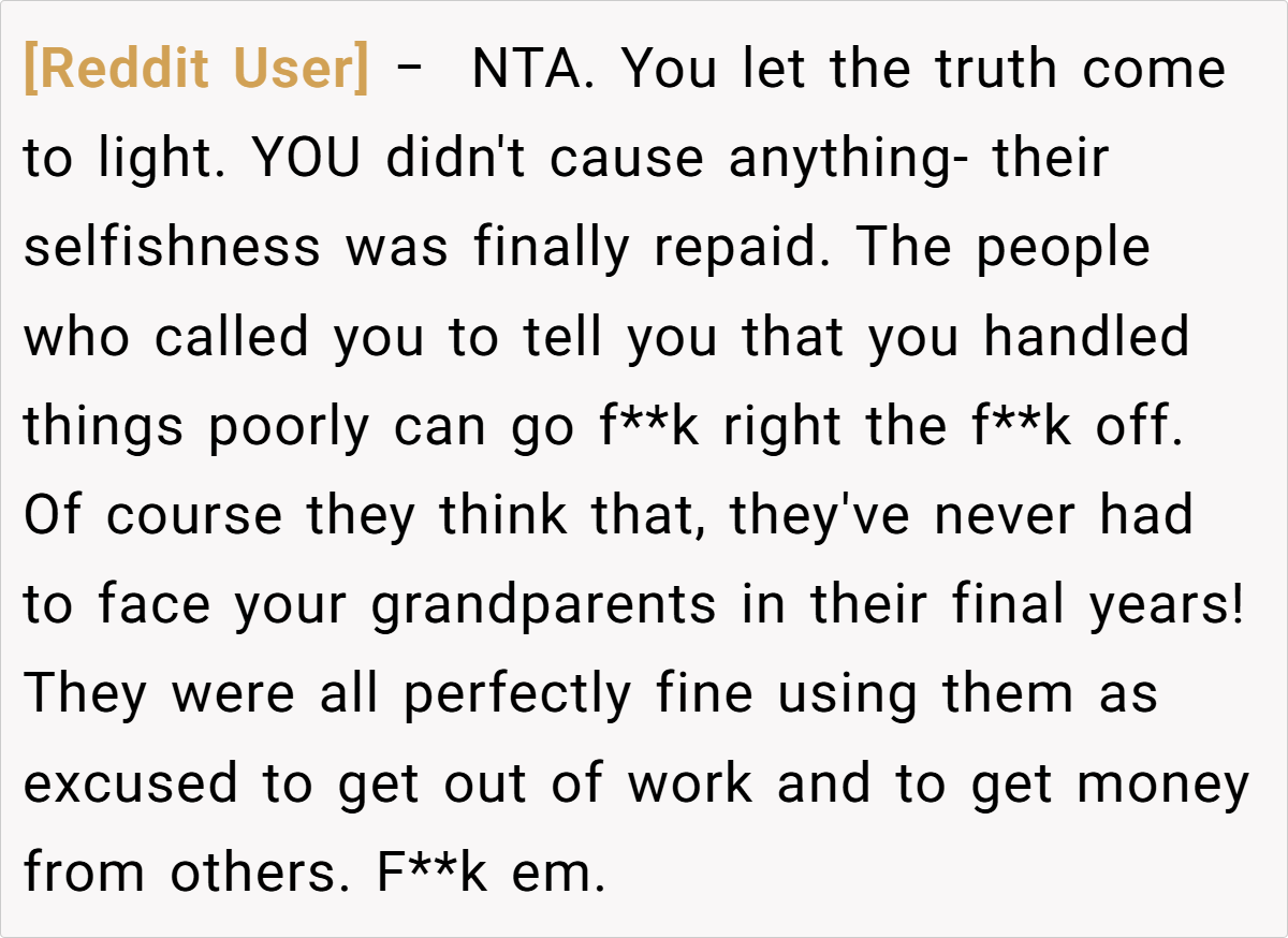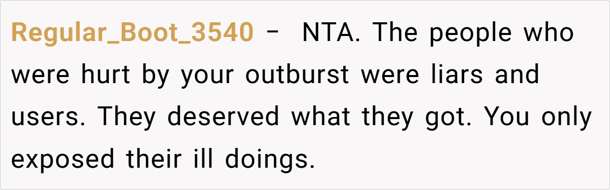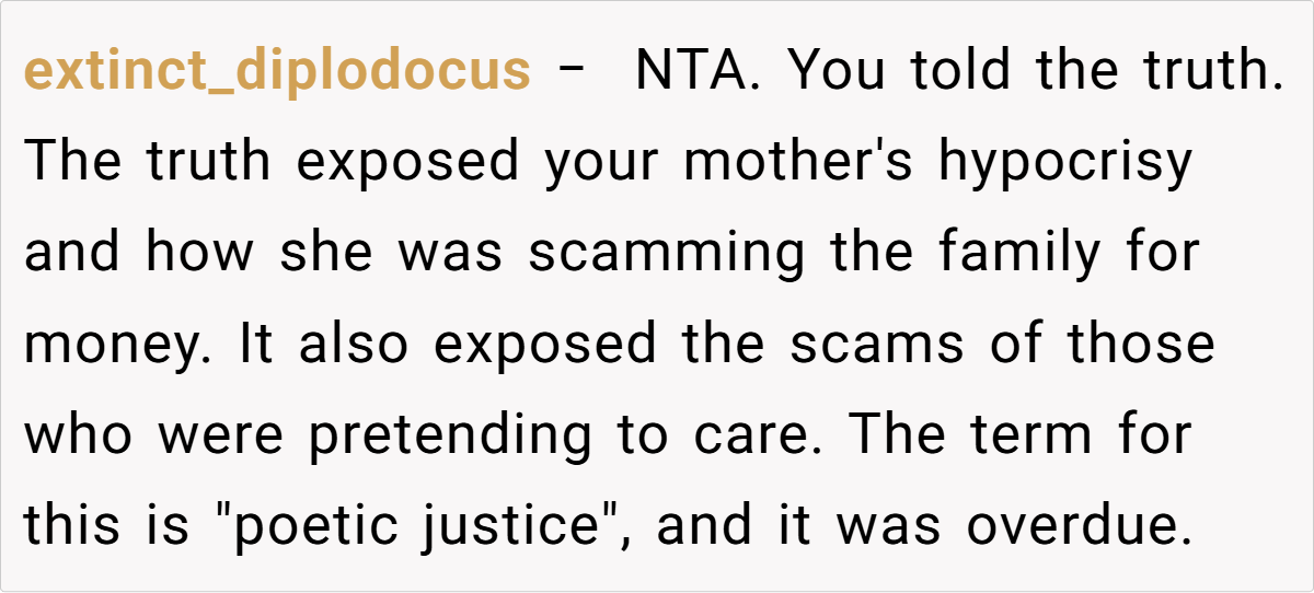 In this case, the OP’s revelation about her mother’s financial manipulation and the deceitful practices of her relatives was not merely an emotional vent—it was a cry for recognition and rectification of past wrongs. Even if her reaction was dramatic, it underscored a deeper need for truth and accountability in a family where appearances had long masked exploitation.