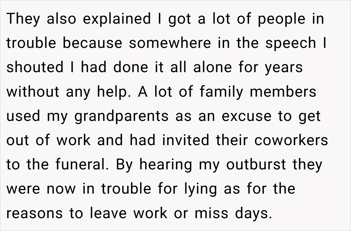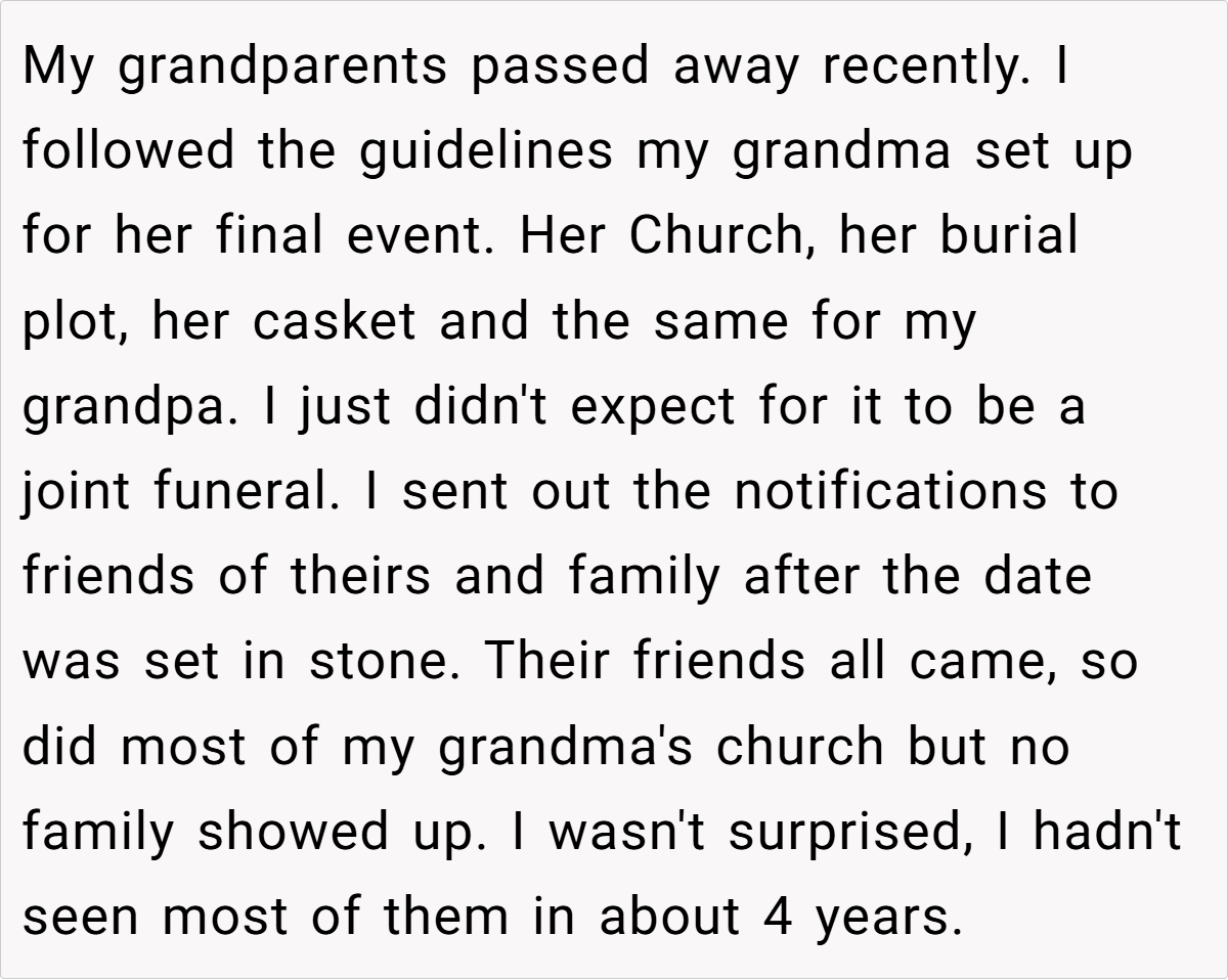 Grief has a way of unearthing family secrets and long-buried resentments in the most unexpected moments. In this raw and unfiltered account, a young caregiver shares the bittersweet farewell to her beloved grandparents—whom she cared for 15 long years—and the painful family drama that erupted during their joint funeral. While she honored her grandparents’ final wishes, the day quickly turned into a battleground of accusations, deception, and hurt feelings, leaving her questioning whether her outburst was justified.