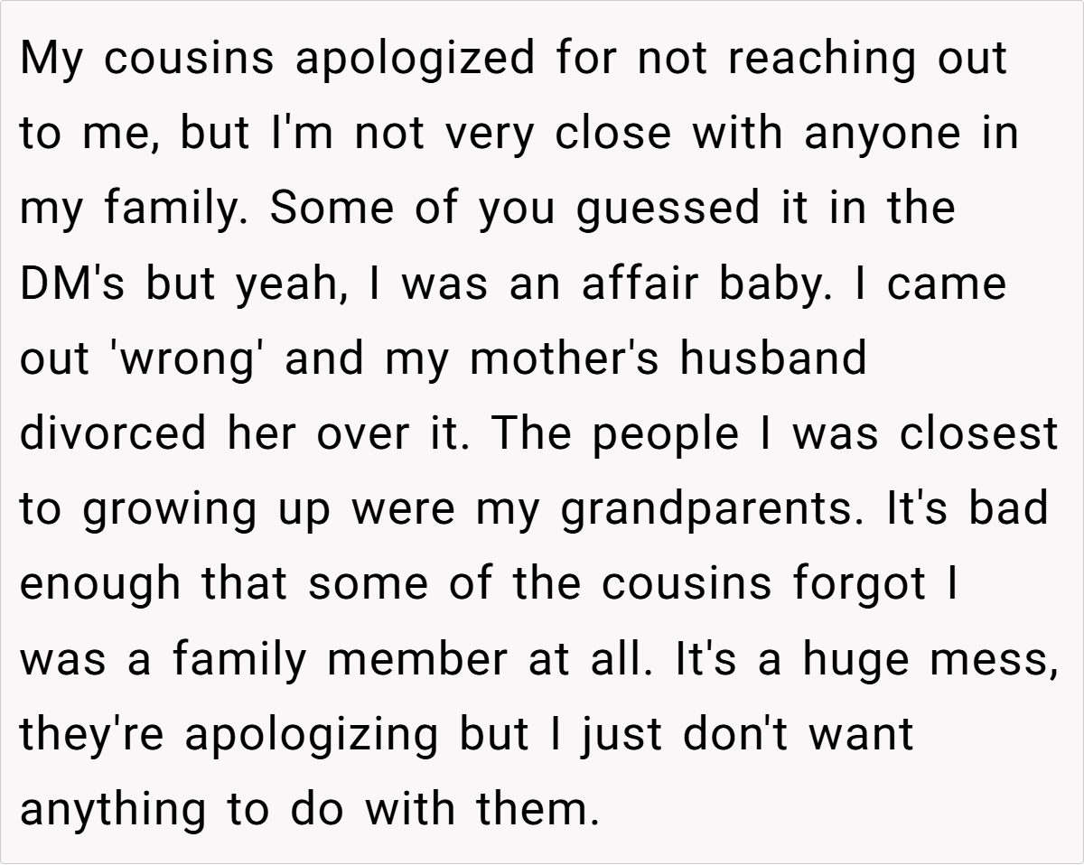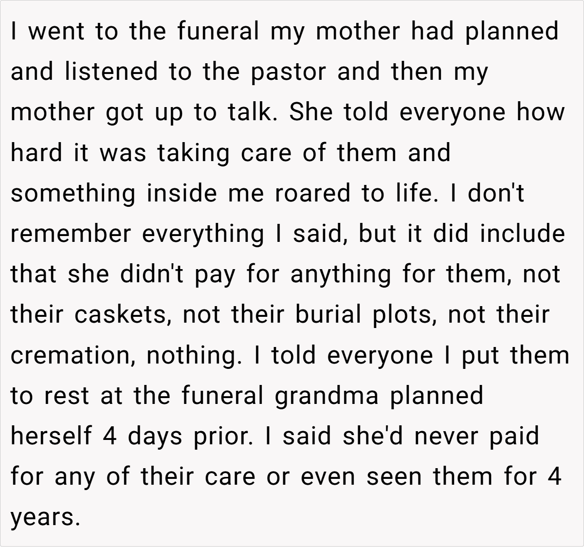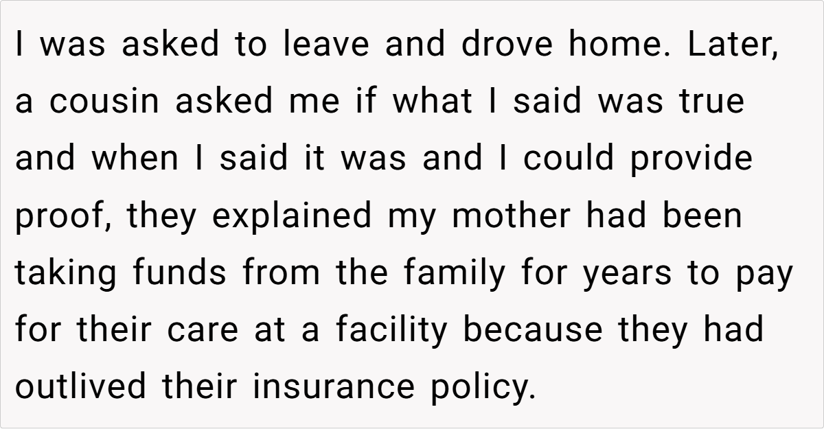 Experts in family dynamics note that unresolved issues from the past can become magnified during times of loss. The OP’s outburst wasn’t just a spontaneous lapse in decorum—it was the culmination of years of feeling abandoned, exploited, and misunderstood by a family that seemed more interested in money and appearances than genuine care.