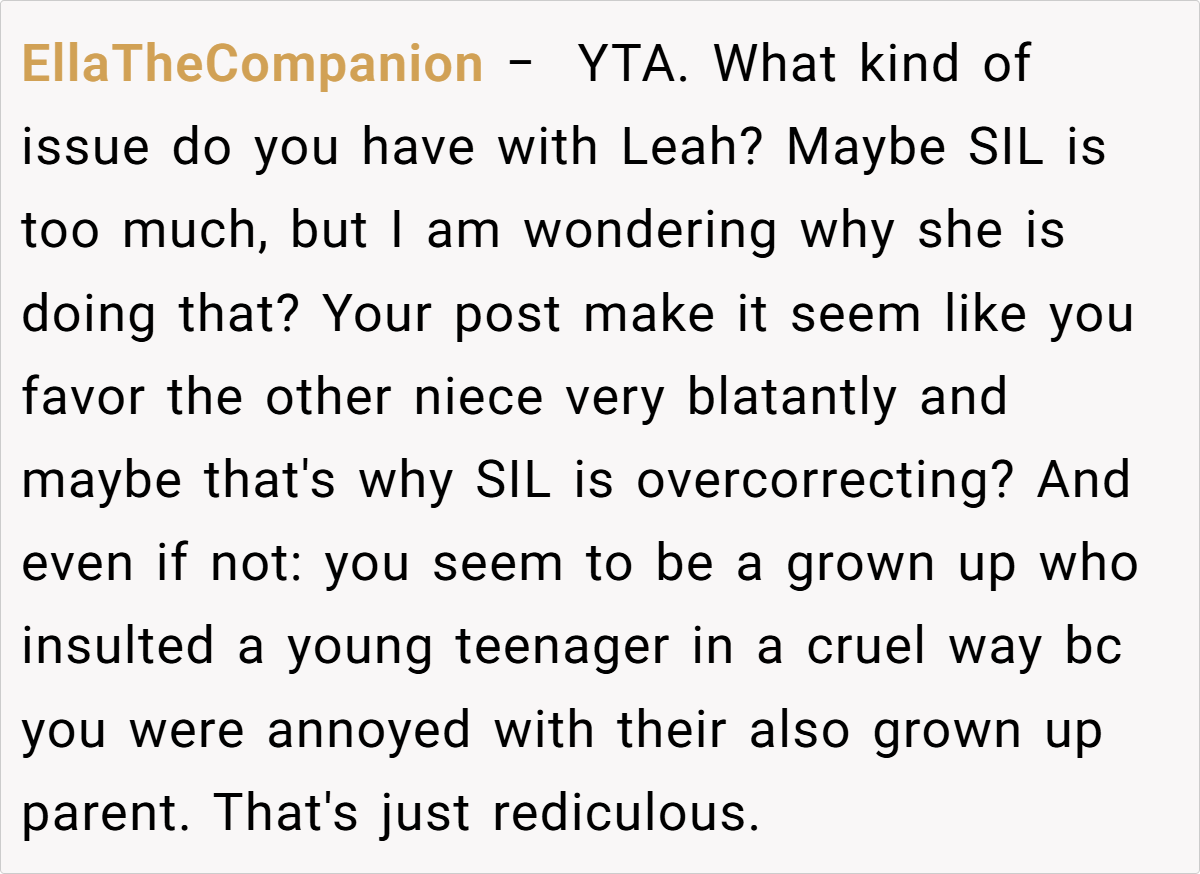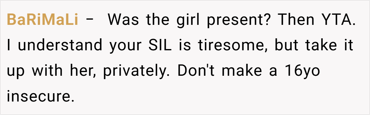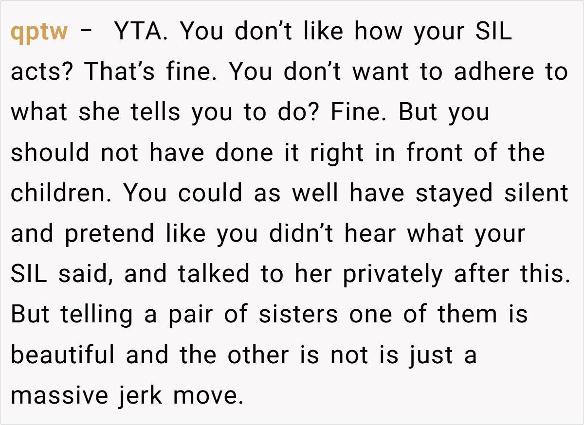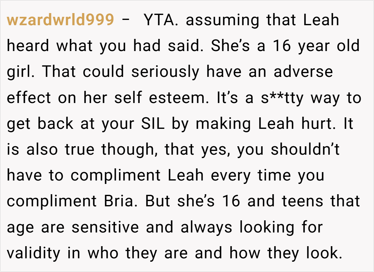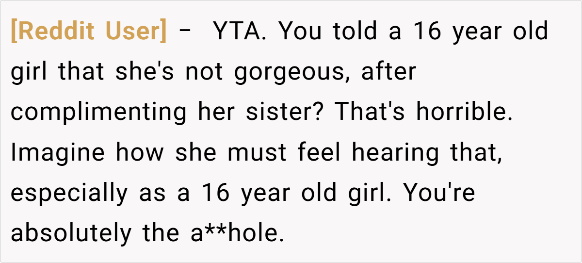 The comments largely suggested that OP’s actions were inappropriate. Most Redditors felt that publicly calling SIL’s daughter “ugly” was insensitive, especially when it involved a vulnerable teenager. They felt that OP should resolve the issue privately with SIL instead of leaving the child to suffer the consequences of an adult conflict. Some also pointed out that OP’s actions reflected obvious bias, which further complicated the situation and could potentially damage the girl’s self-esteem.