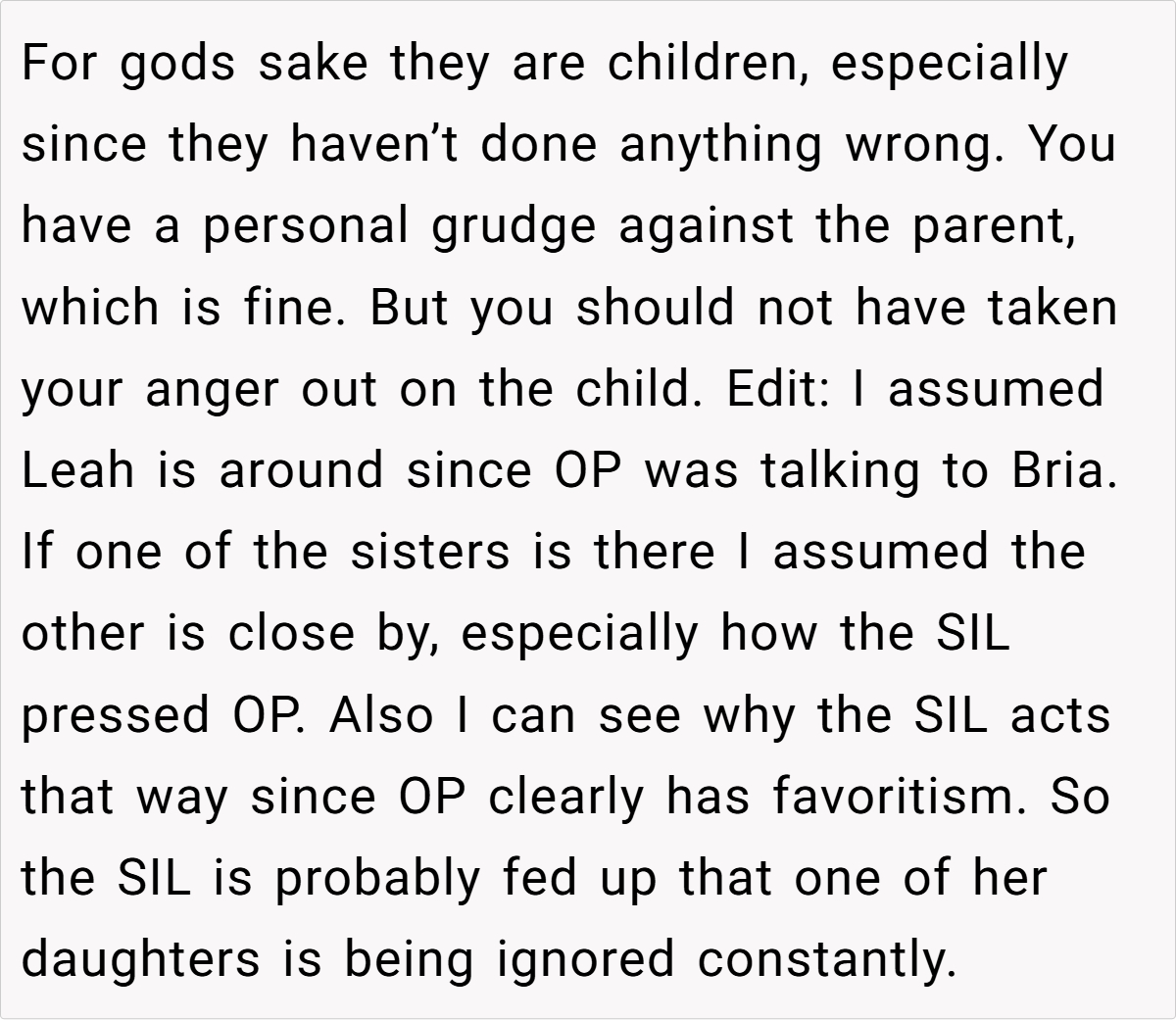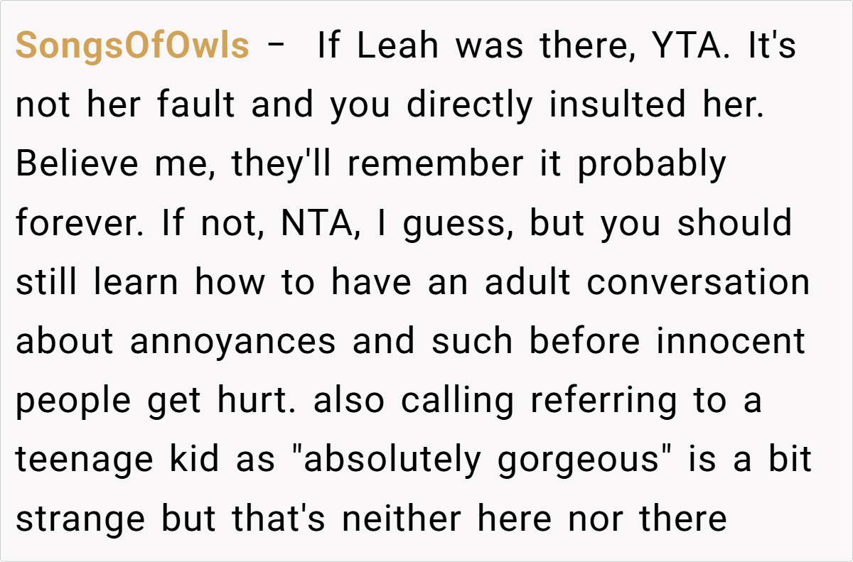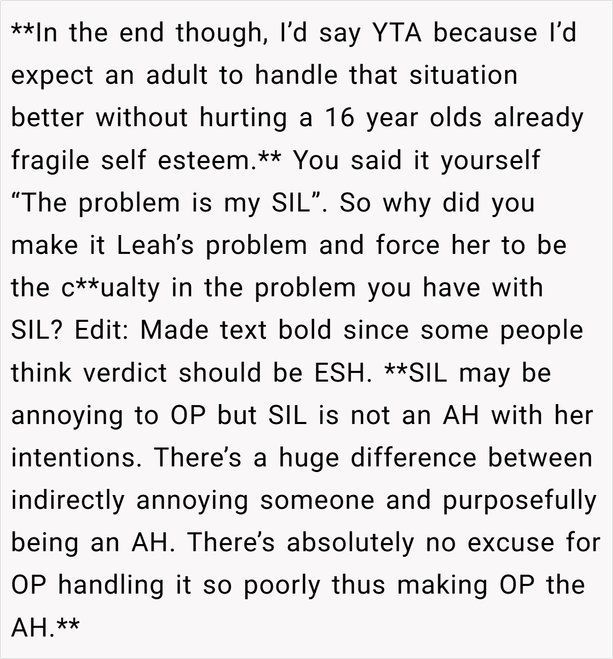 The comments largely suggested that OP’s actions were inappropriate. Most Redditors felt that publicly calling SIL’s daughter “ugly” was insensitive, especially when it involved a vulnerable teenager. They felt that OP should resolve the issue privately with SIL instead of leaving the child to suffer the consequences of an adult conflict. Some also pointed out that OP’s actions reflected obvious bias, which further complicated the situation and could potentially damage the girl’s self-esteem.