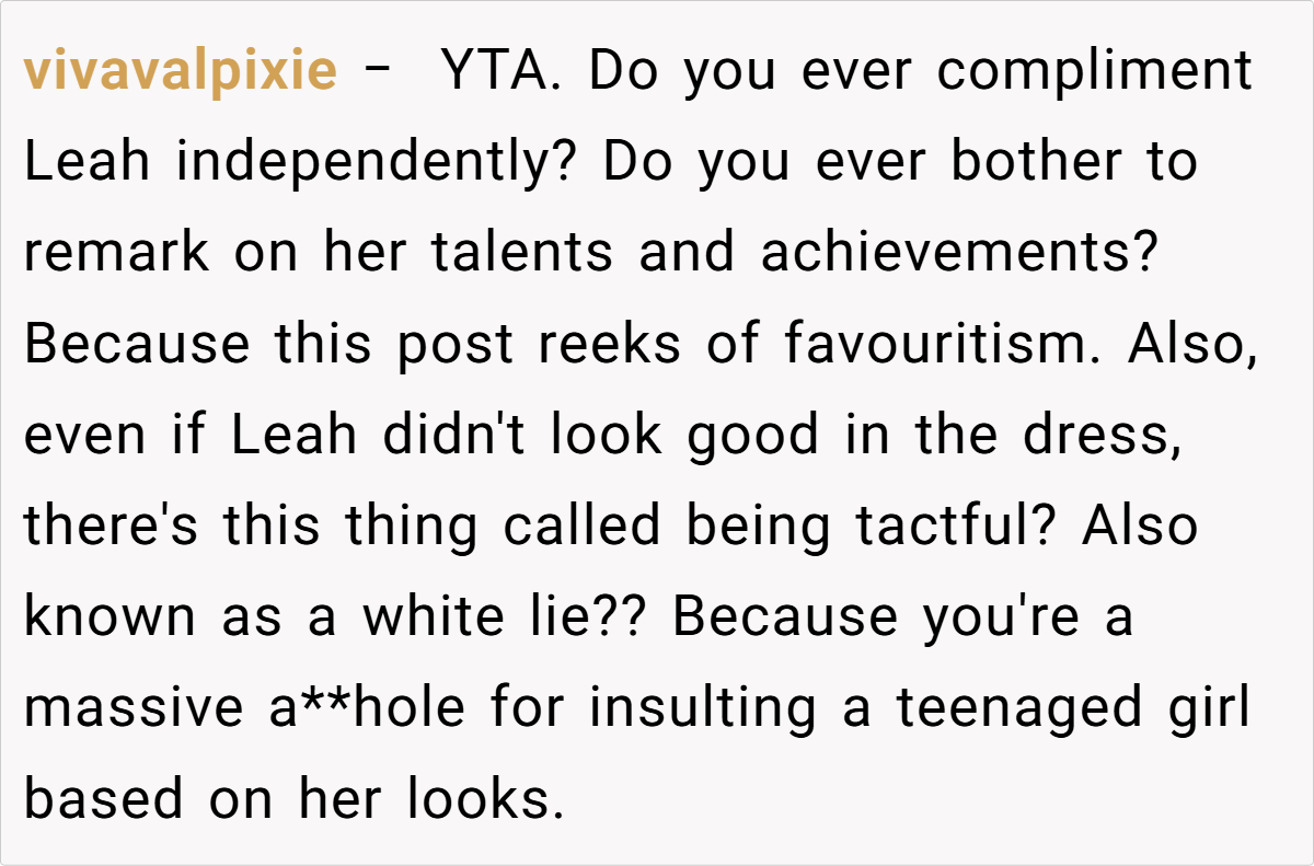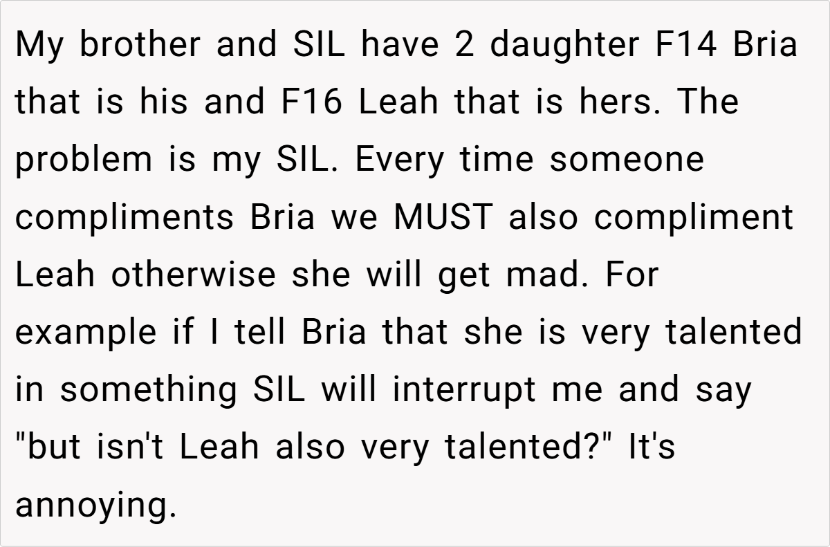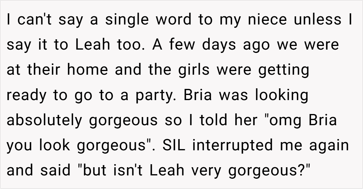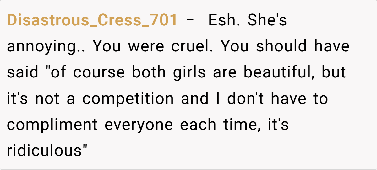 Letting your words speak honestly in a family setting can feel like walking on a tightrope. In this case, the OP’s frustration with having to compliment both stepdaughters highlights a larger issue: the pressure to conform to an arbitrary standard of equality in personal interactions. When genuine admiration for one person is automatically extended to another, it can dilute the sincerity of the compliment and create unintended harm.
